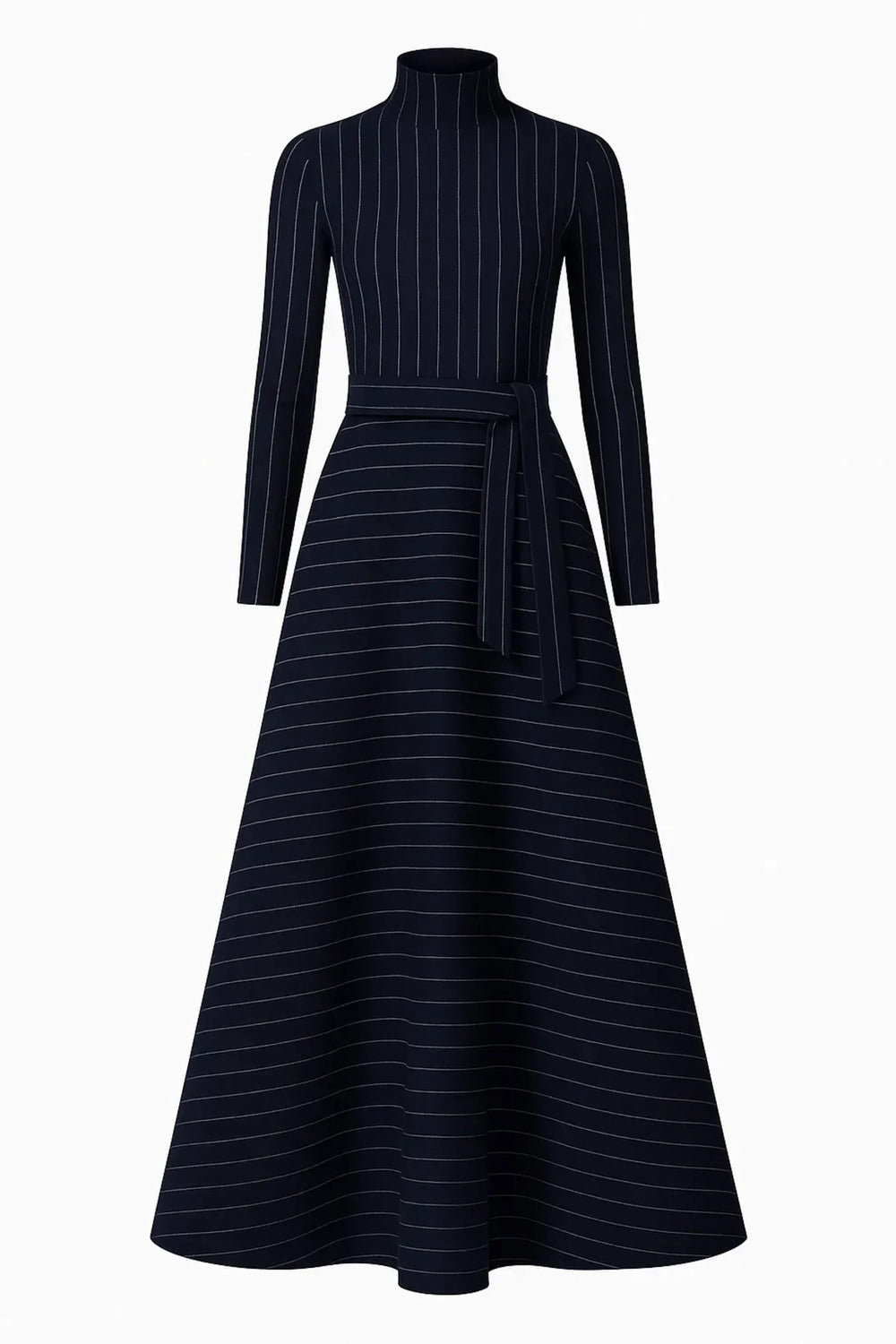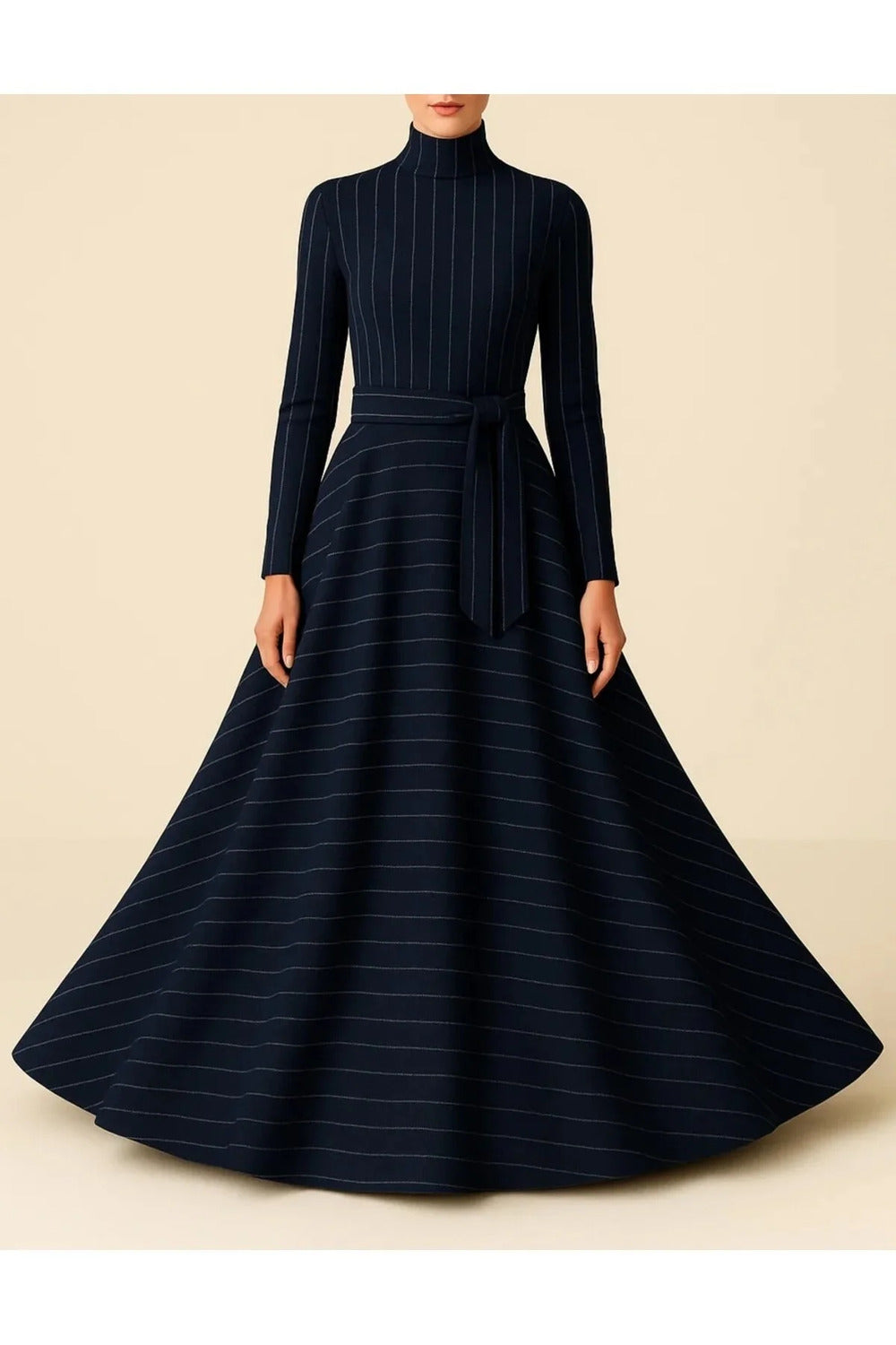 Uzun Kollu Lacivert Üzeri Çizgili Desenli Maxi Elbise
