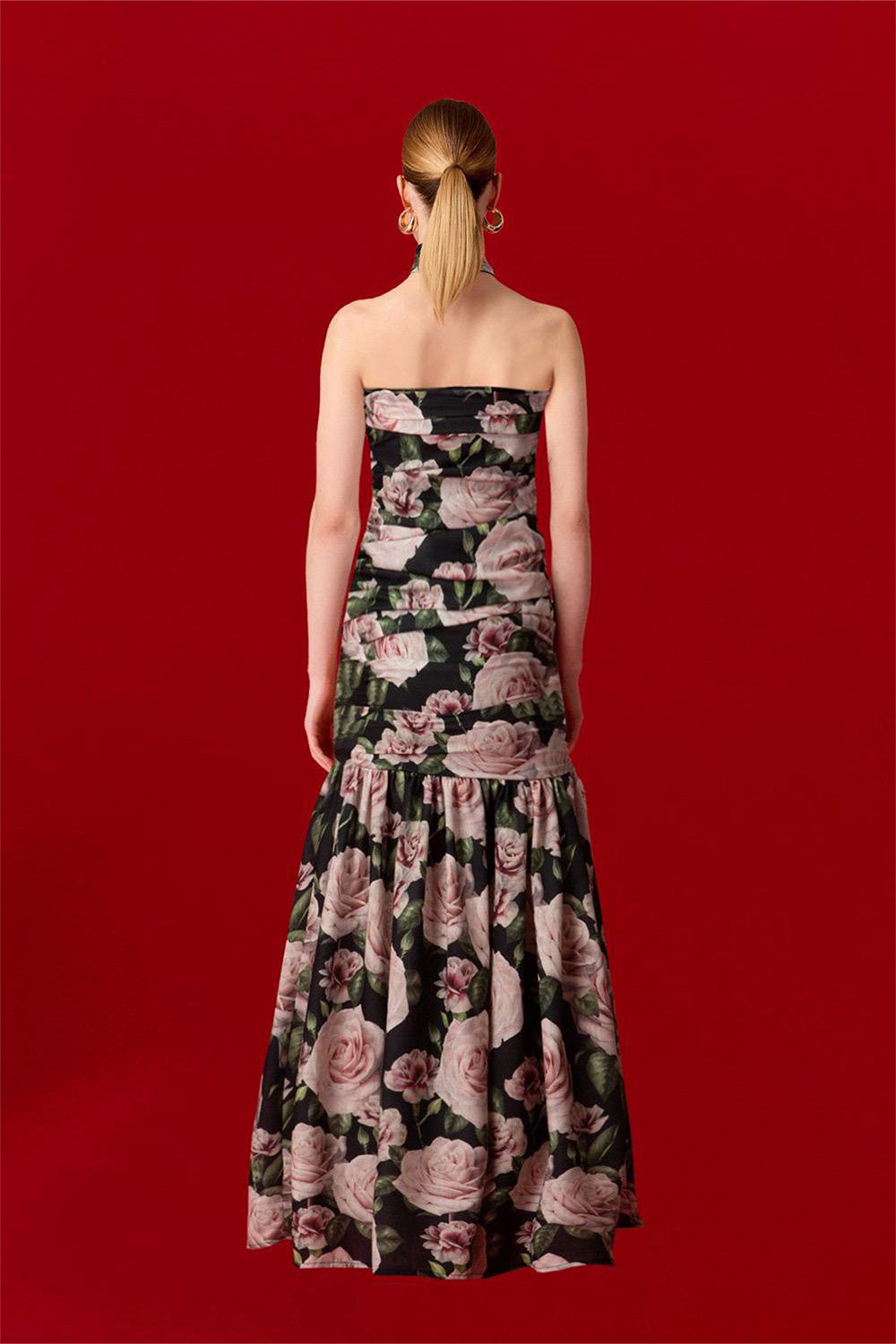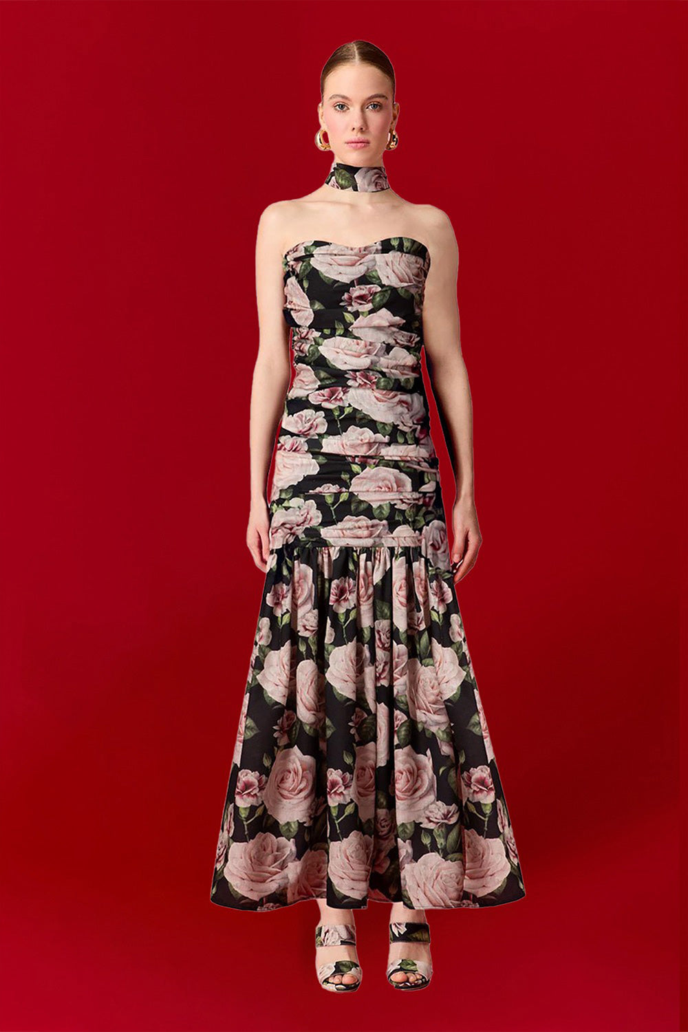 - Göğüs kısmında büzgü detayları bulunan straplez kesimi, feminen ve şık bir görünüm sunar. Belden aşağıya doğru genişleyen midi etek, hareket özgürlüğü ve zarafet katıyor.