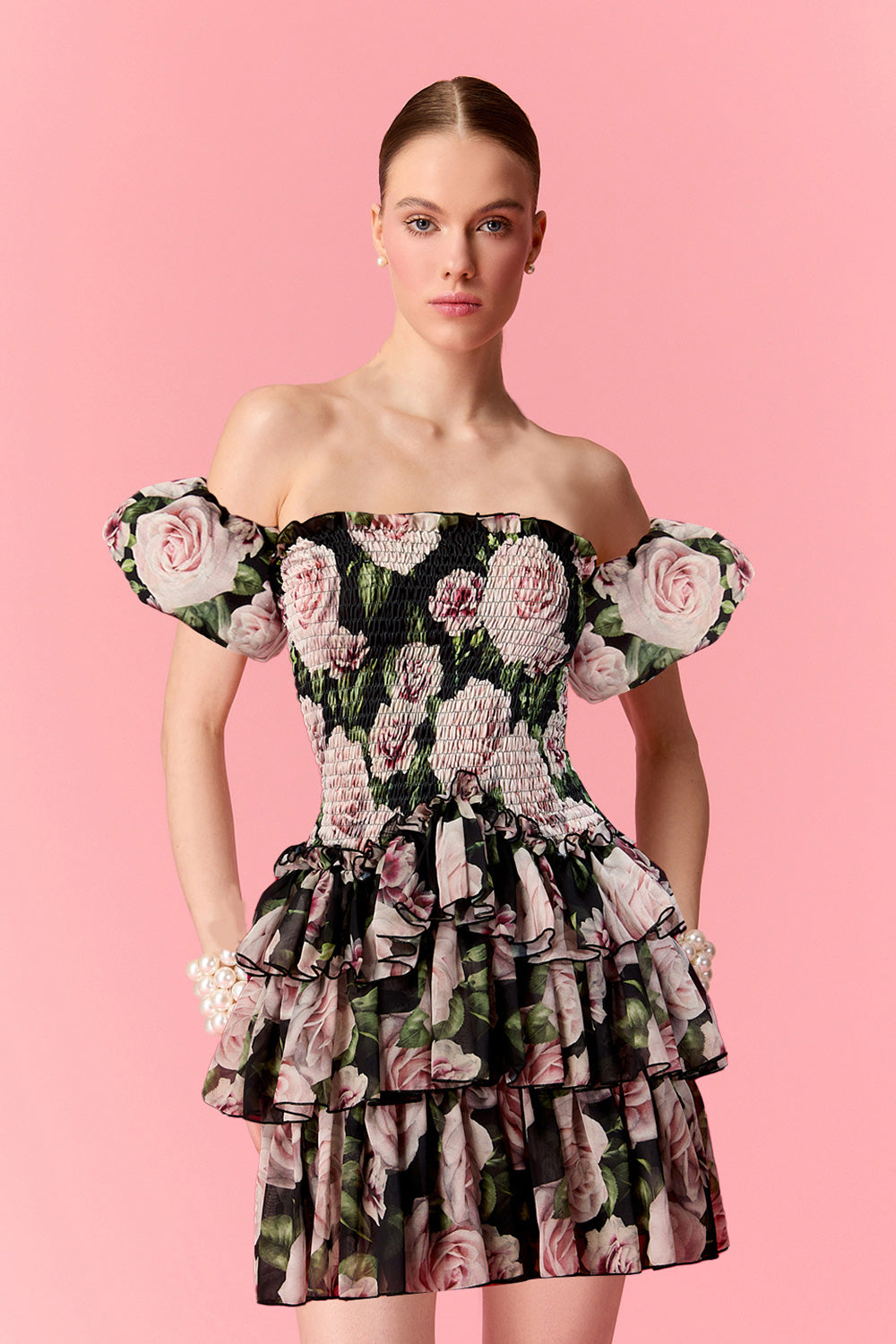 - Omzu açık tasarım, şık balon kollar ve volanlı etek detayıyla modern bir silüet sunarken esnek büzgülü gövde kısmı rahat bir oturuş ve şık bir uyum sağlar.