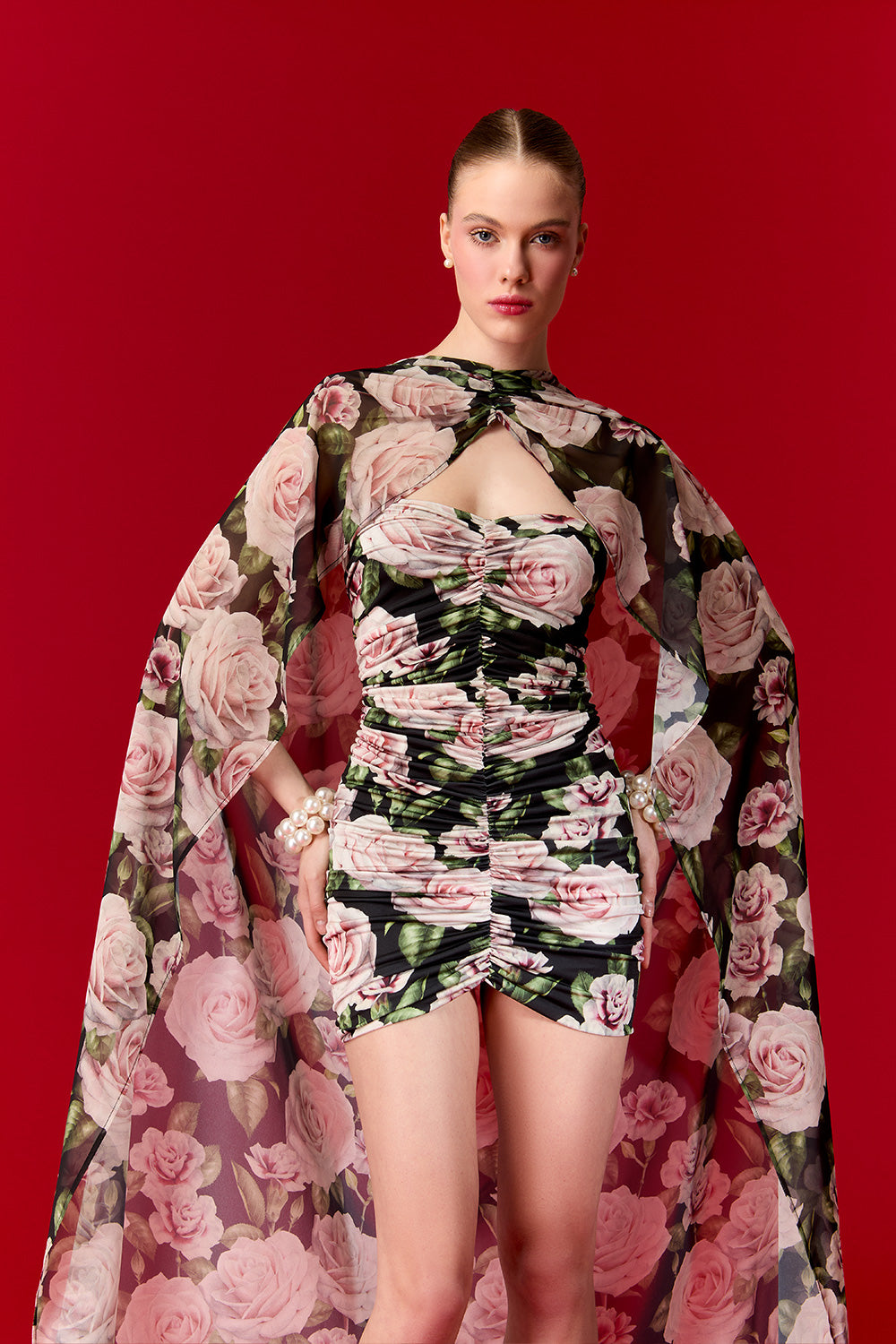 - Straplez yaka kesimiyle vücudu saran drapeli mini elbise, feminen bir siluet oluştururken çıkarılabilir uzun şifon peleriniyle iki farklı tarz yaratmanıza olanak tanır.