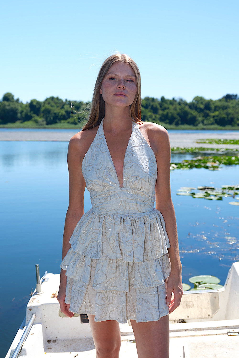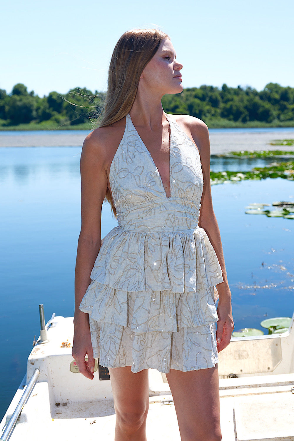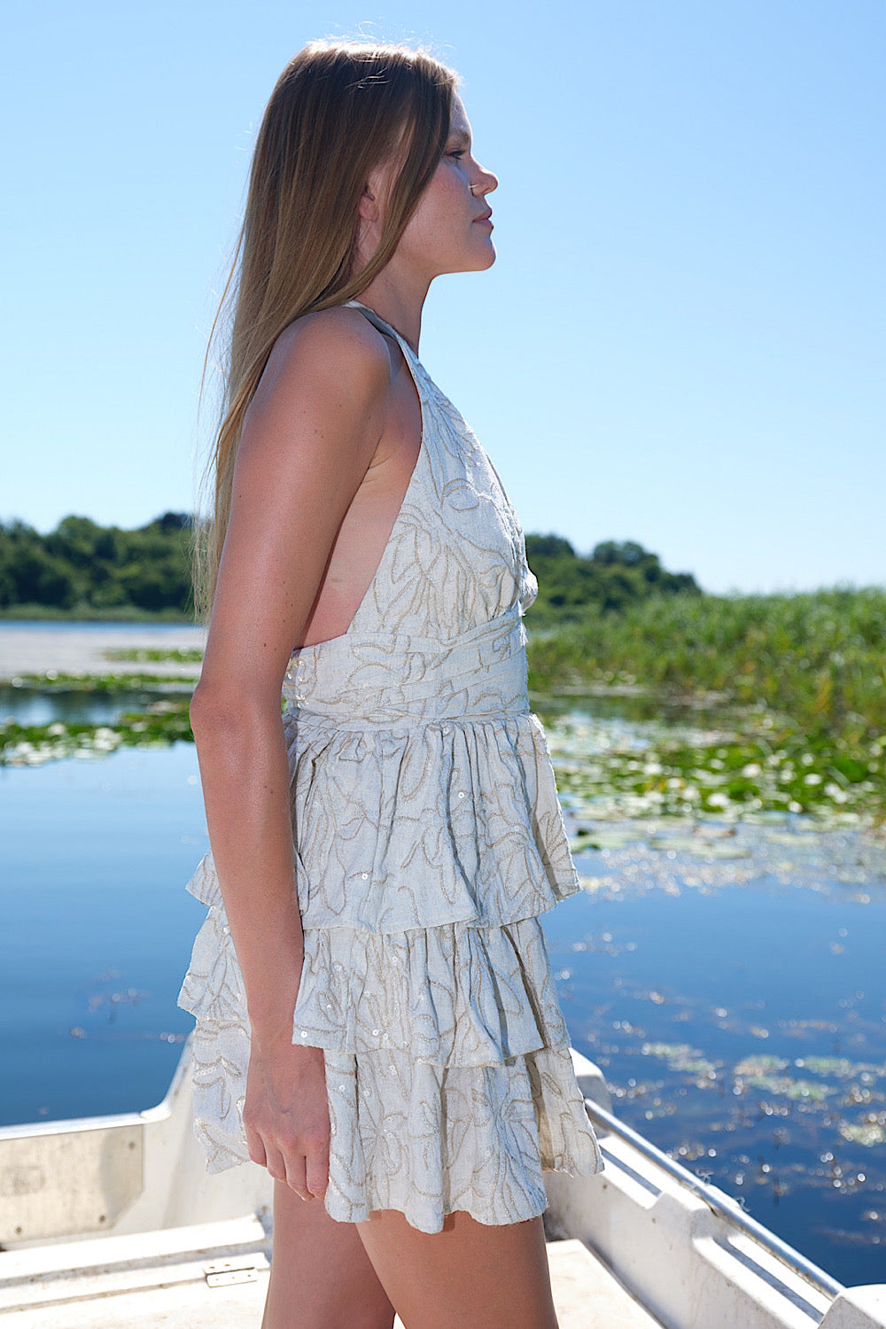 Mini Beyaz Gold Detaylı Fırfırlı Elbise
