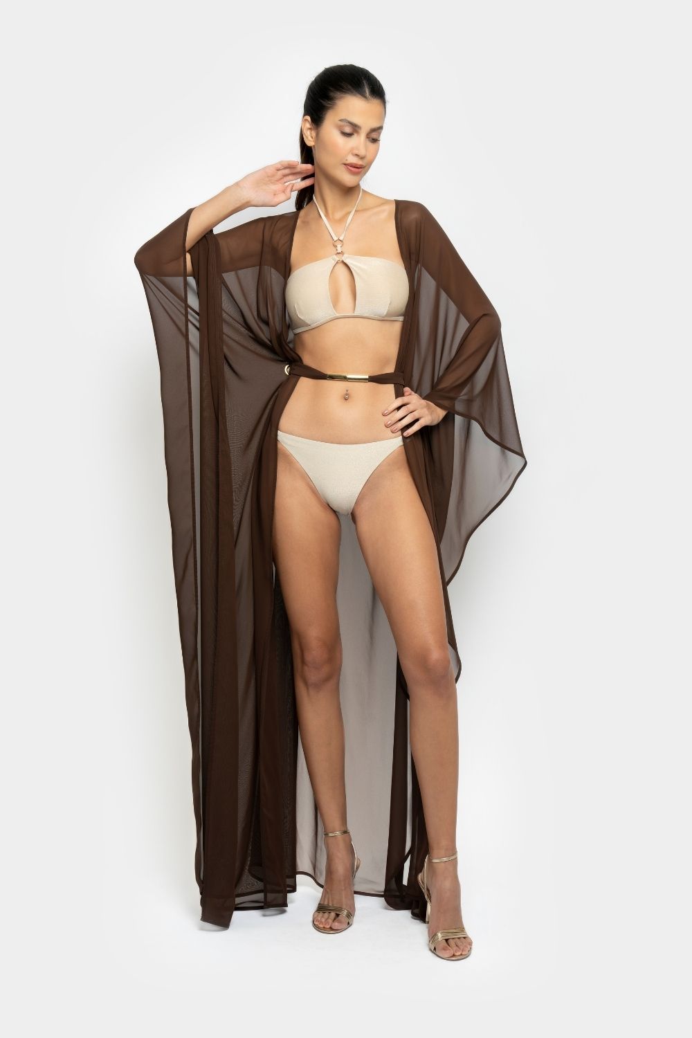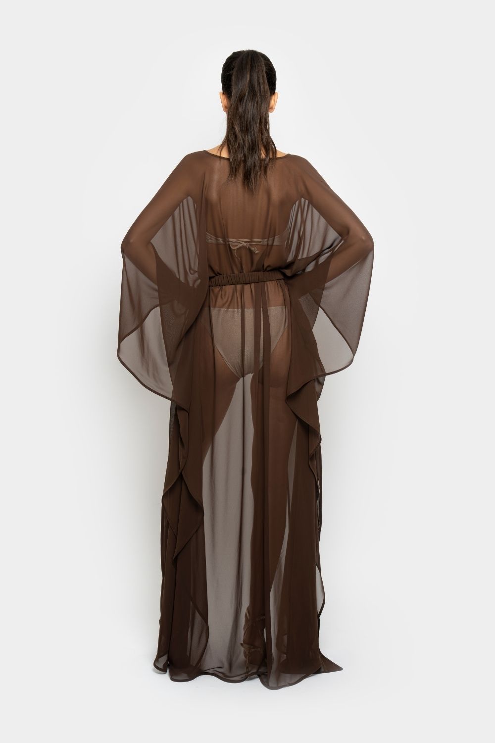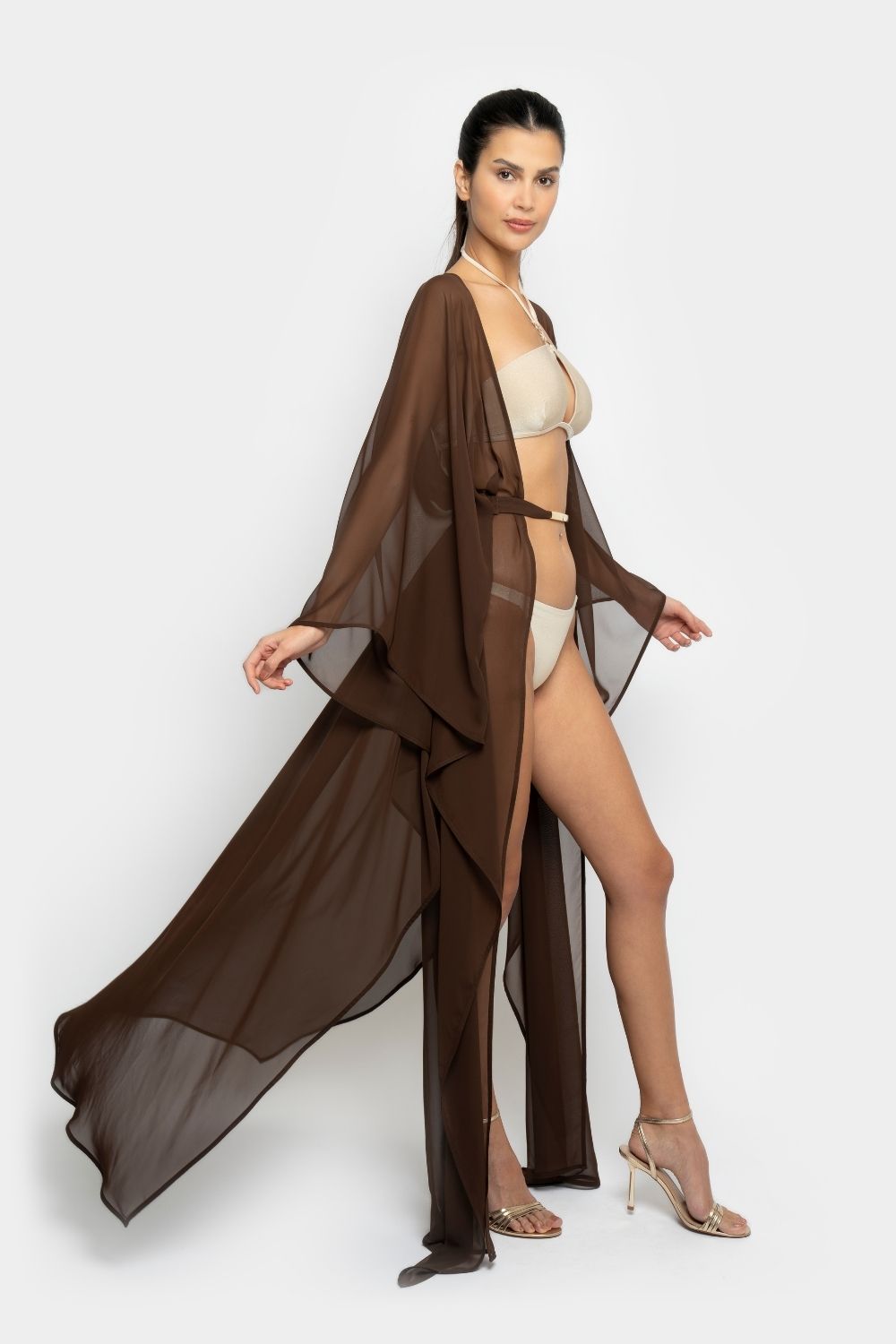 İnce ve akışkan şifon kumaşıyla tasarlanan bu uzun kimono,