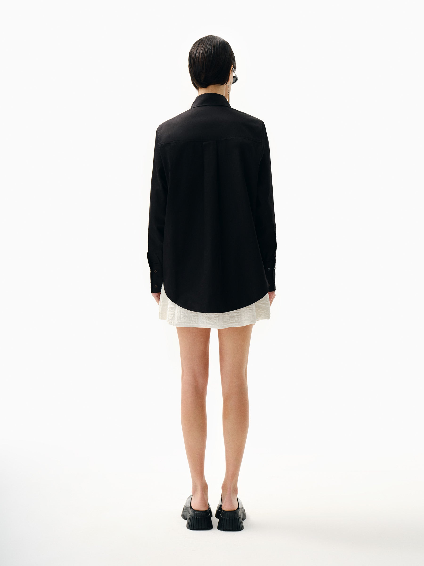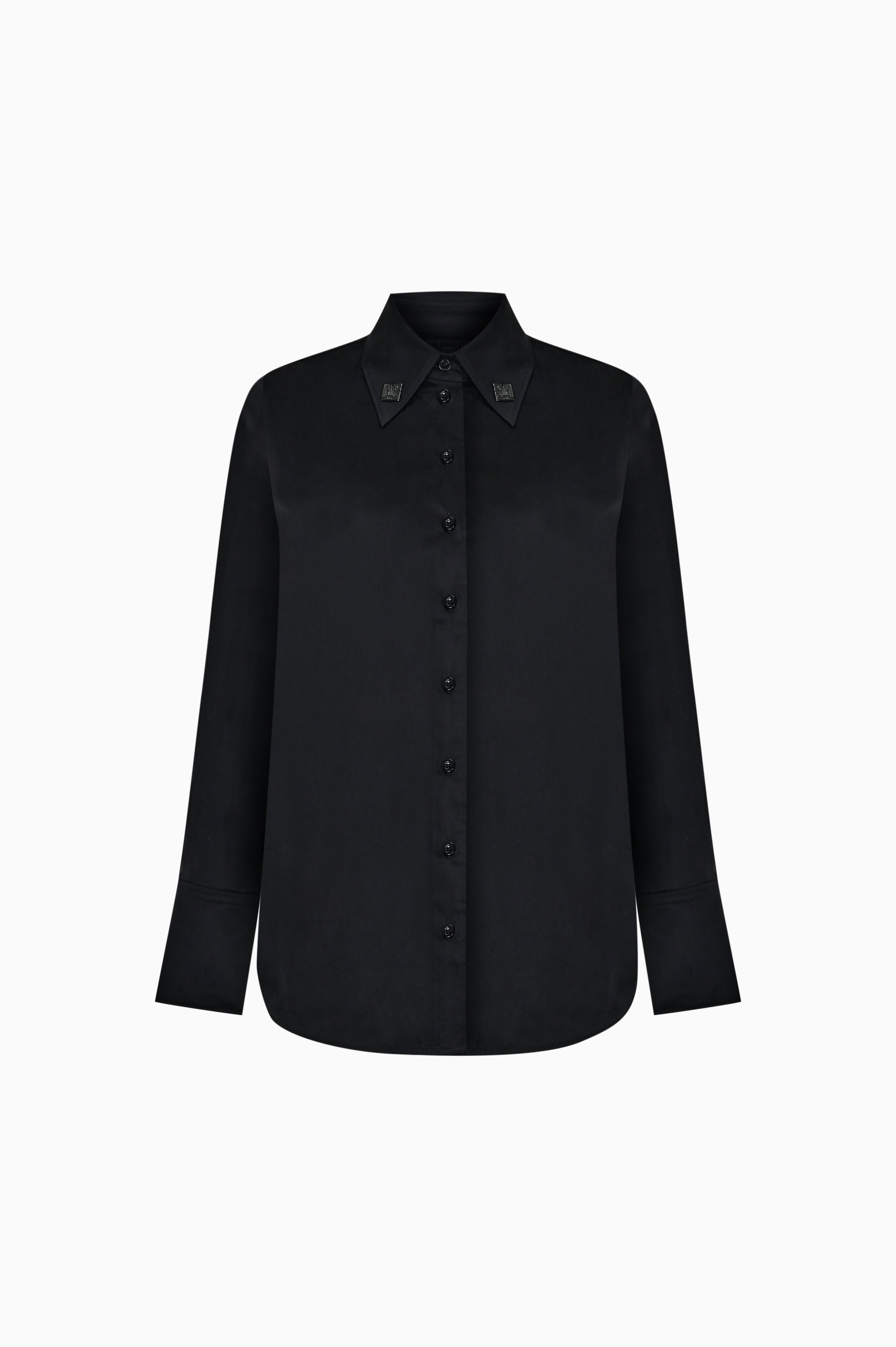 Uzun kollu, dik yakalı, metal logo aksesuarlı, siyah, geniş kesim poplin gömlek.