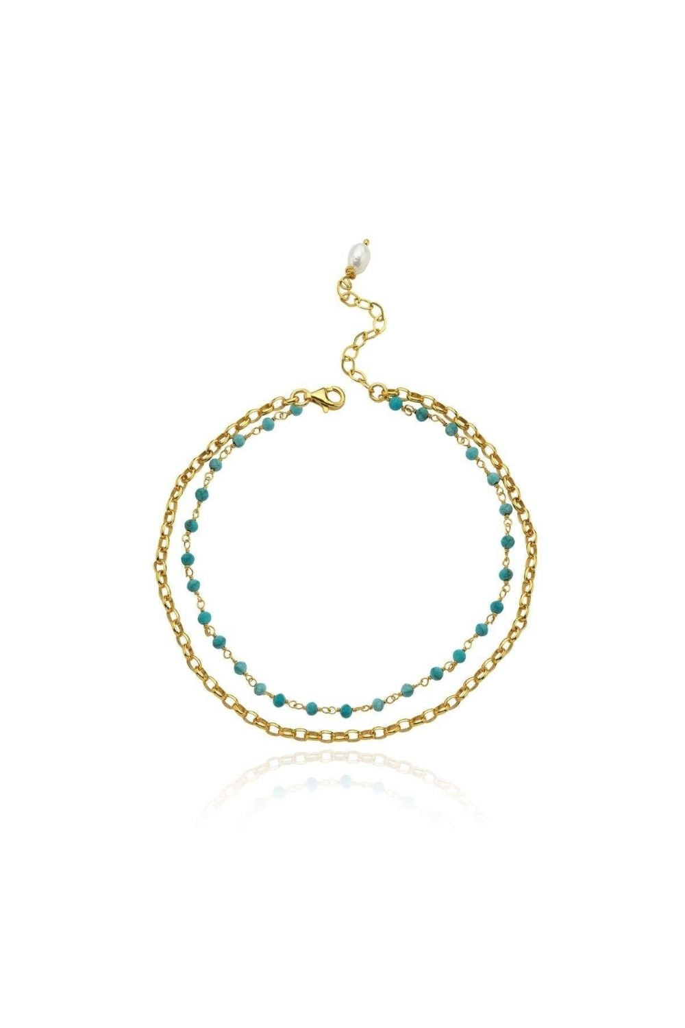 Yazın canlılığını ve zarafetini yansıtan bu zincir detaylı turkuaz taşlı halhal, yeni koleksiyonunuzu tamamlayacak şıklıkta bir aksesuar. Doğal turkuaz taşlarının serin ve ferahlatıcı tonları, her adımda sizi yazın enerjisiyle buluşturacak. Zincir detayları ise halhalı modern ve zarif bir hava katarken, herhangi bir kıyafeti tamamlayıcı bir parça haline getiriyor. Yazın tüm renkleriyle uyumlu olan bu halhal, plaj günlerinden şehir gezmelerine kadar her ortamda tarzınızı tamamlayacak.