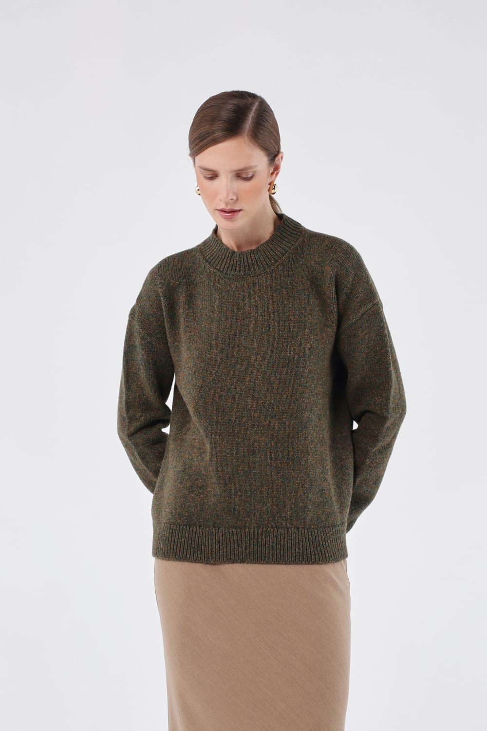 Klasik bisiklet yaka ve rahat kesimi sayesinde zamansız ve çok yönlü bir kullanım sunar; ister tek başına, ister katmanlayarak kombinleyebilirsiniz. Ribanalı manşetler ve etek ucu, kazak yapısını korurken vücuda oturan sıkı ve rahat bir uyum sağlar.