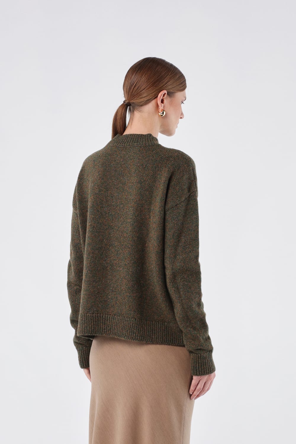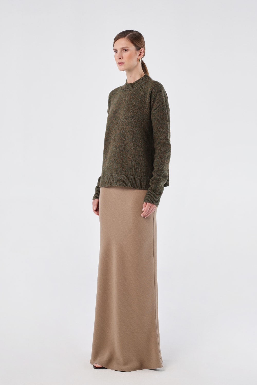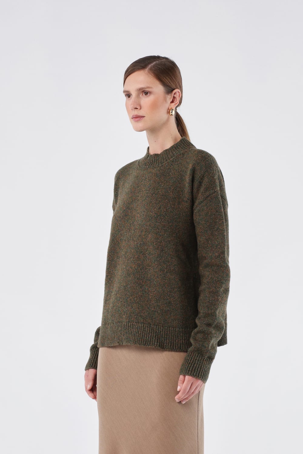Lüks alpaka karışımından üretilen bu kazak, üstün sıcaklık sağlar ve son derece yumuşak, konforlu bir his sunar. Muline örgü tasarımı, kumaşa ince bir doku ve zarif bir derinlik katarak sofistike bir görünüm yaratır.
