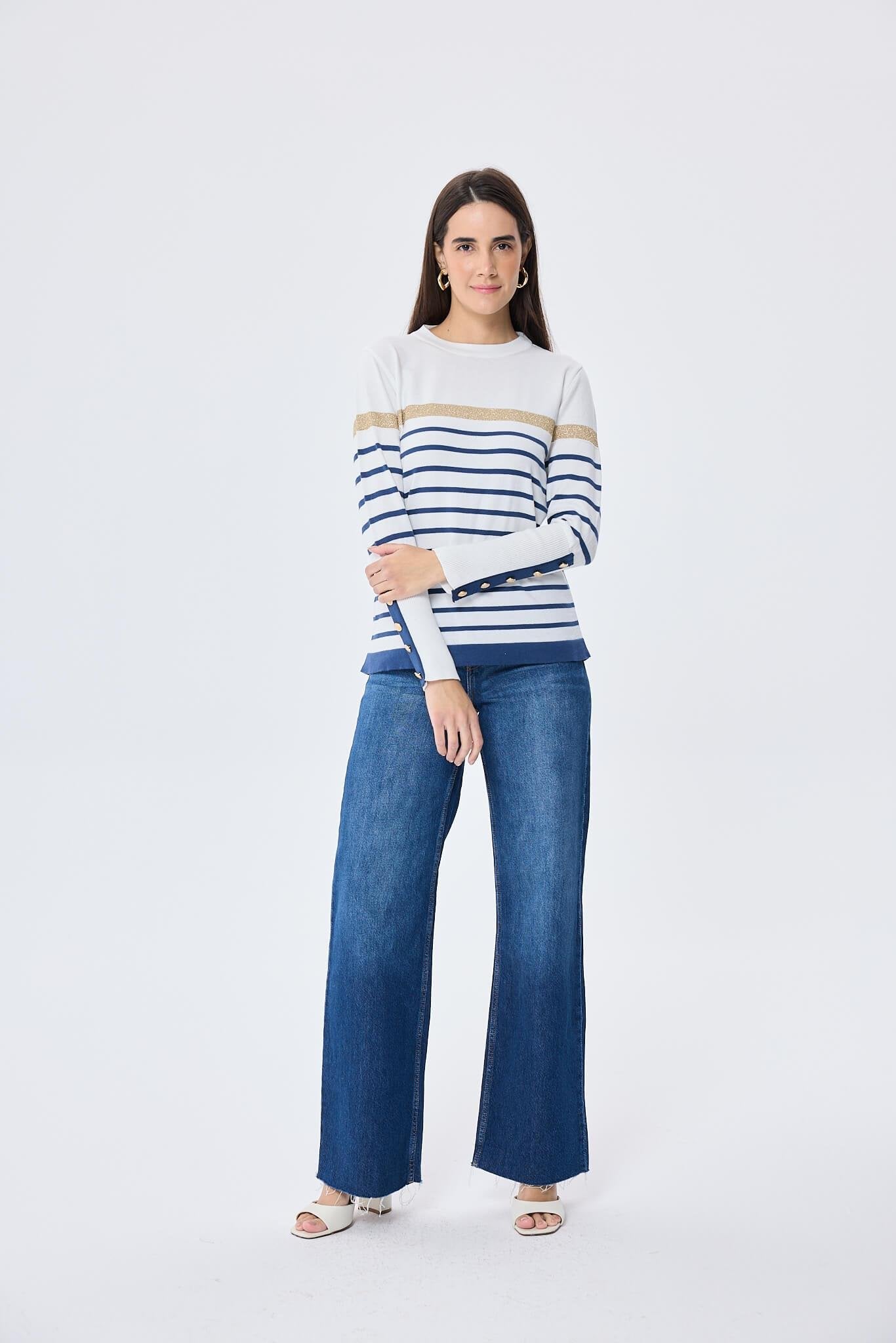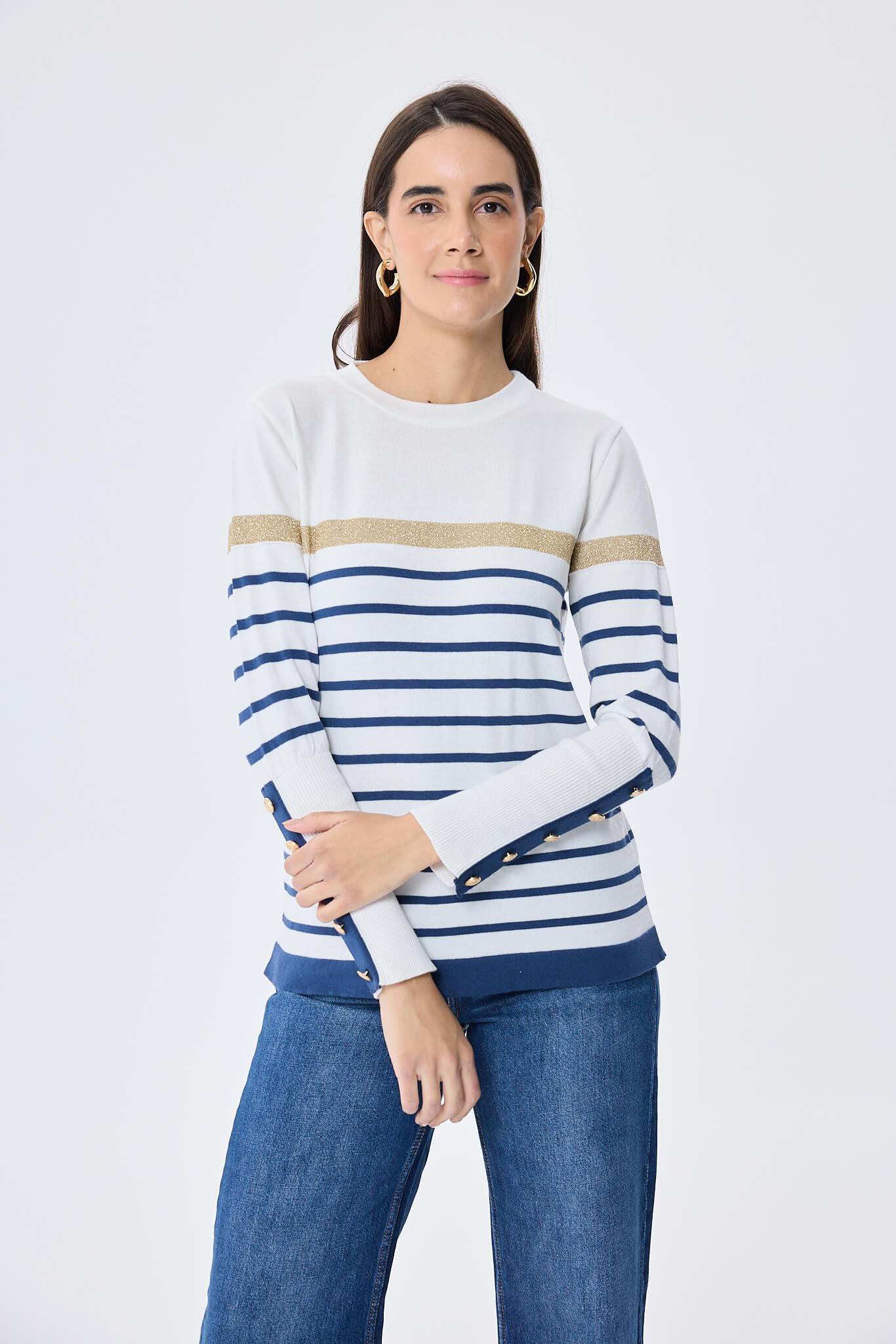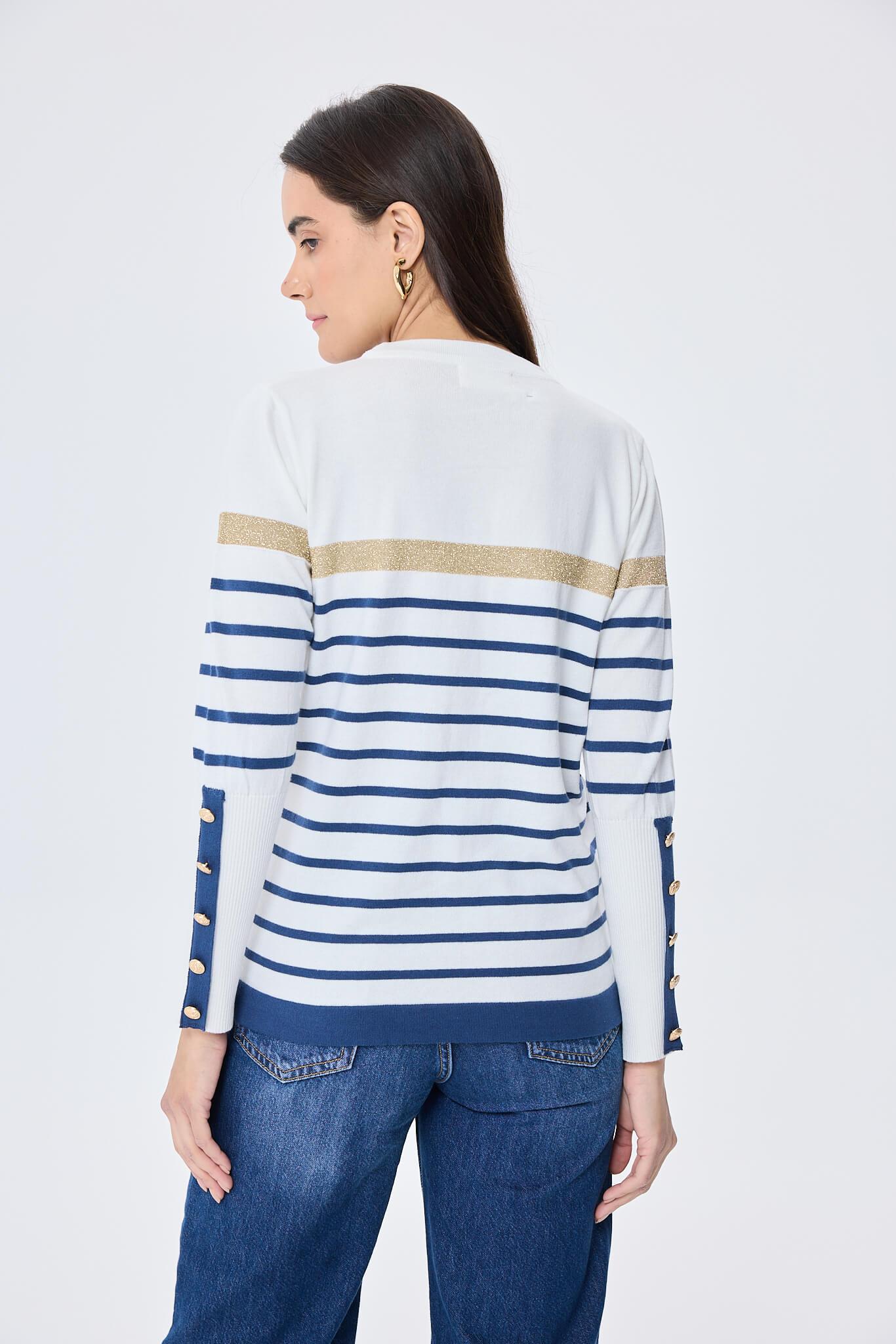 Çizgili, Kol uçları Altın Düğmeli, Standart Fit, Sıfır Yaka Kadın Triko Kazak