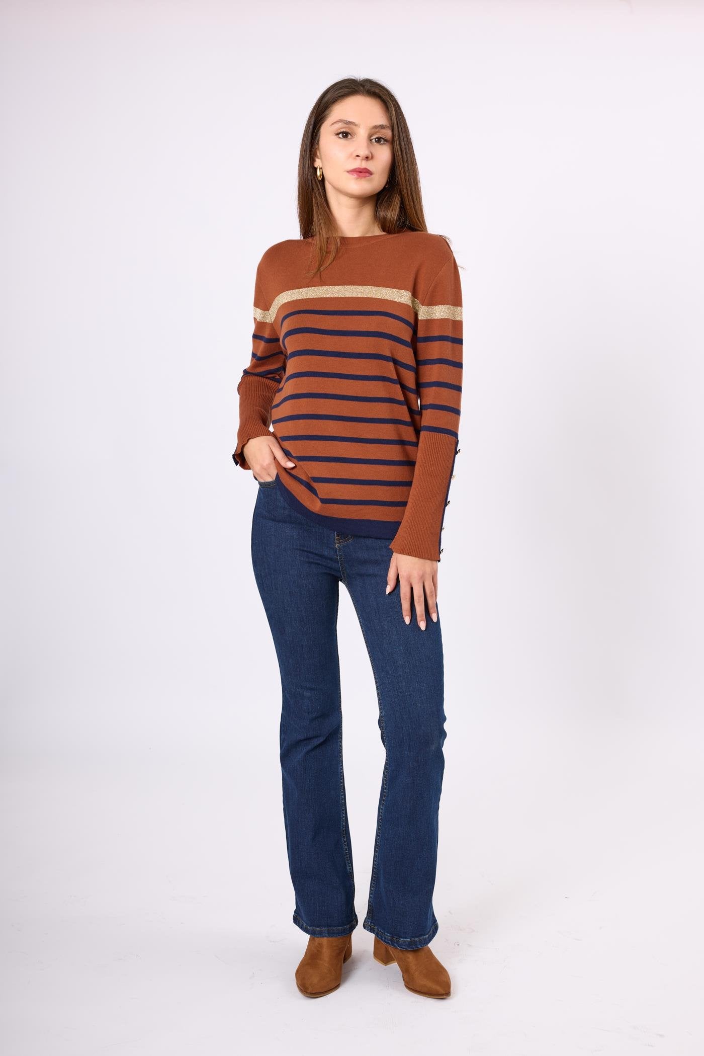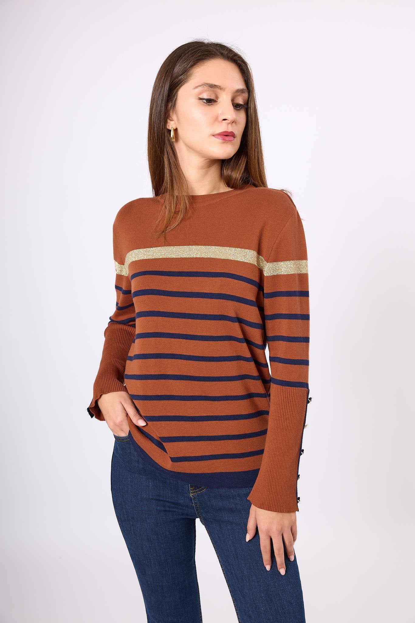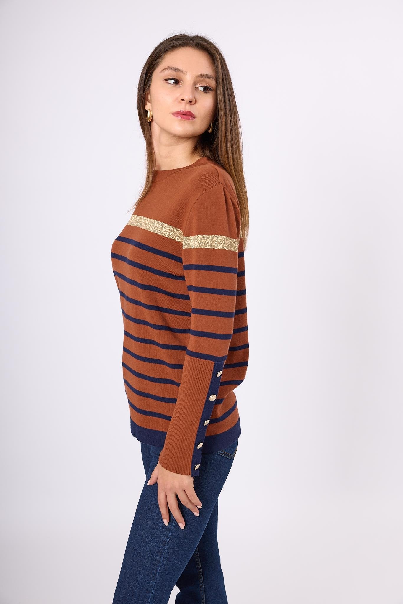 Çizgili, Kol uçları Altın Düğmeli, Standart Fit, O Yaka Kadın Triko Kazak