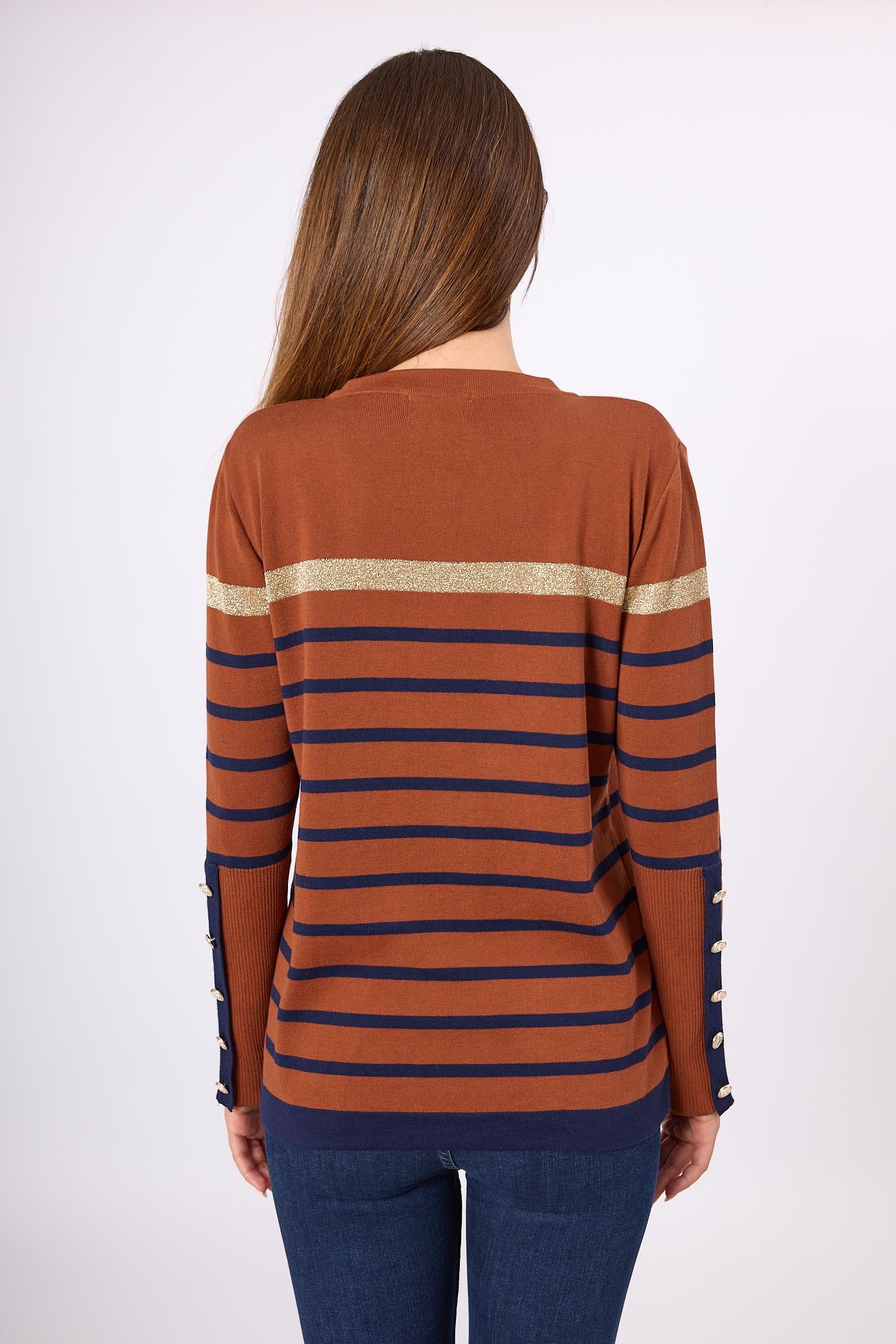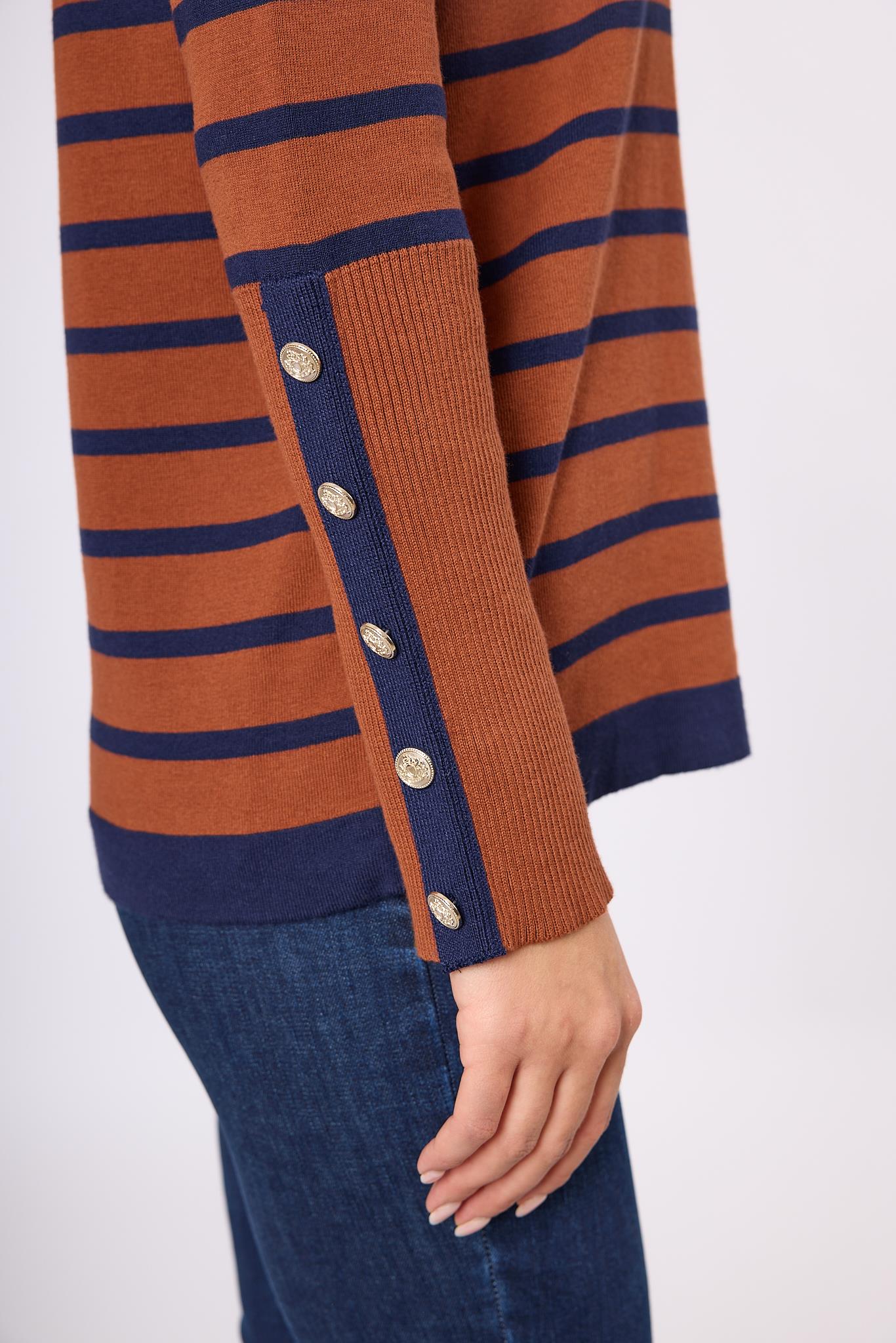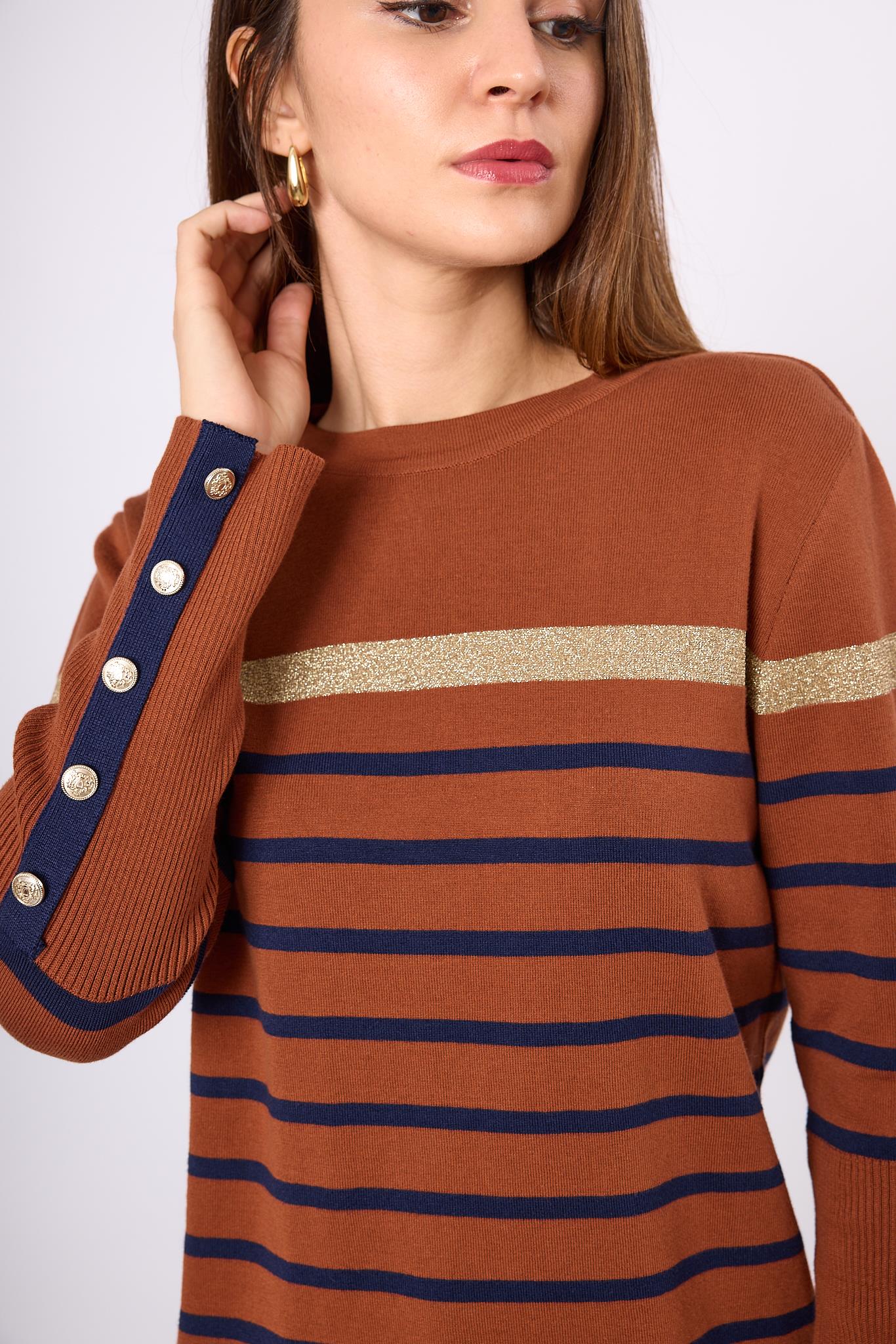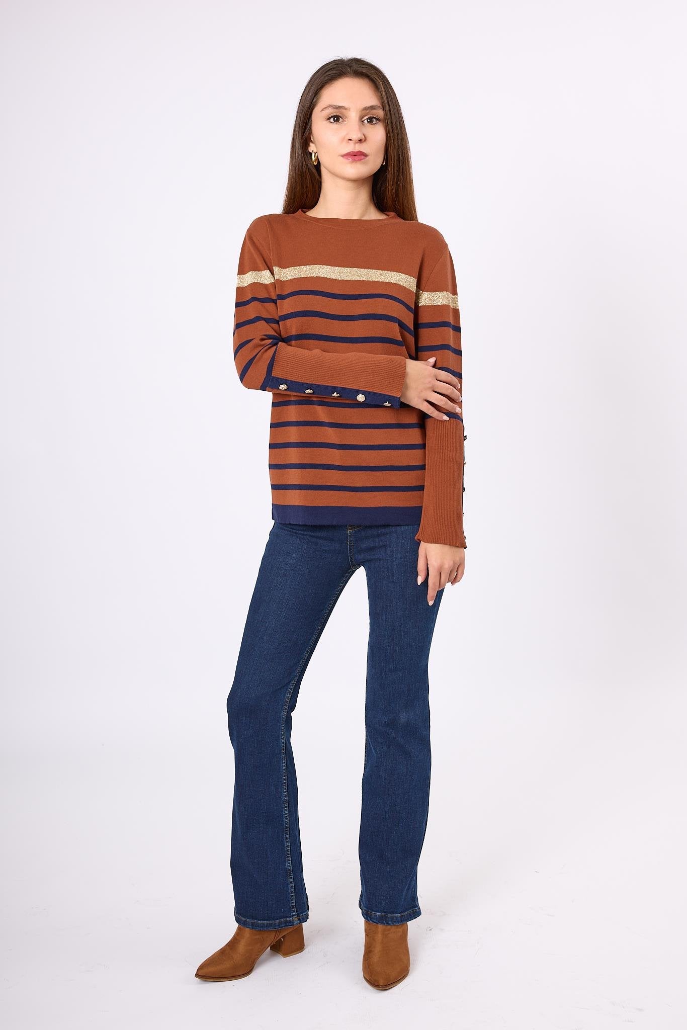 Çizgili, Kol uçları Altın Düğmeli, Standart Fit, O Yaka Kadın Triko Kazak