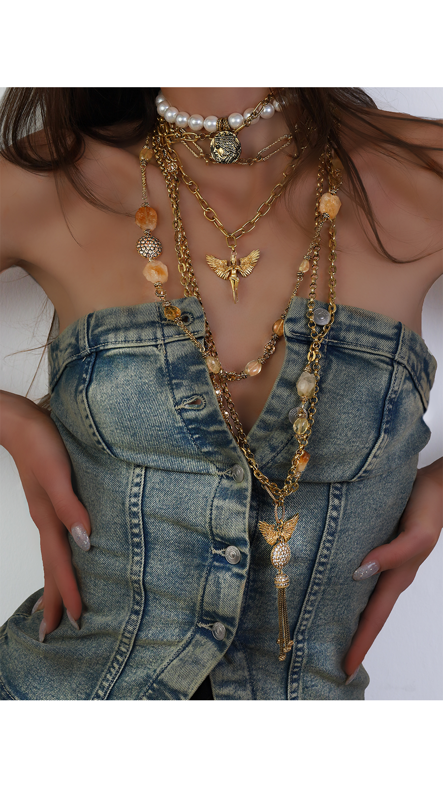 70 cm uzunluğundaki MIEL Altın Kaplama Kolye, 22 ayar altın kaplama pirinç zinciri üzerine yerleştirilmiş sitrin taşlarının parıltısıyla dikkat çeker. Her bir sitrin, güneşin sonsuz enerjisini yansıtırken, eşsiz formuyla benzersiz bir karakter sergiler. Kolyede yer alan yuvarlak sembol, üzerinde titizlikle düzenlenmiş kristal taşlarla süslenmiş olup, bu kolyeyi sadece bir aksesuar olmaktan çıkarıp, bir sanat eserine dönüştürür. Işıltılı ve göz alıcı MIEL Altın Kaplama Kolye, özel günlerde olduğu kadar günlük kullanımda da sahibinin içindeki ışığı dış dünyaya taşımasını sağlayacak bir mücevherdir.