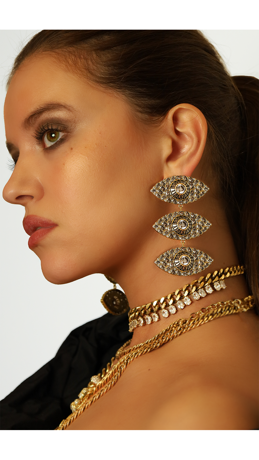 AFRODIT Göz Küpe, Bayemeyc'in ruhunu ve mistik sembollerini cesurca taşıyan eşsiz bir tasarım. Bu küpe, mitolojide güzellik ve aşk tanrıçası Afrodit'ten ilham alınarak tasarlanmış. Üç göz sembolünün alt alta sıralanmasıyla oluşan bu küpe, sıradanlıktan uzak, güçlü bir ifade ve duruş sergiliyor. Göz sembolleri, insanın içsel derinliğini, bilgelik ve koruyuculuğu simgeler. AFRODIT Göz Küpe'nin göz sembollerinin üzerindeki kristal taşlar, özgün bir dağınıklık içinde yerleştirilmiş ve her taş, sembole dinamik bir ışıltı katıyor. Taşların rastgele yerleştirilmesi, tıpkı hayatın getirdiği karmaşa içinde bile güzelliği bulabileceğinizi hatırlatan bir mesaj taşıyor. Küpelerin her biri, gözlerin büyüleyici gücüyle birleşmiş ve kristallerin ışıltısıyla zarafeti bir araya getiriyor. Alt alta sıralanan gözler, hem stil sahibi hem de özgün olmak isteyen kadınlar için ideal bir aksesuar.
