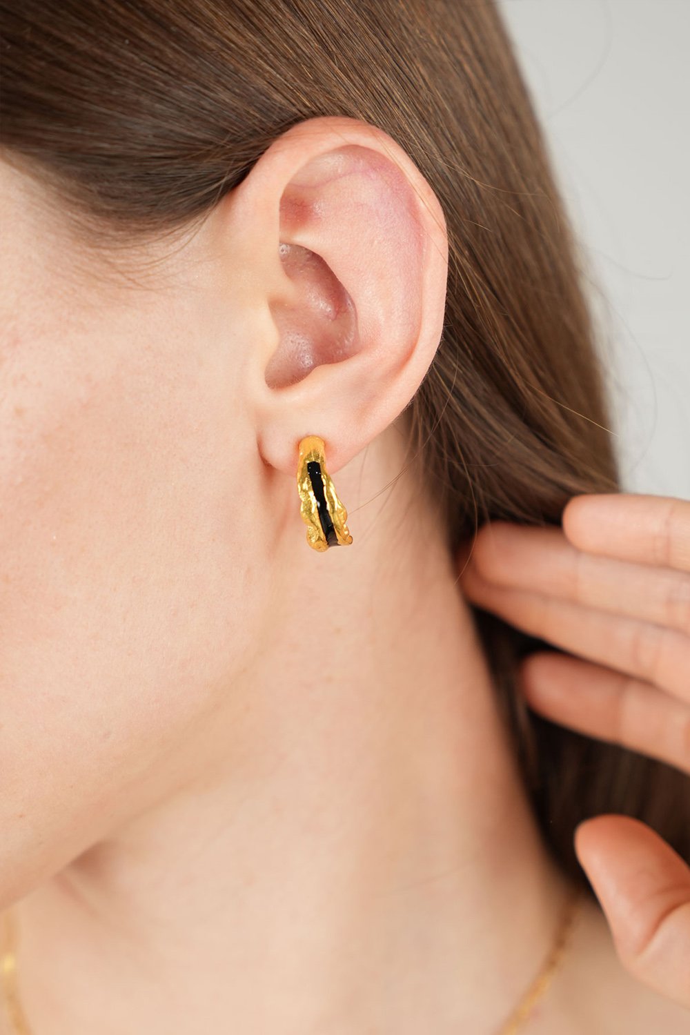 Enki Siyah Mineli Gold Küçük Halka Küpe