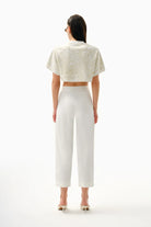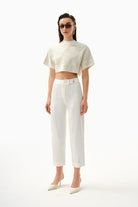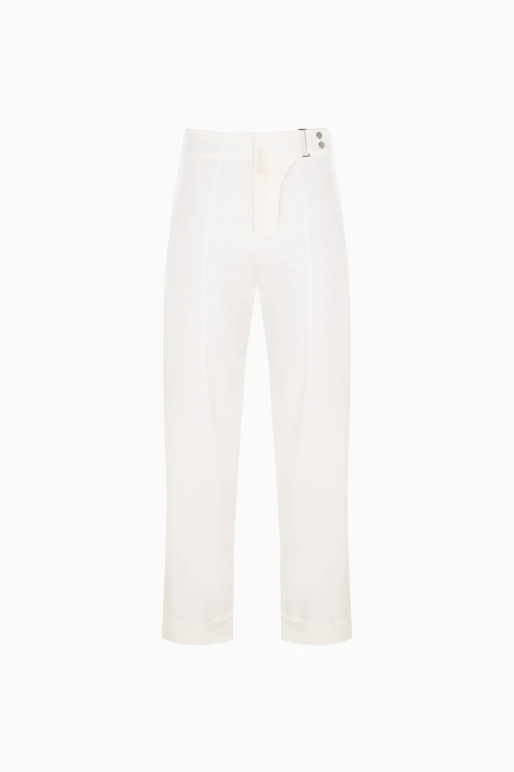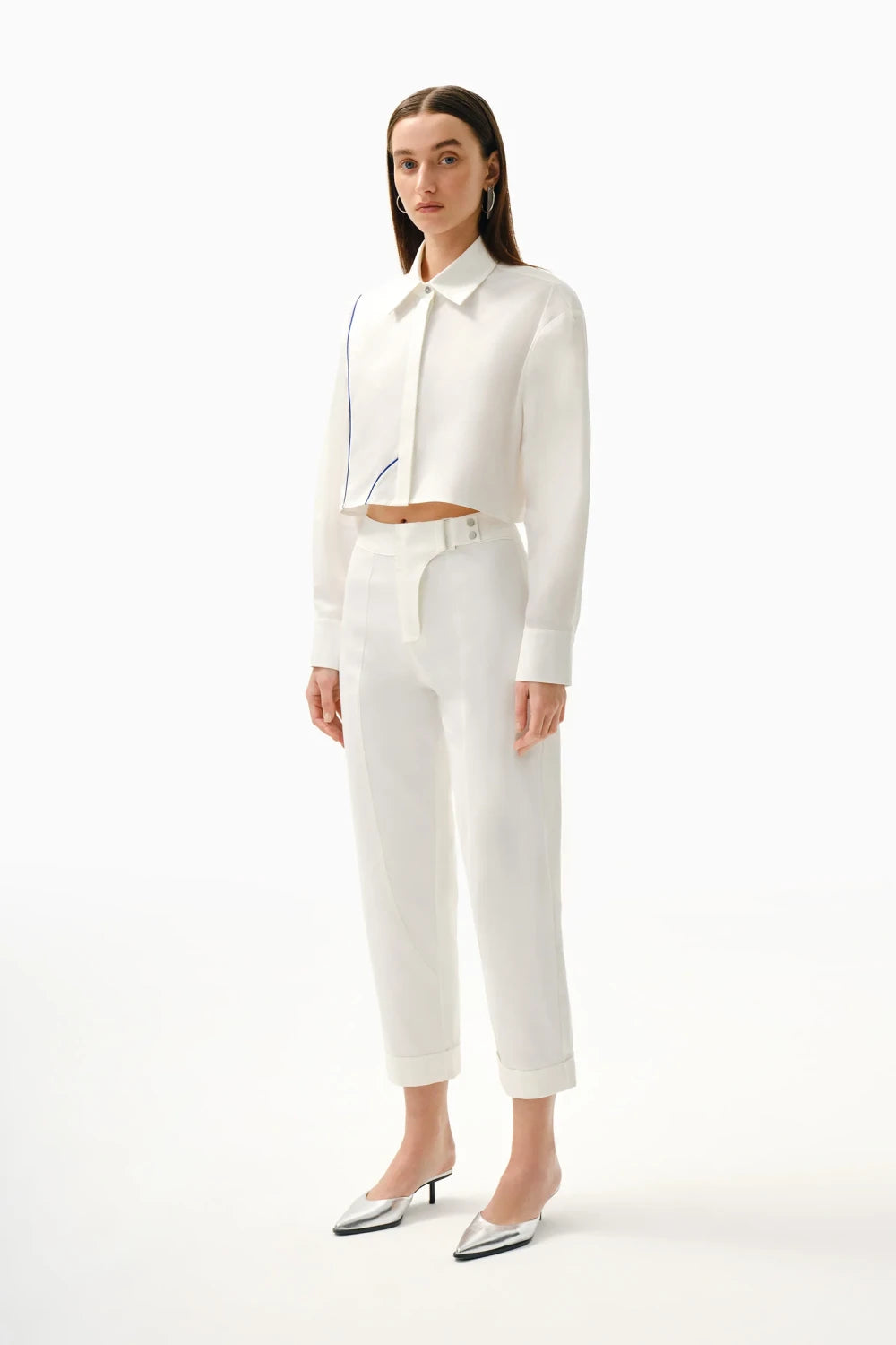 Kruvaze kemer ve logo detaylı, beyaz havuç kesim pantolon.