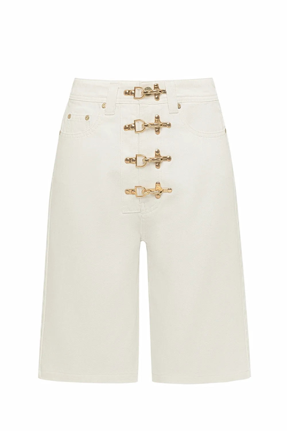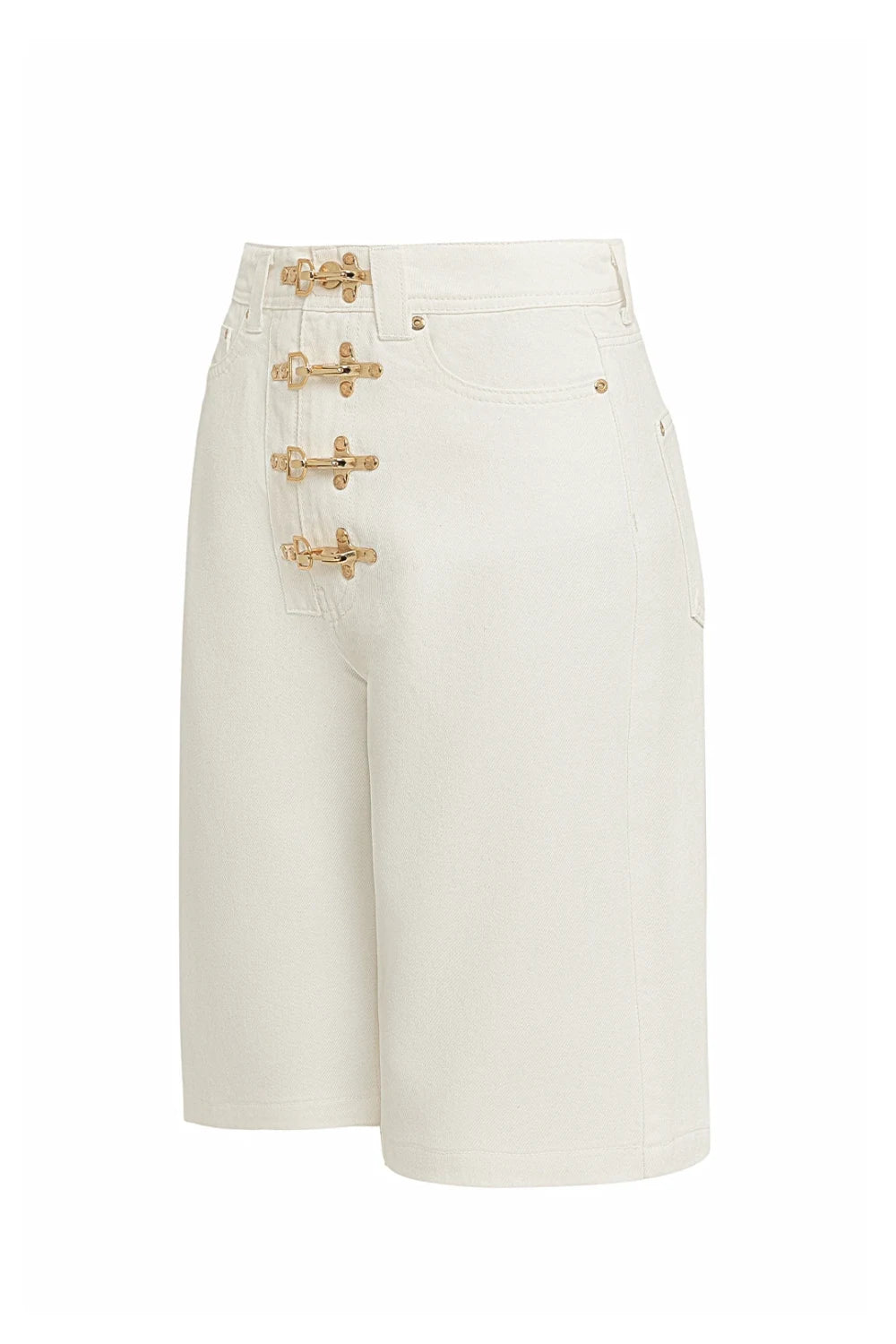 ünlük stilinize modern bir dokunuş katacak yüksek bel, gold aksesuar detaylı denim şort, feminen kesimi ve şık detaylarıyla öne çıkar. %100 pamuk (cotton) kumaşı sayesinde nefes alabilen, rahat ve dayanıklı bir kullanım sunar. Cream rengi, farklı kombinlerle kolayca uyum sağlar.