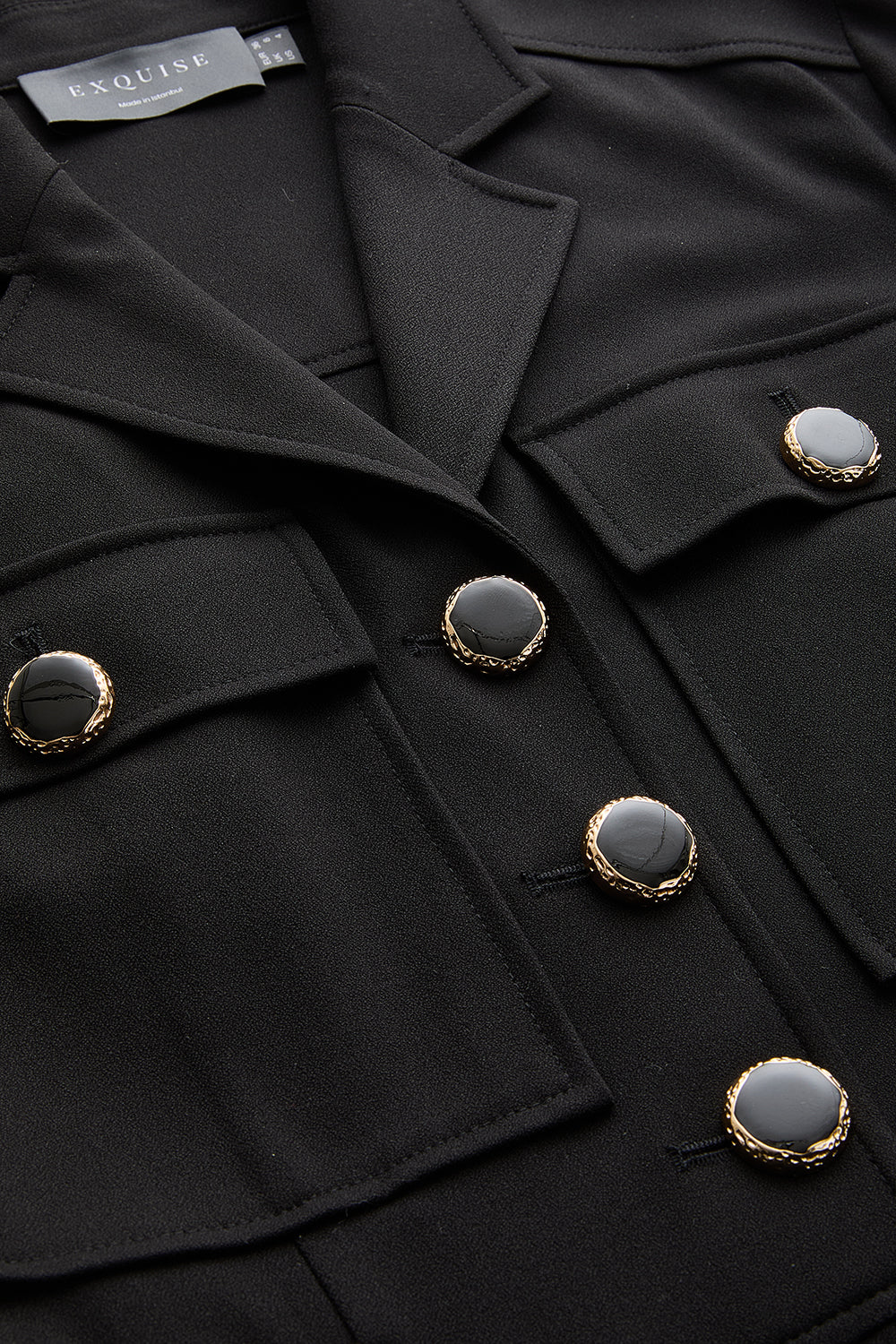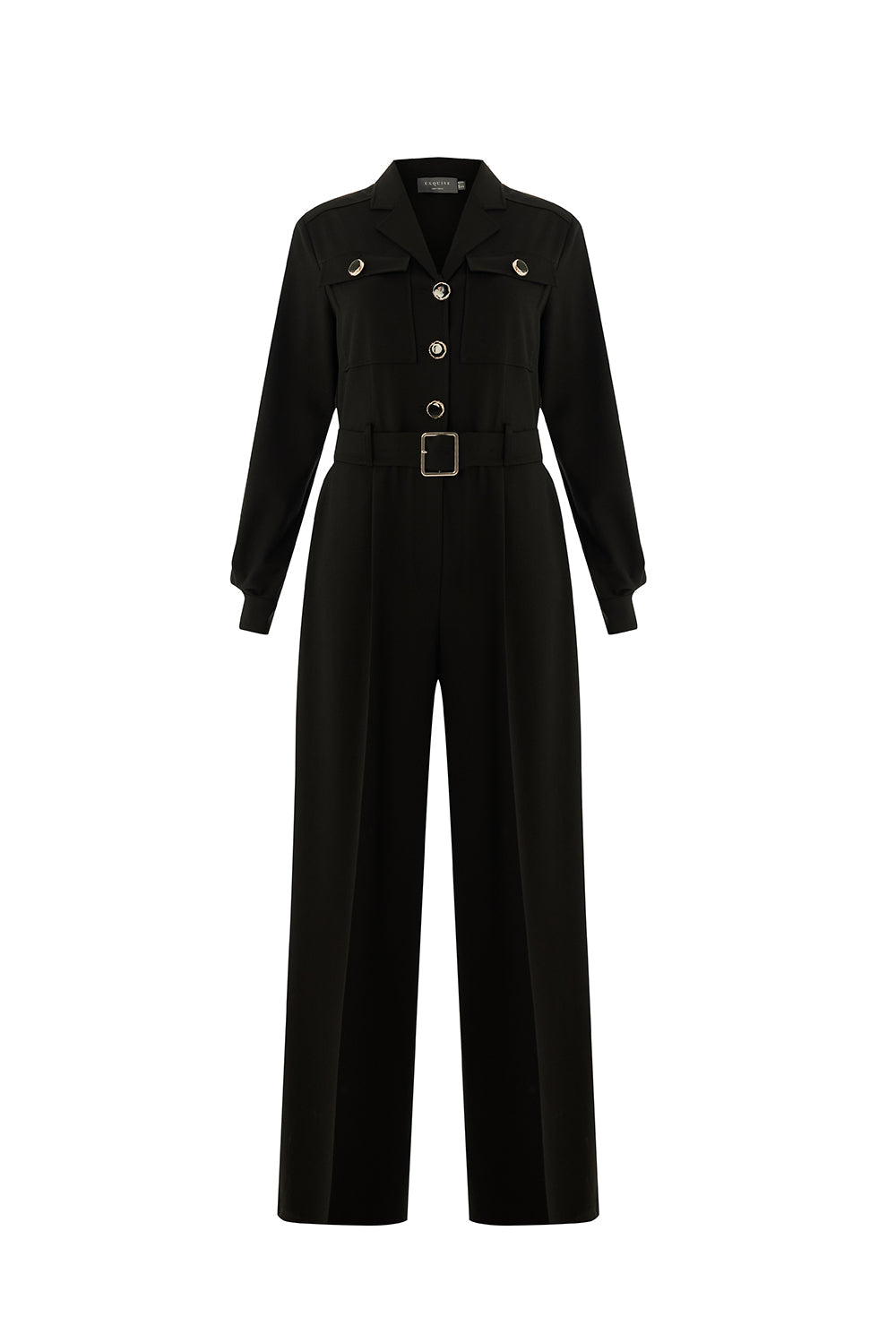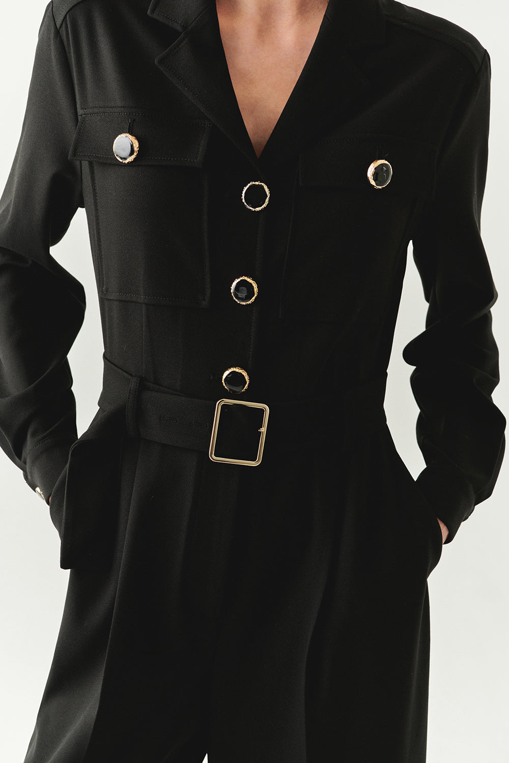 Uzun Kollu Ceket Yaka Cepli Kemerli Slim Fit Siyah Tulum