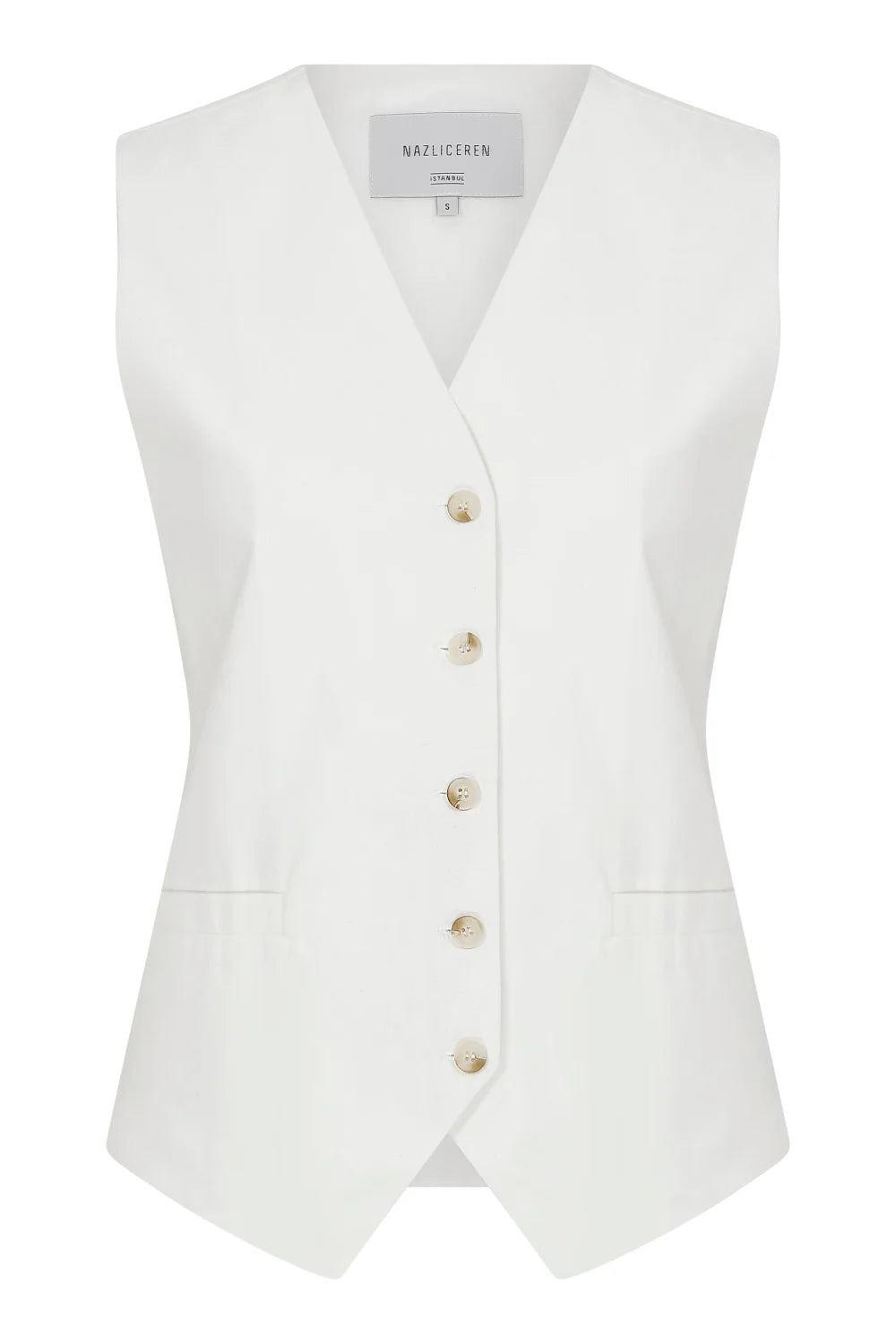 Bea yelek 1970'lerin havasını yansıtacak şekilde koton kumaştan üretmiştir. V yaka ile şekillendirilen yeleğin cepleri ve ön düğmeleri vardır.
