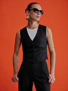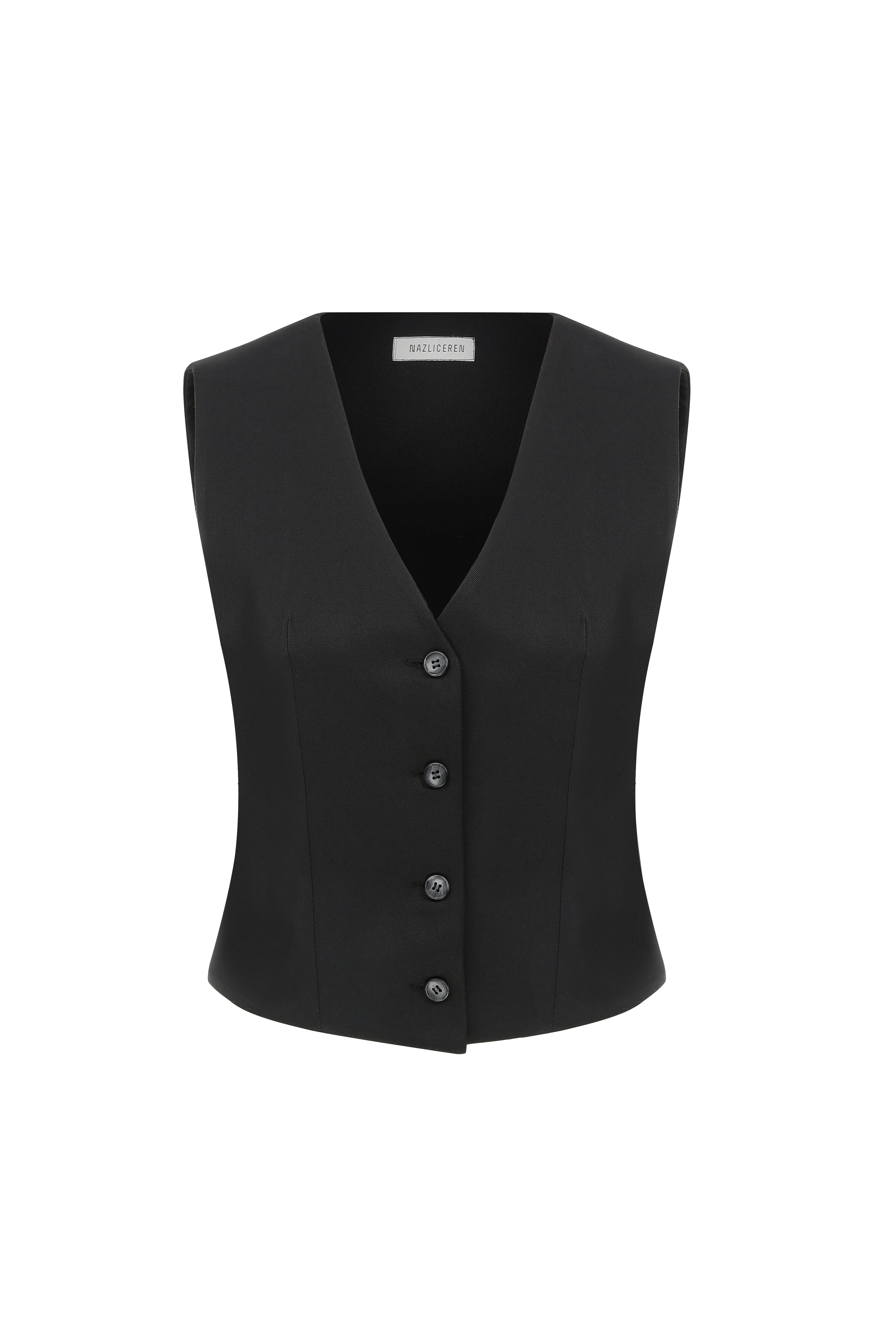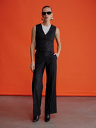 Nazlı Ceren, ayarlanabilir sırt askılı Brita yeleği yaratırken androjen takım elbiselerden ilham alıyor.