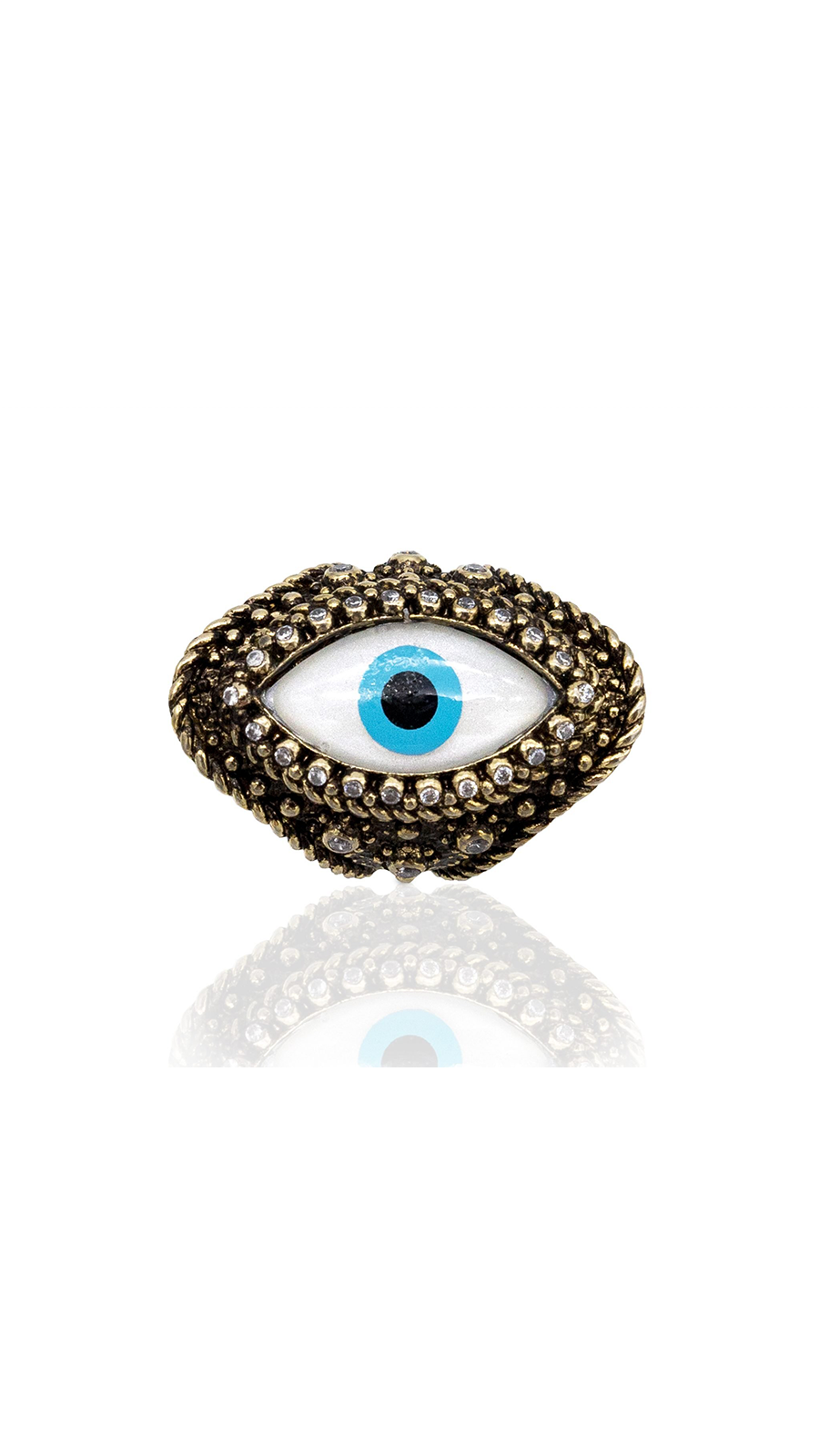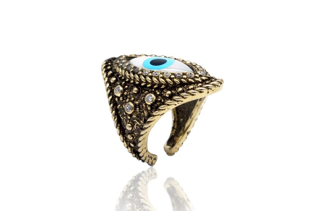 Cabra Eskitme Yüzük, 22 ayar altın kaplamalı pirinç üzerine zarif eskitme işçiliğiyle hayat bulmuş, merkezindeki göz motifiyle dikkat çekerken, çevresindeki kristal taşlarla sofistike bir parlaklık sunar. Bu özgün tasarım, hem geleneksel hem de modern unsurları bir araya getirerek, her tarza uyum sağlar. Cabra Eskitme Yüzük, göz alıcı detaylarıyla her el hareketinizde sizi öne çıkaracak bir sanat eseri.