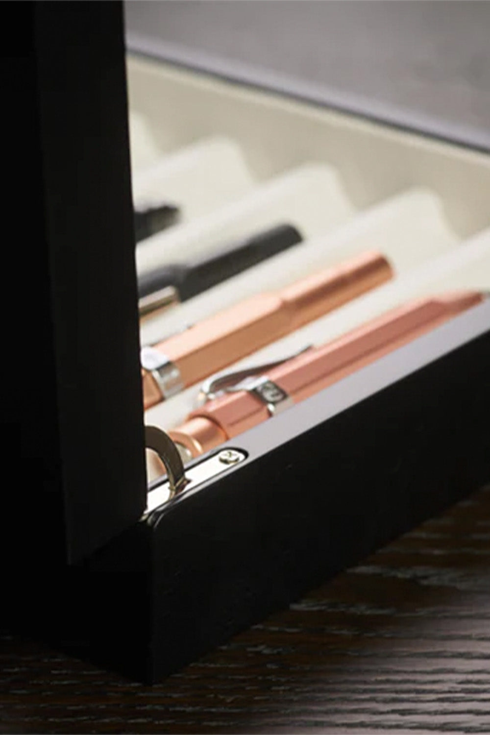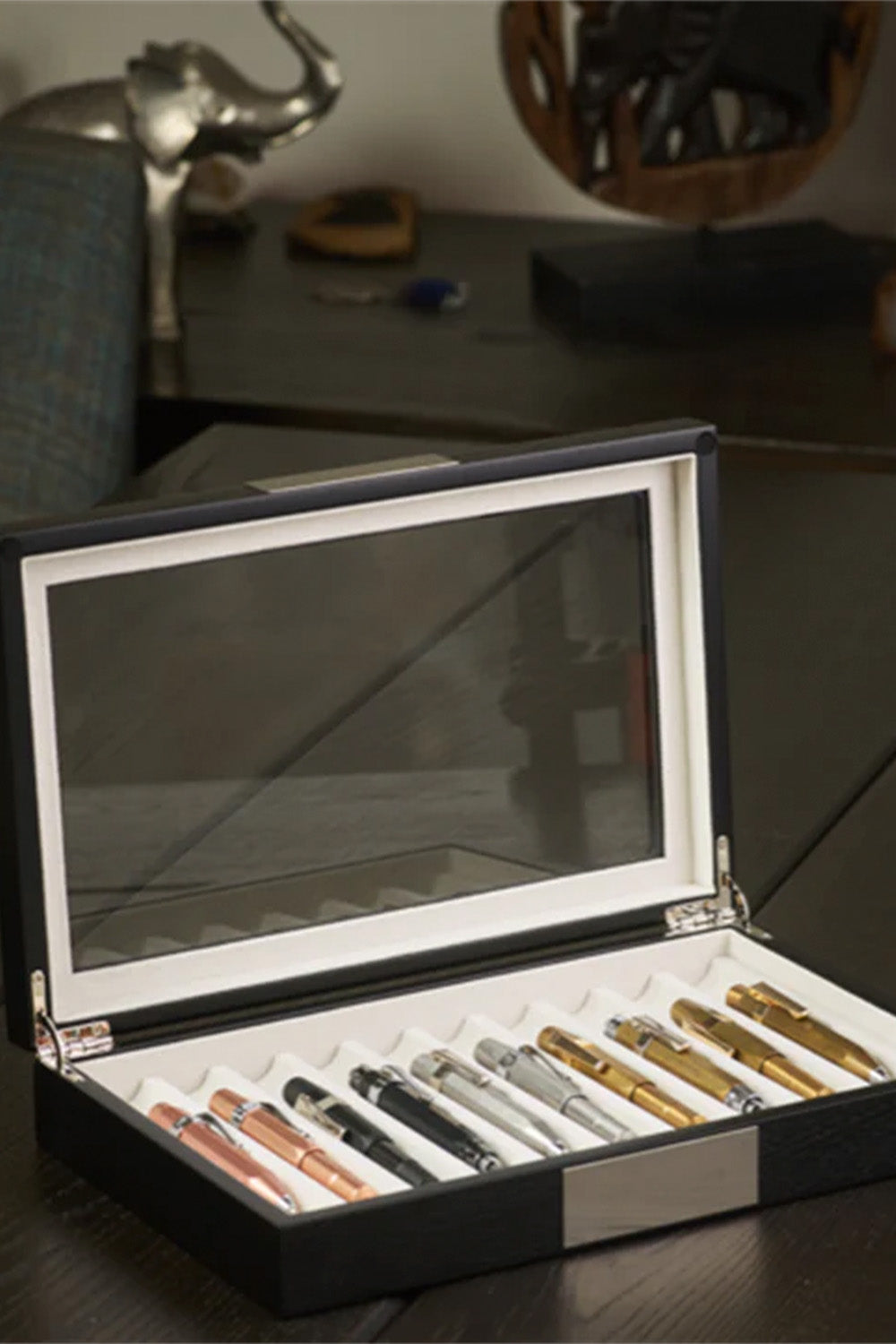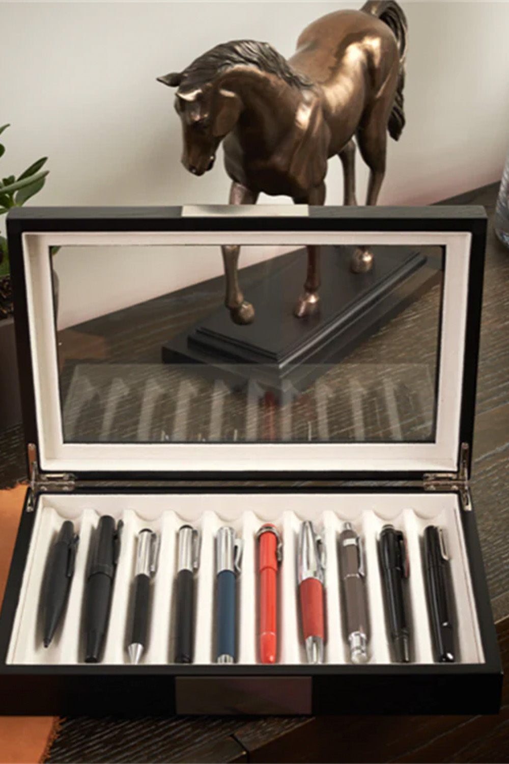 AHŞAP CAM KAPAKLI -10 (Venge) tasarımının ana fikri, kalemlerinize verdiğiniz değere eşlik edebilecek bir saklama alanı oluşturmaktır.