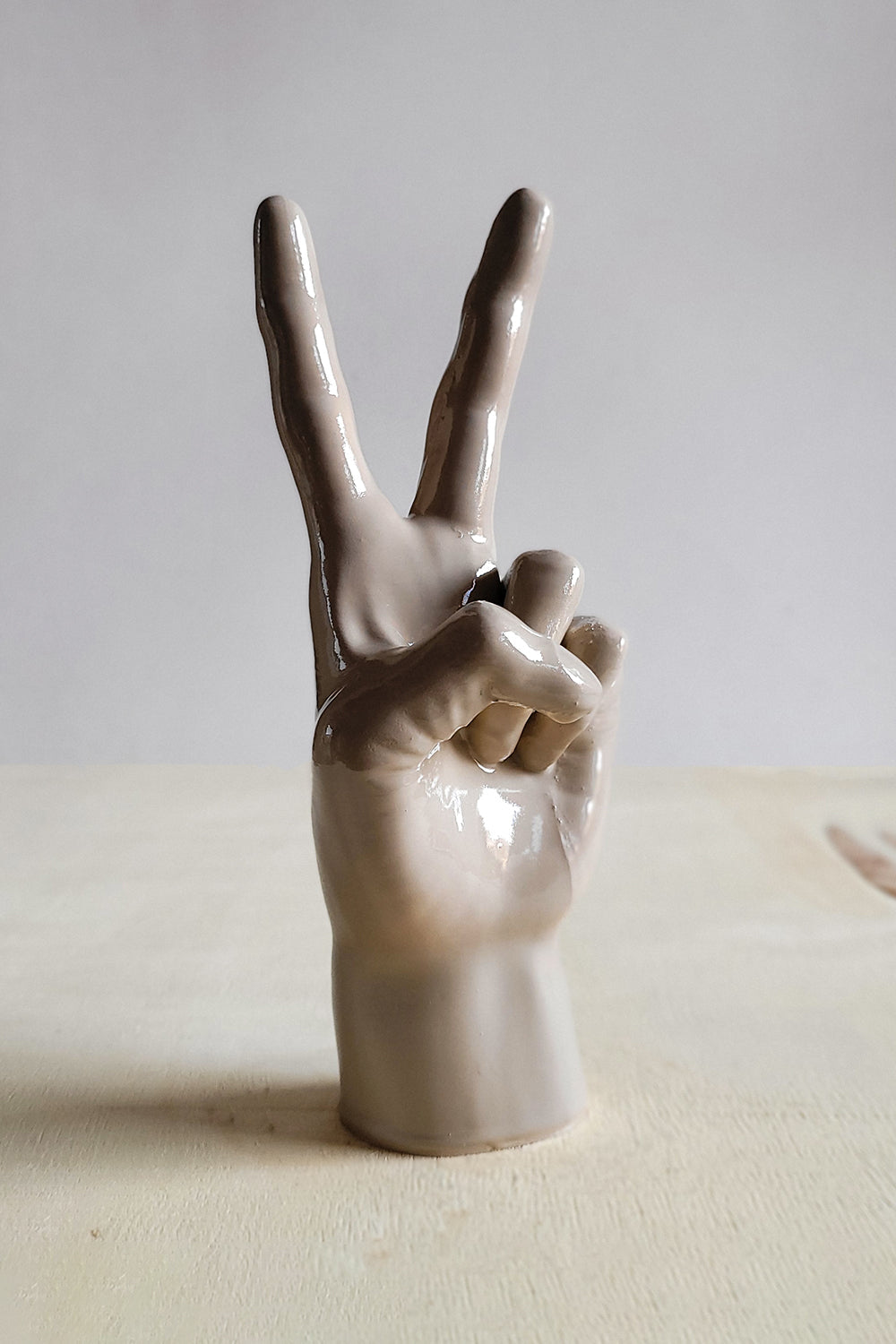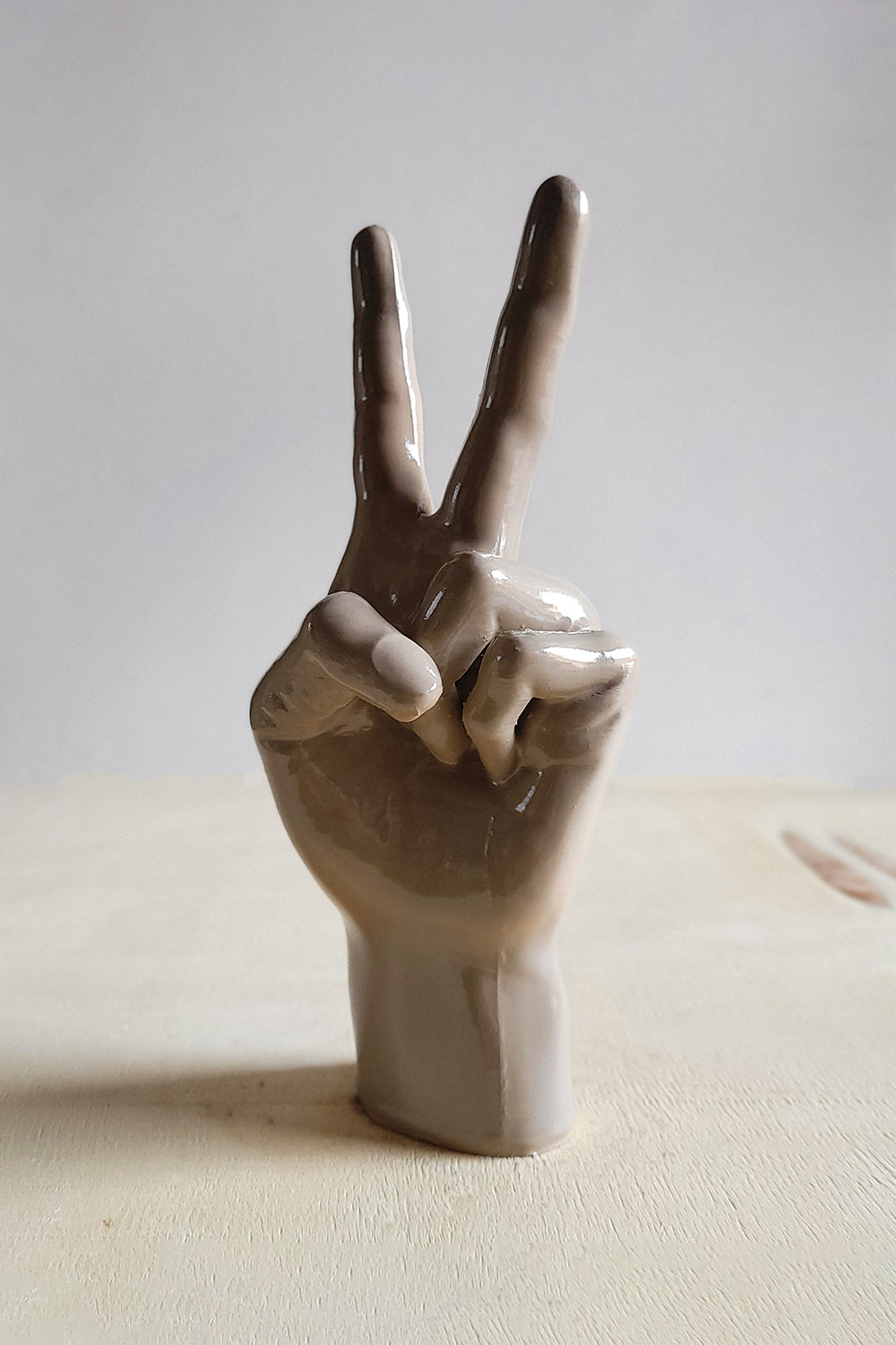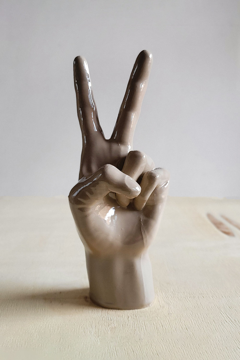 Bu özel "Peace" el heykeli, 3D baskı teknolojisi ile PLA biyopolimerden üretilmiş ve ardından el işçiliğiyle özenle tamamlanmıştır.