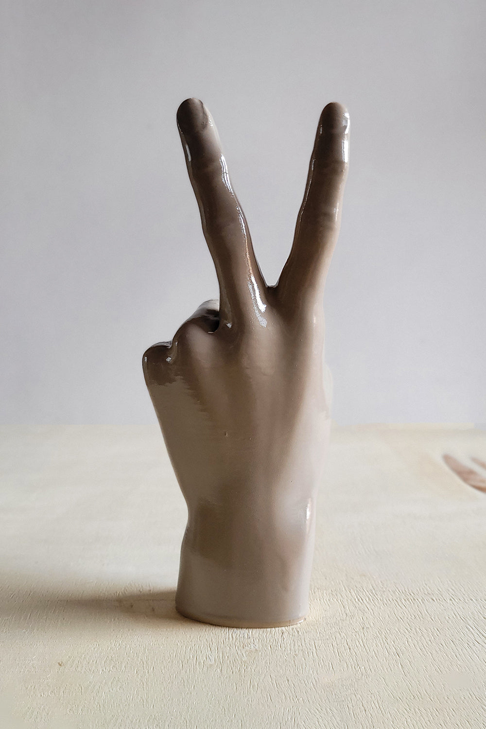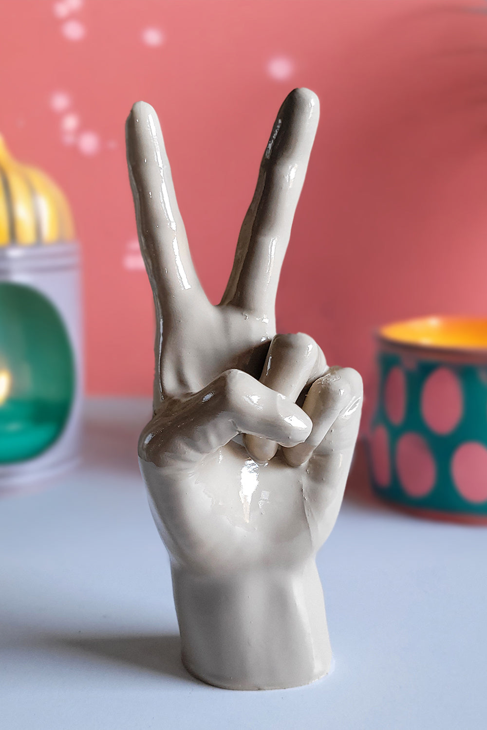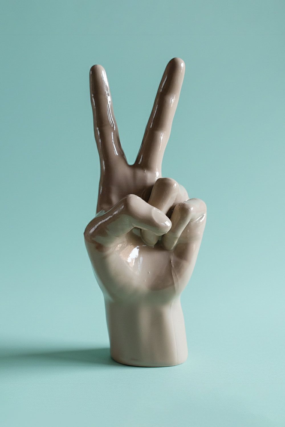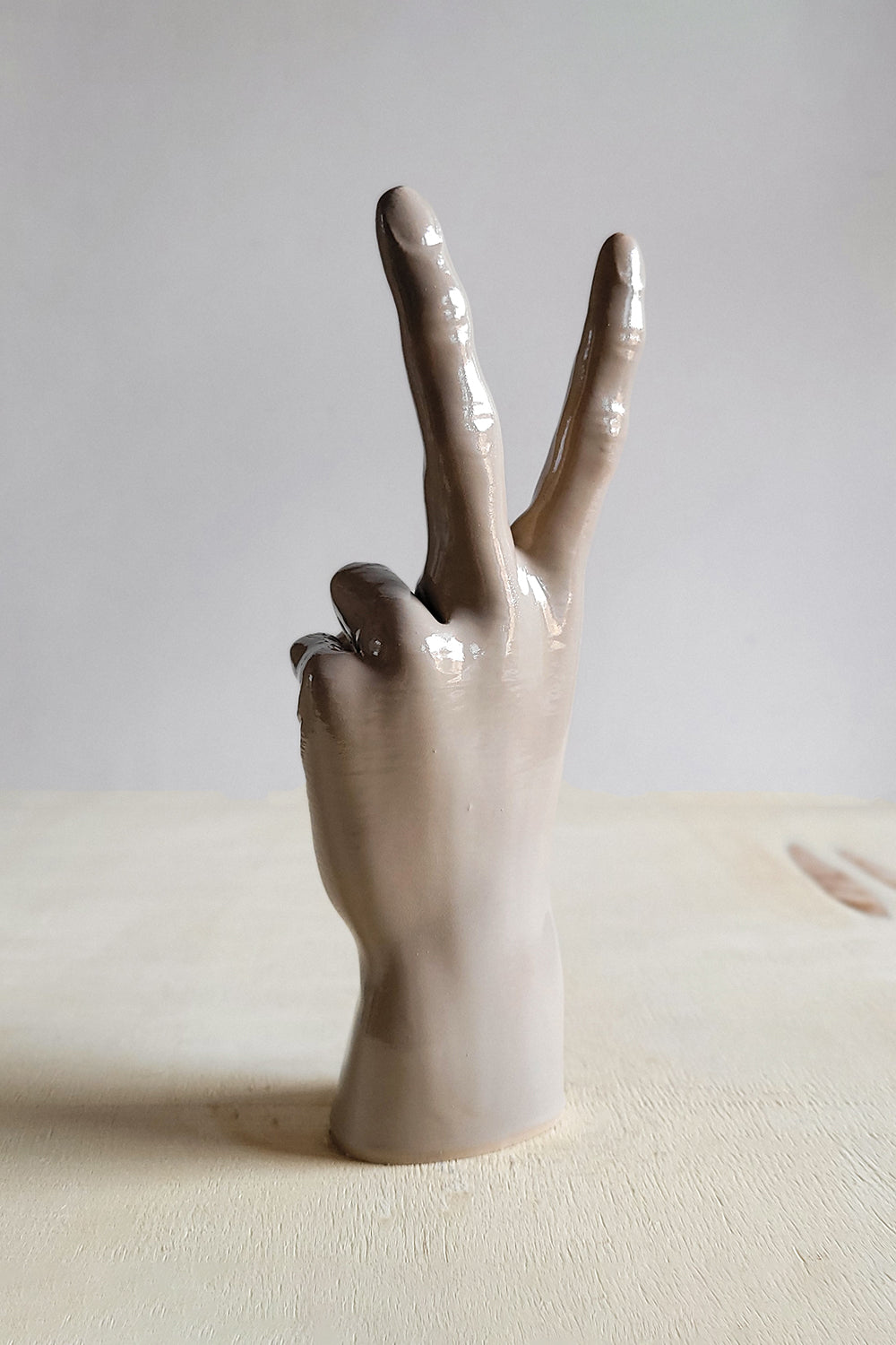 Bu özel "Peace" el heykeli, 3D baskı teknolojisi ile PLA biyopolimerden üretilmiş ve ardından el işçiliğiyle özenle tamamlanmıştır.