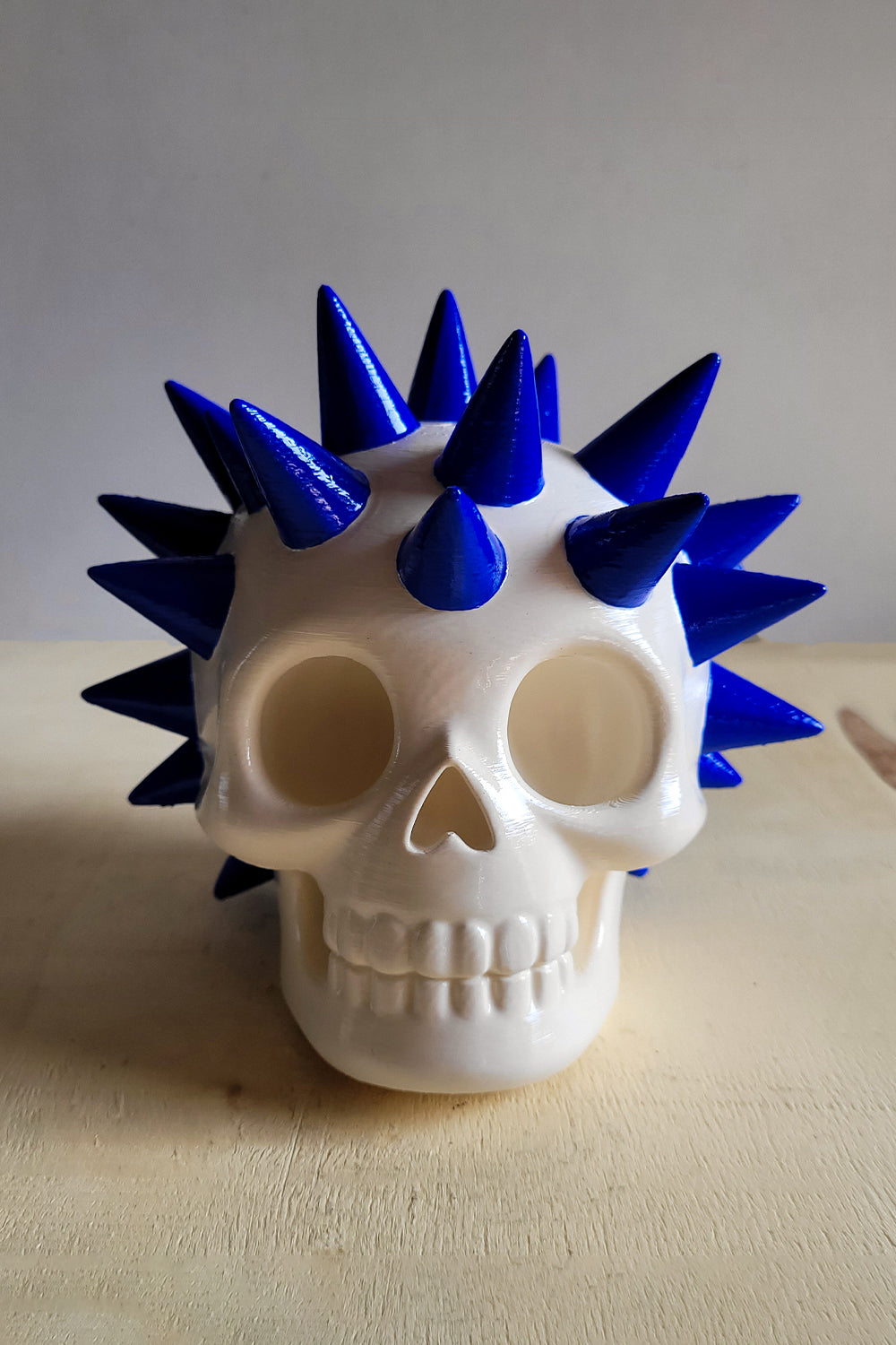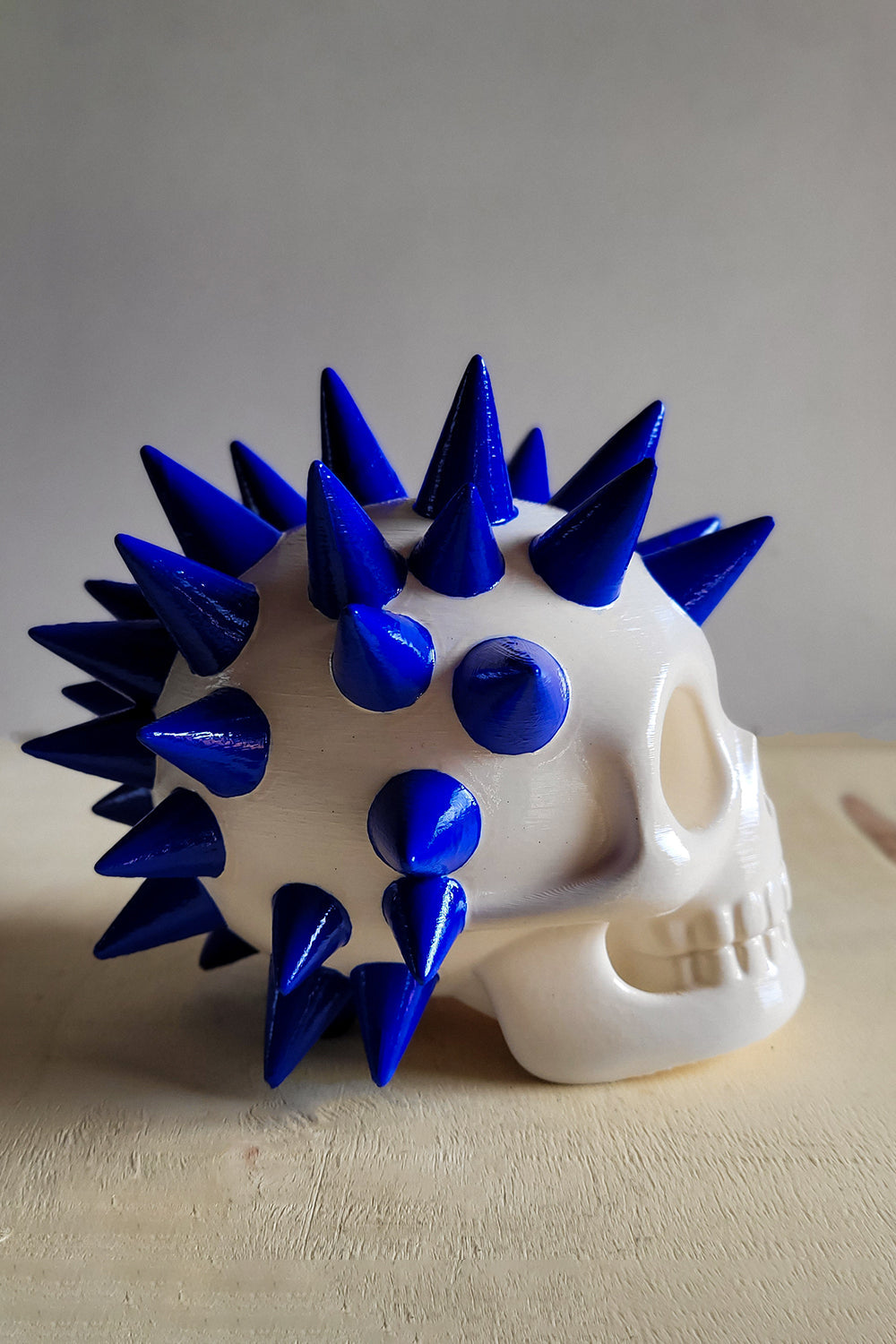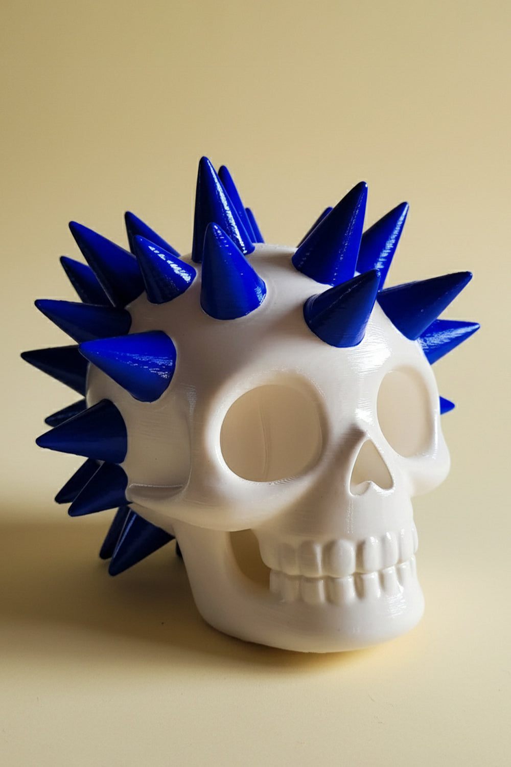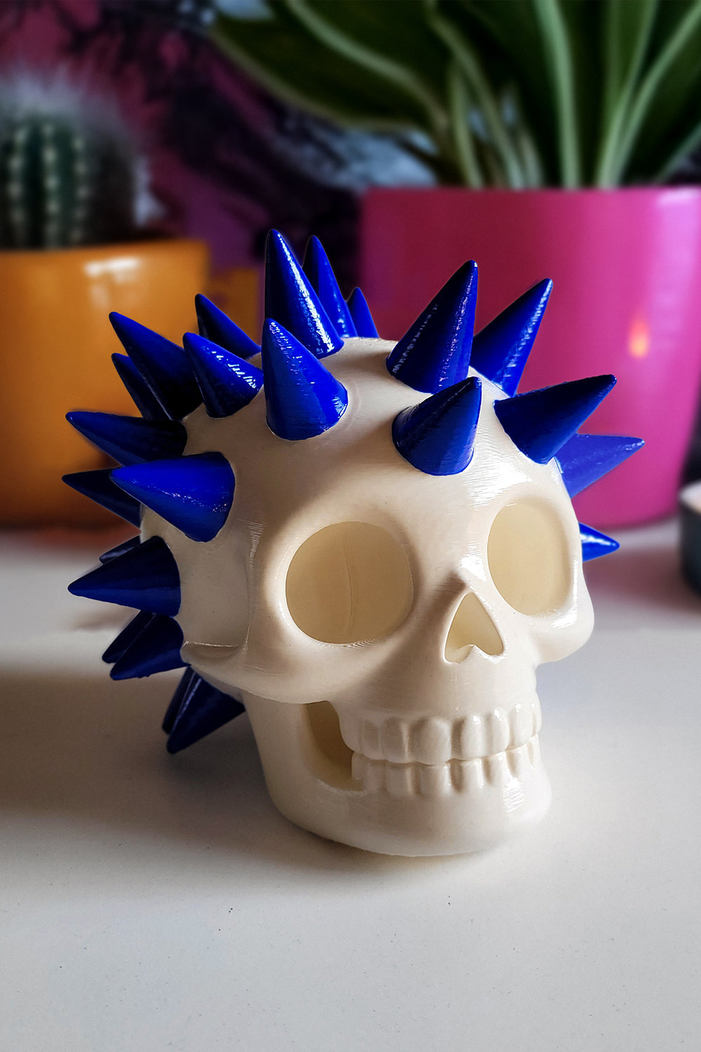 Bu punk esintili dekoratif obje; parlak dikenleri, sade kemik beyazı yüzeyi ve asi tarzıyla dikkat çeken bir tasarım parçası. Halloween köşelerinden raf süslemelerine kadar her yerde kendine yer bulur.