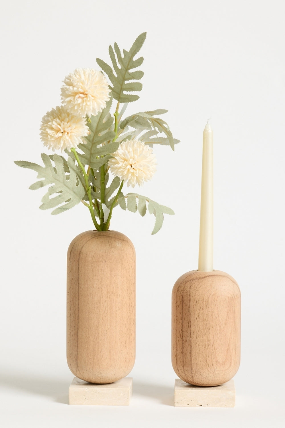 Ahşap Gövdeli Traverten Dekoratif Vazo & Şamdan Seti