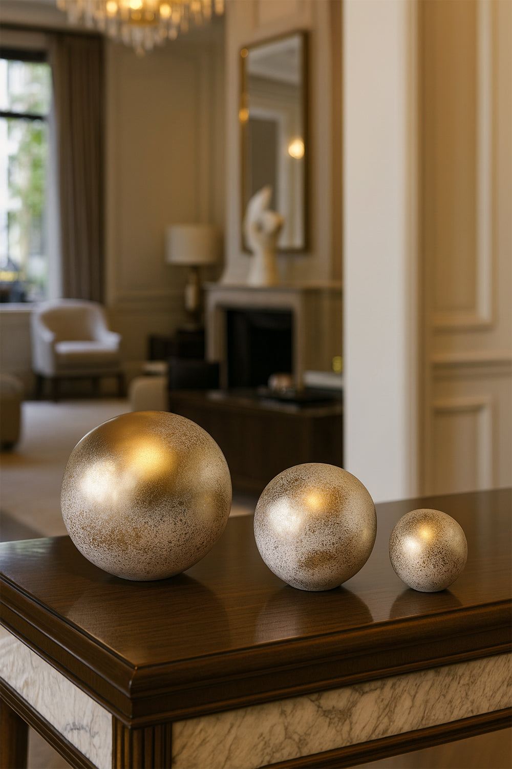 3’lü Gold Dekoratif Küre Seti – Modern Ev & Masaüstü Lüks Obje (3 Farklı Boy)