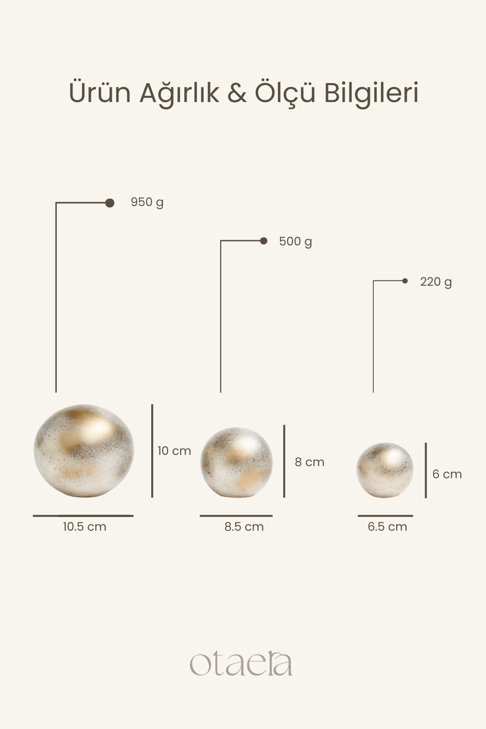 3 farklı ebat ile dengeli dekorasyon imkânı (Büyük: 10.5 cm – Orta: 8.5 cm – Küçük: 6.5 cm)Ağırlıkları sayesinde sağlam ve kaliteli duruş (950 g – 500 g – 220 g)El işçiliği özel boya tekniği ile benzersiz gold textured efektModern, minimal ve lüks dekorasyonlarla mükemmel uyumSehpalar, dresuarlar, vitrinler, TV ünitesi, ofis masası için idealÖzel günlerde şık hediye seçeneği