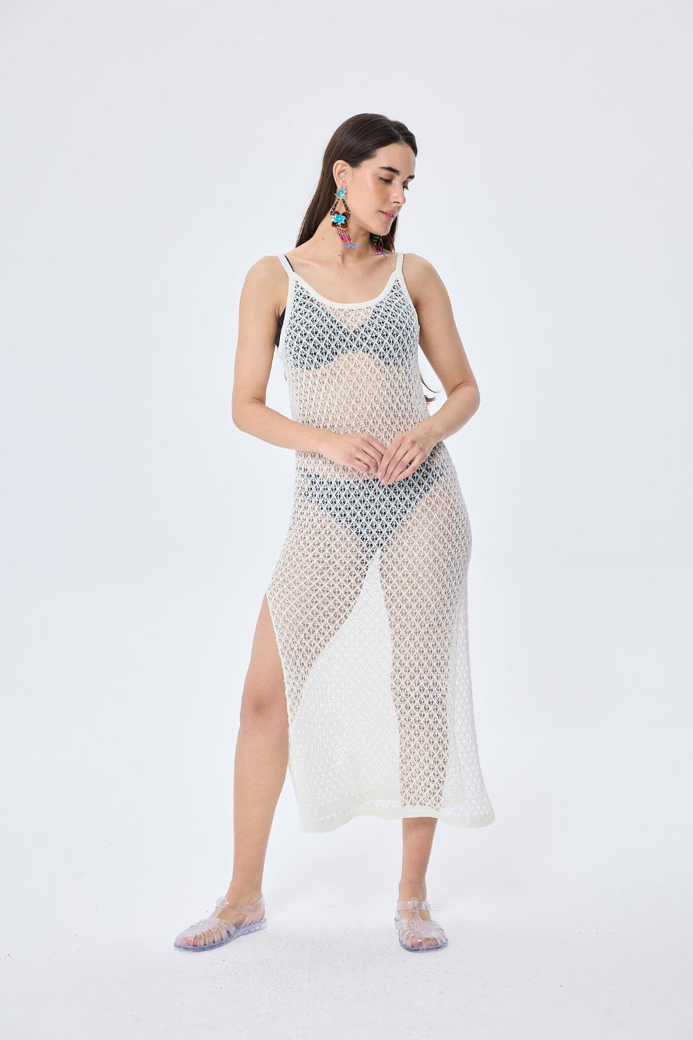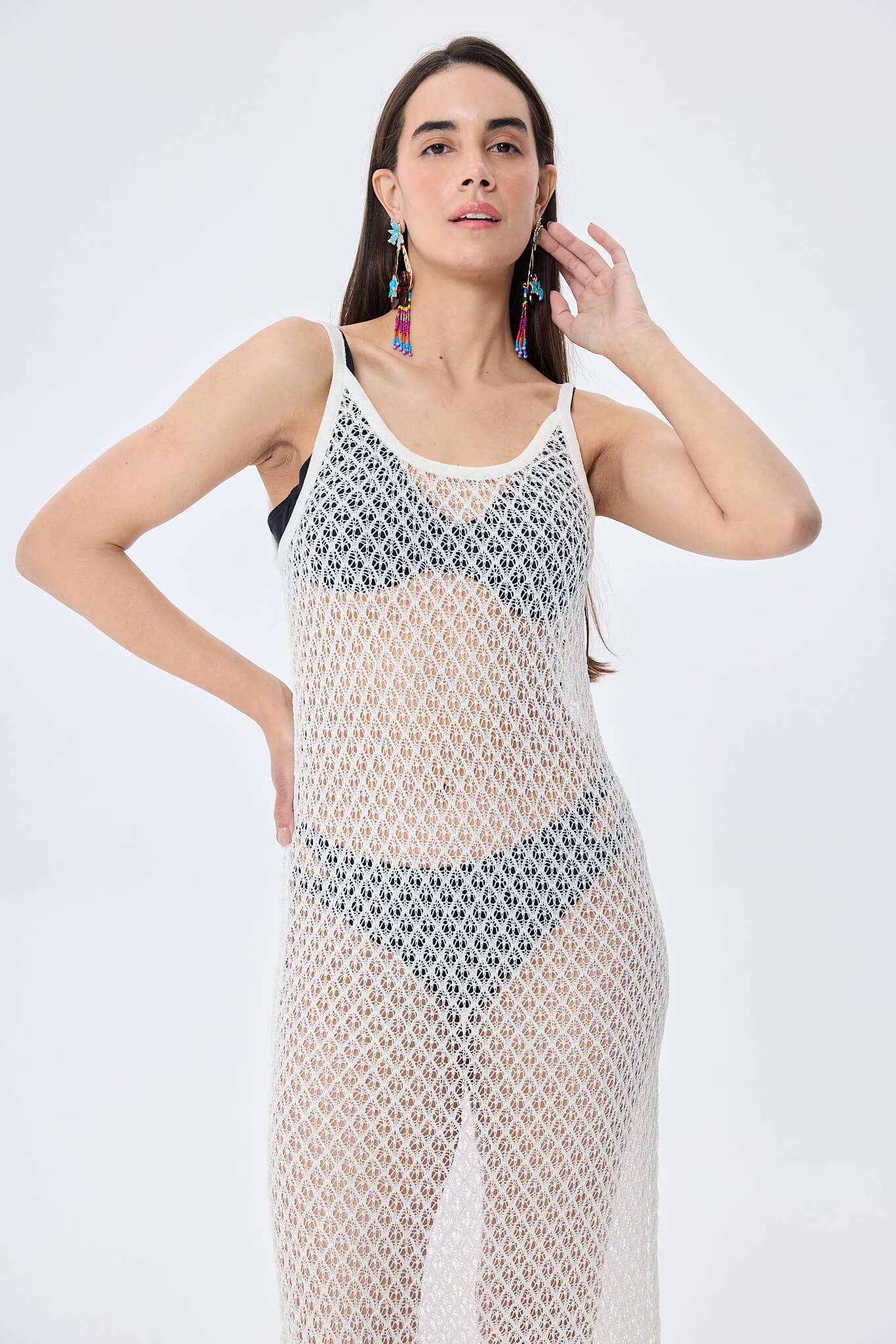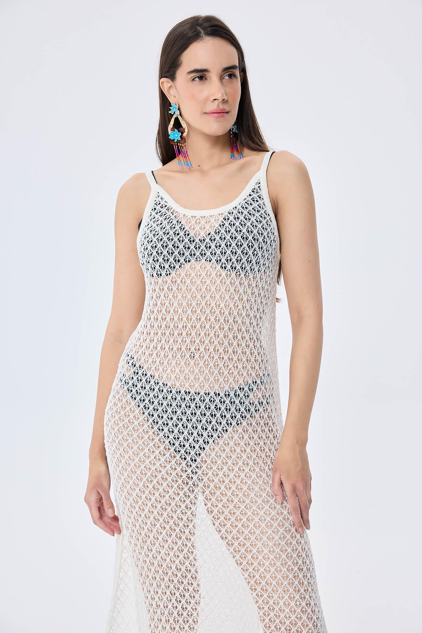 Ajur örgü detaylarına sahip, fit kesimli ve ayarlanabilir askılı kadın uzun triko plaj elbisesi ile plajın şıklığını keşfedin. Stilinizi tamamlayacak mükemmel bir parça.