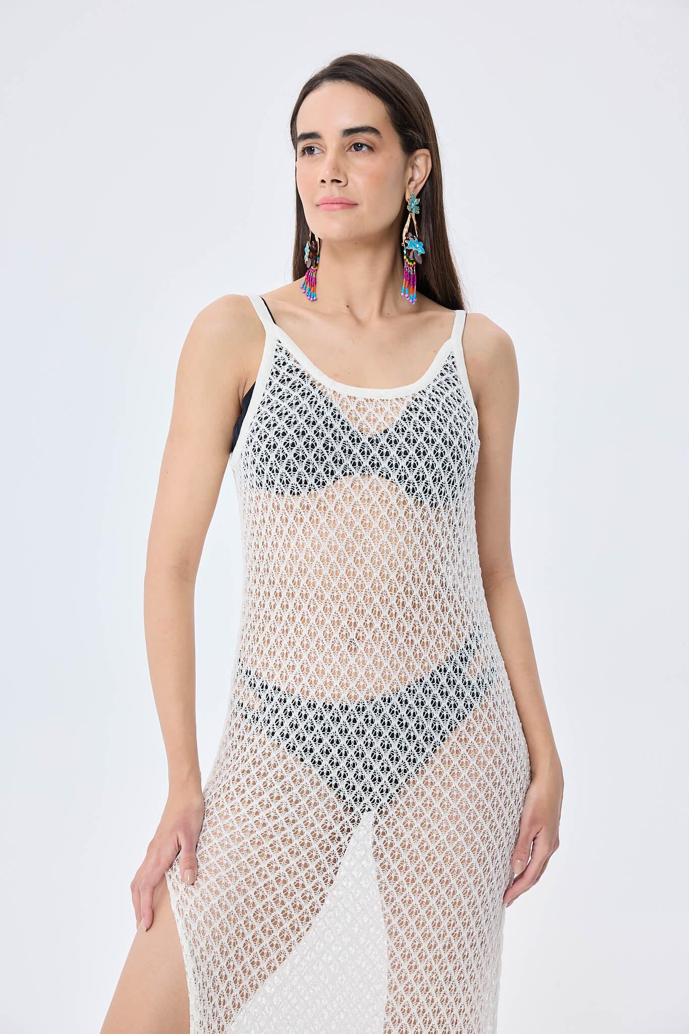 Ajur Örgü, Fit Kesim, Ayarlanabilir Askılı, Kadın Uzun Triko Plaj Elbisesi