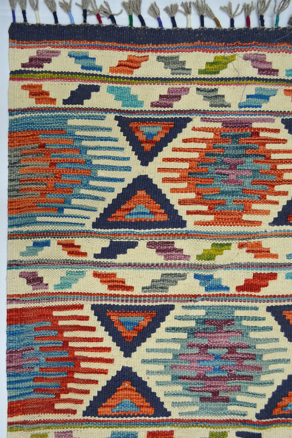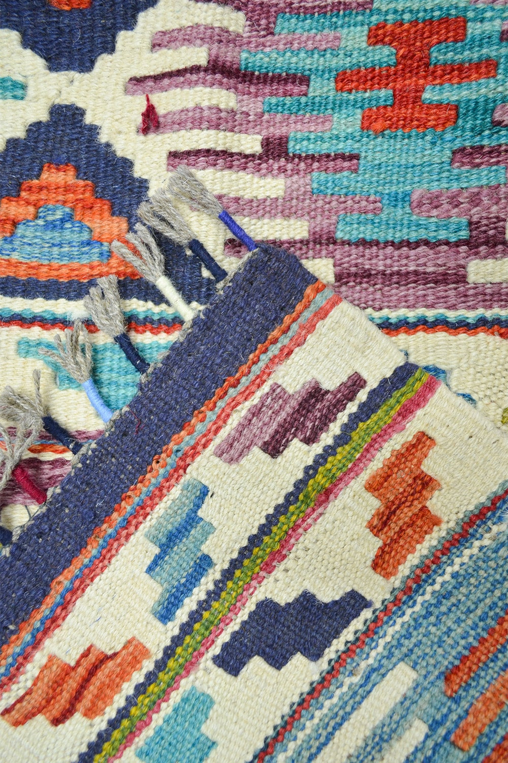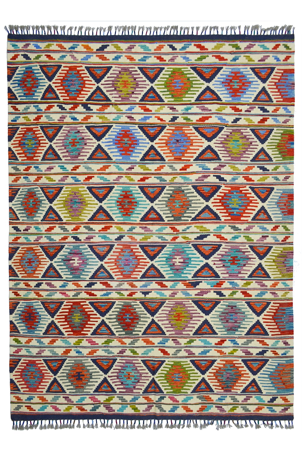 Afgan kilimleri, düz dokuma teknikleri ve geometrik desenleriyle bilinir. Renklerin cesur kullanımı, hem otantik hem de modern dekorasyonlarda dikkat çekici bir vurgu yaratır. El işçiliğinin doğal izlerini taşıyan bu kilim, her ilmeğinde ustalarının emeğini yansıtır.