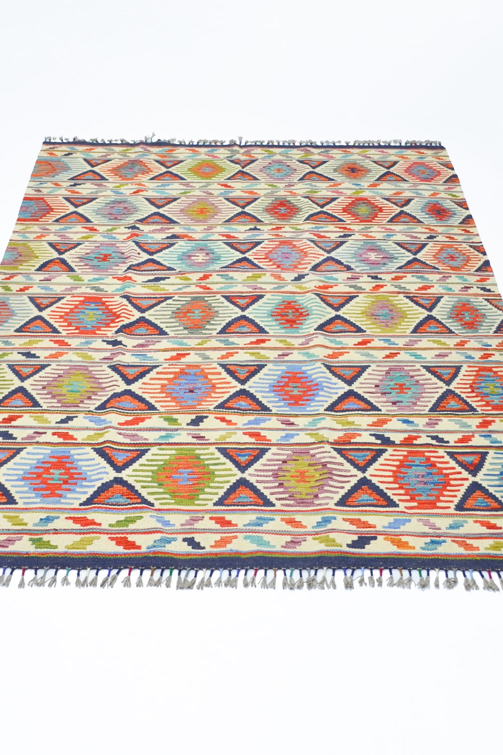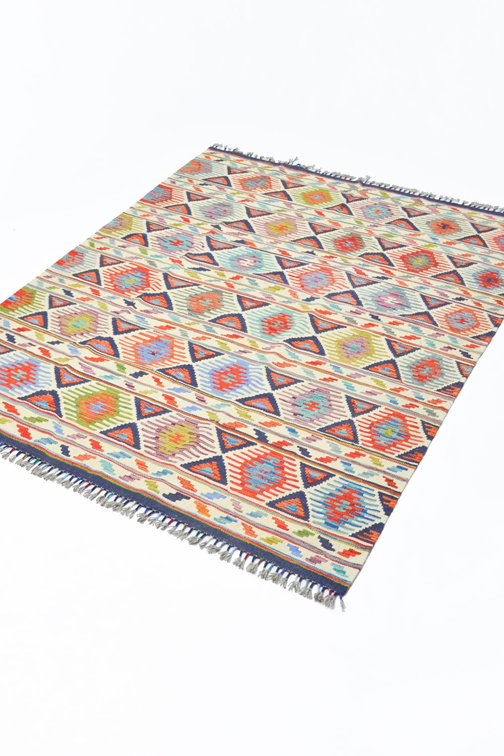 Afganistan’ın köklü dokuma geleneğini yansıtan bu el dokuma kilim, 152x205 cm (3.12 m²) ölçülerindedir. %100 yünden üretilen kilim, canlı ve çok renkli tasarımıyla mekânlara hareket ve enerji katar.