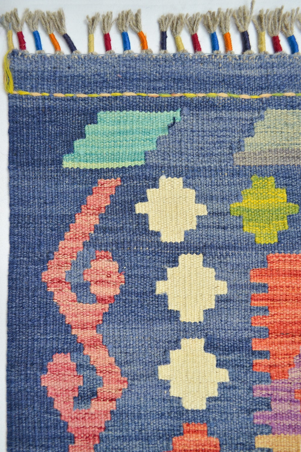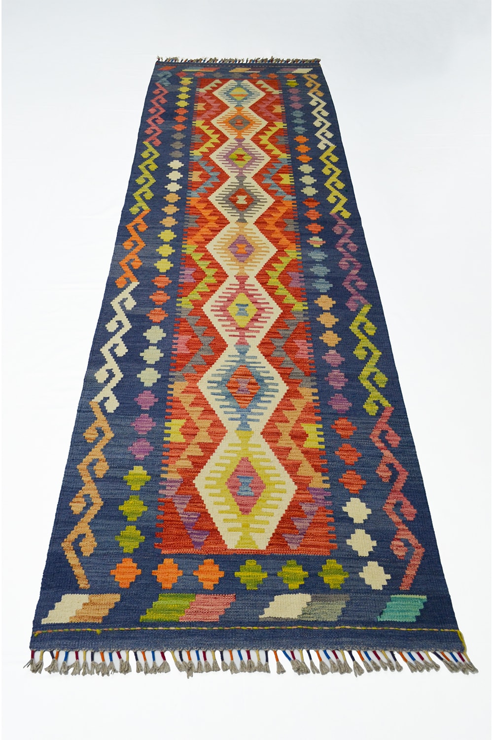 Afganistan’ın köklü dokuma geleneğini yansıtan bu el dokuma kilim, 84x293 cm (2.46 m²) ölçülerindedir. %100 yünden üretilen kilim, canlı ve çok renkli tasarımıyla mekânlara hareket ve enerji katar.