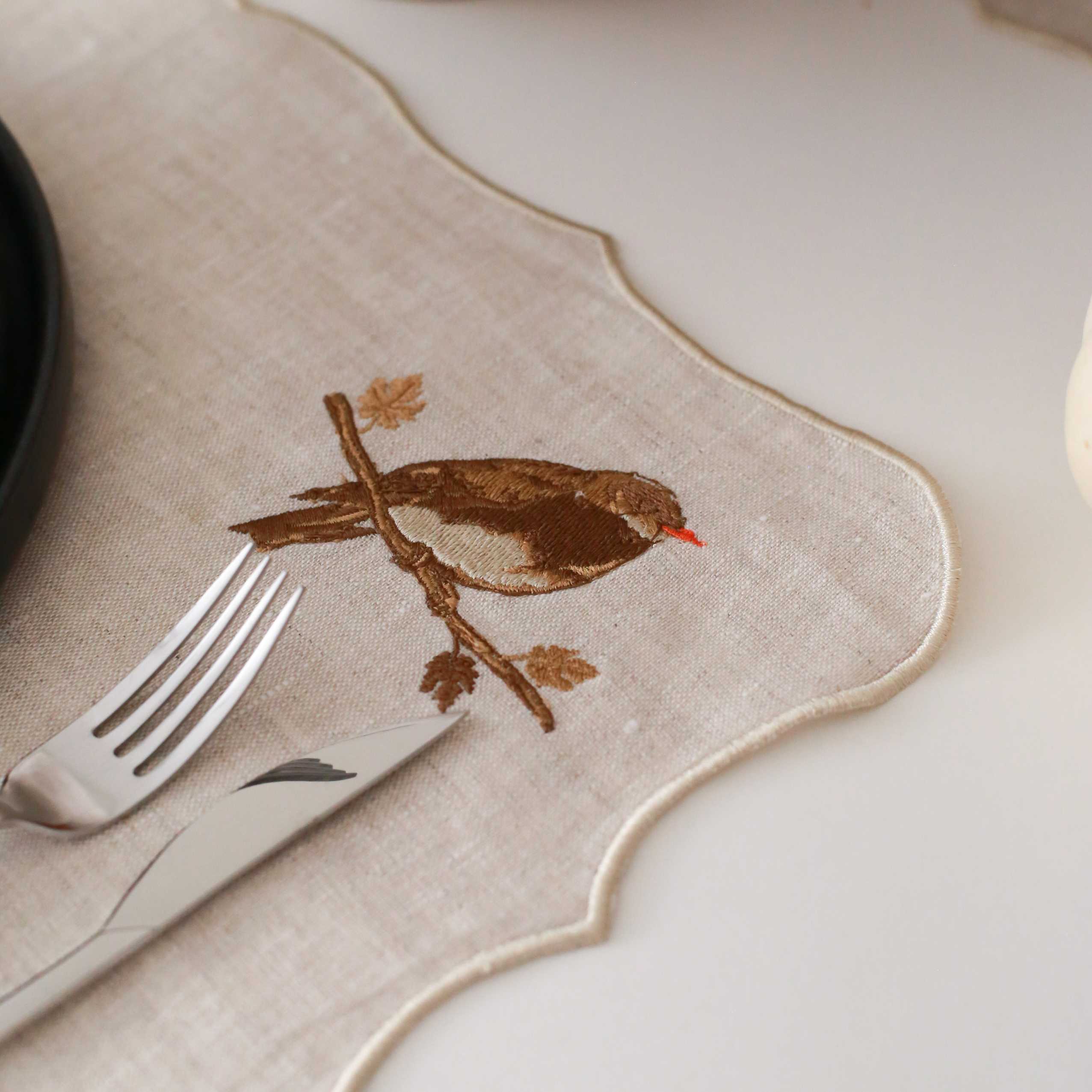 2'li Set Kuş İŞlemeli Keten Amerikan Servis