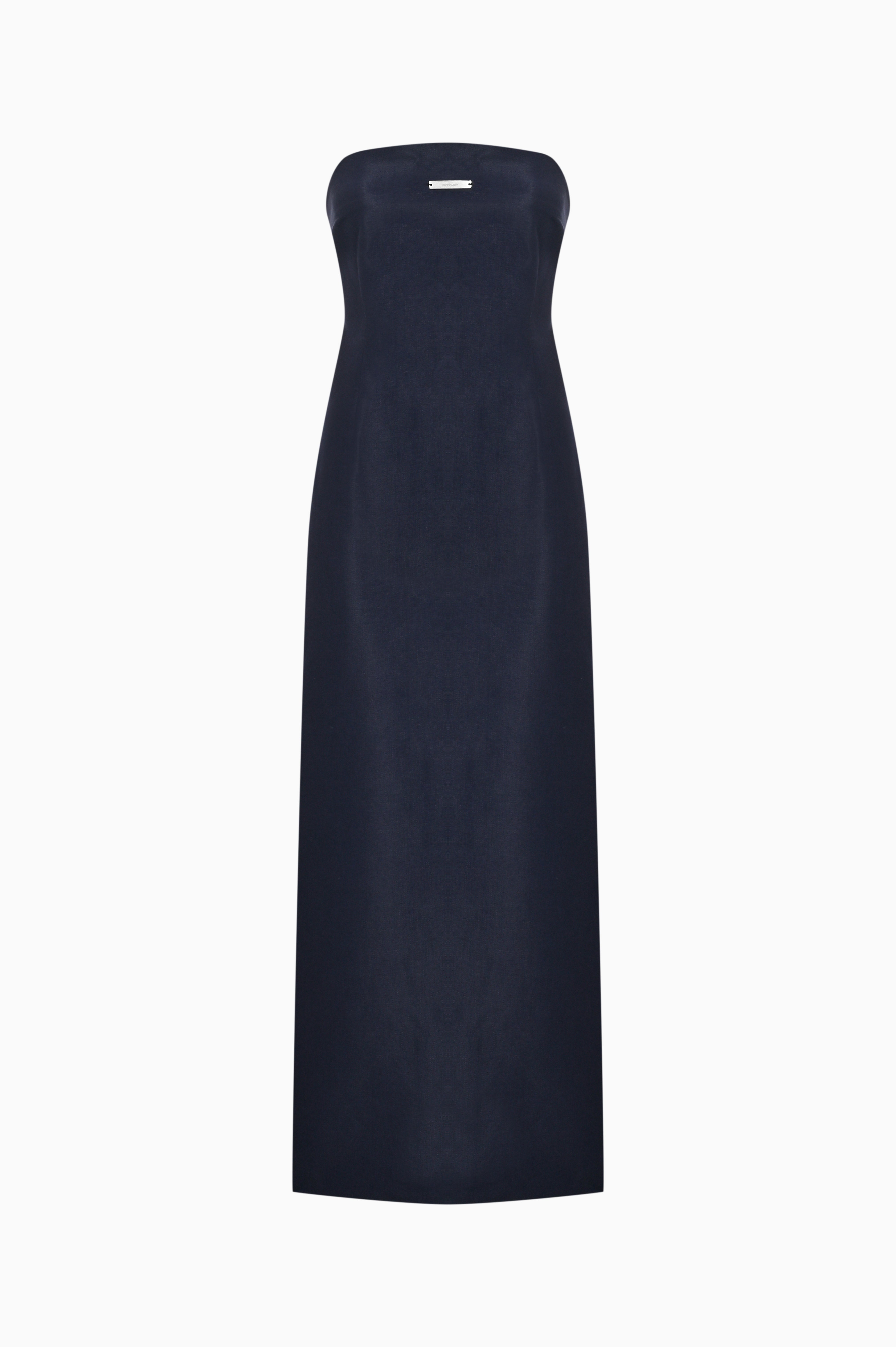Arka bedenden fermuar kapama, Straplez, Ön bedende KNTLGY metal plaka detaylı, Lacivert Denim Elbise.