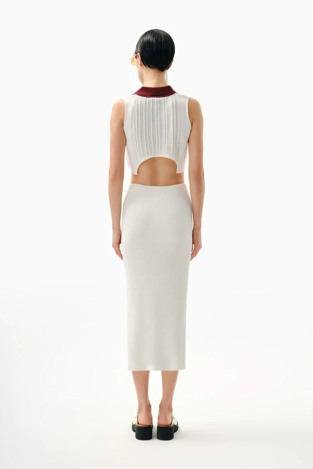 Kontrast polo yaka, sırtı cut-out detaylı, ajur örgülü, ince dokulu triko bluz.