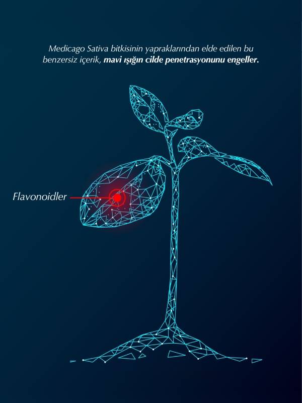 Mavi ışık, yüksek enerjili görünür ışık (HEV) kategorisinde yer alır ve UVA’ya benzer yapısal özellikler taşır. Yapılan araştırmalarda, ürünün yüksek oranlı flavonoid içeren ve patentli vegan aktiflere sahip formülünün, UVA ve HEV hasarını yüksek oranda bloke ettiği, UVA ve HEV kaynaklı cilt hasarında iyileşme sağladığı gözlemlenmiştir. Güneş filtresi içermeyen bu devrimsel içerik, patentli ve endemik bitkisel öz karışımları sayesinde cildi mavi ışığa karşı koruma özelliği gösterir. Aynı zamanda HEV kaynaklı ciltteki melanin artışında yavaşlama sağlar. Yüksek antioksidan içeren bitki özleriyle zenginleştirilen formülü, cilde canlı ve dolgun bir görünüm kazandırır. Güneş filtresi, sülfat, yağ, boya, parfüm, paraben, alkol ve silikon içermez. Komedoj