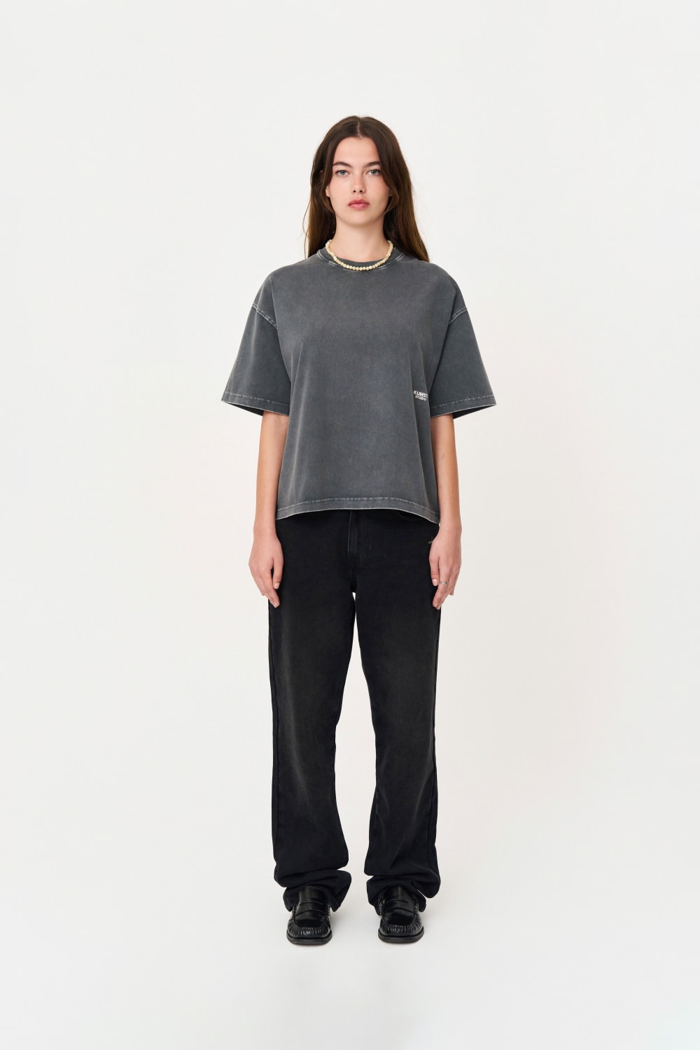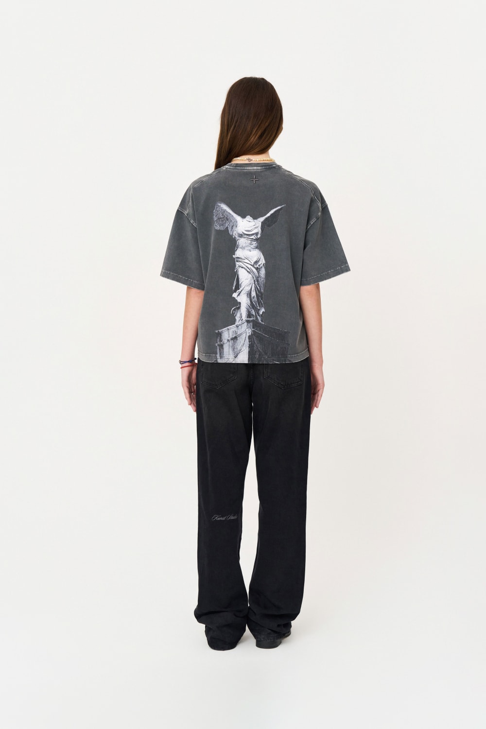 Kısa Kollu Heykel Baskılı Box Fit Yıkamalı Gri T-Shirt