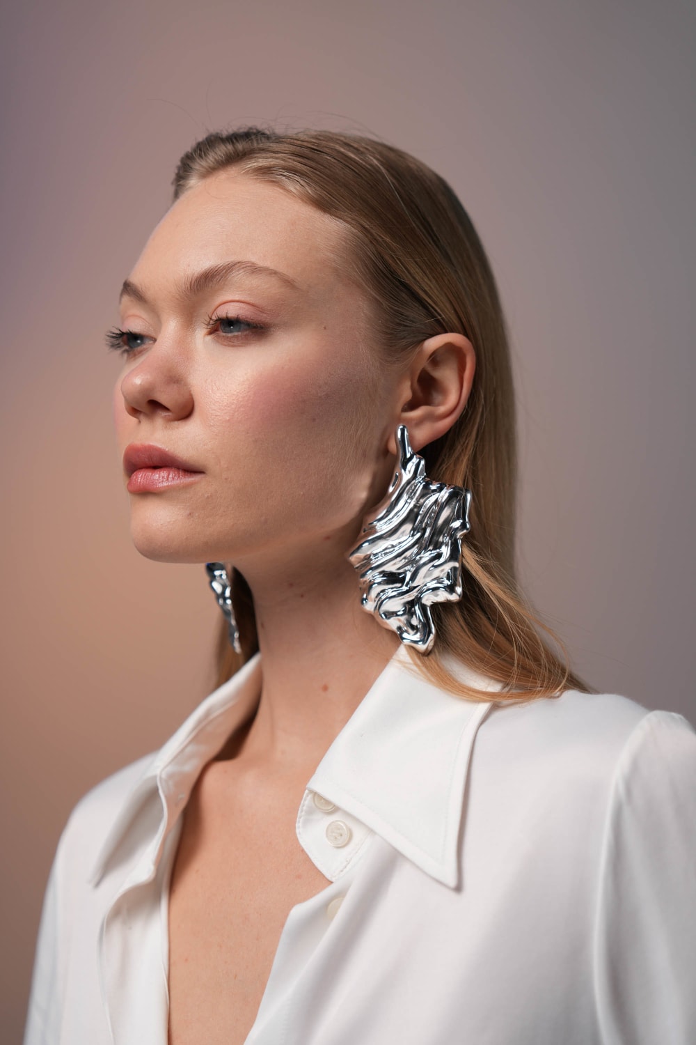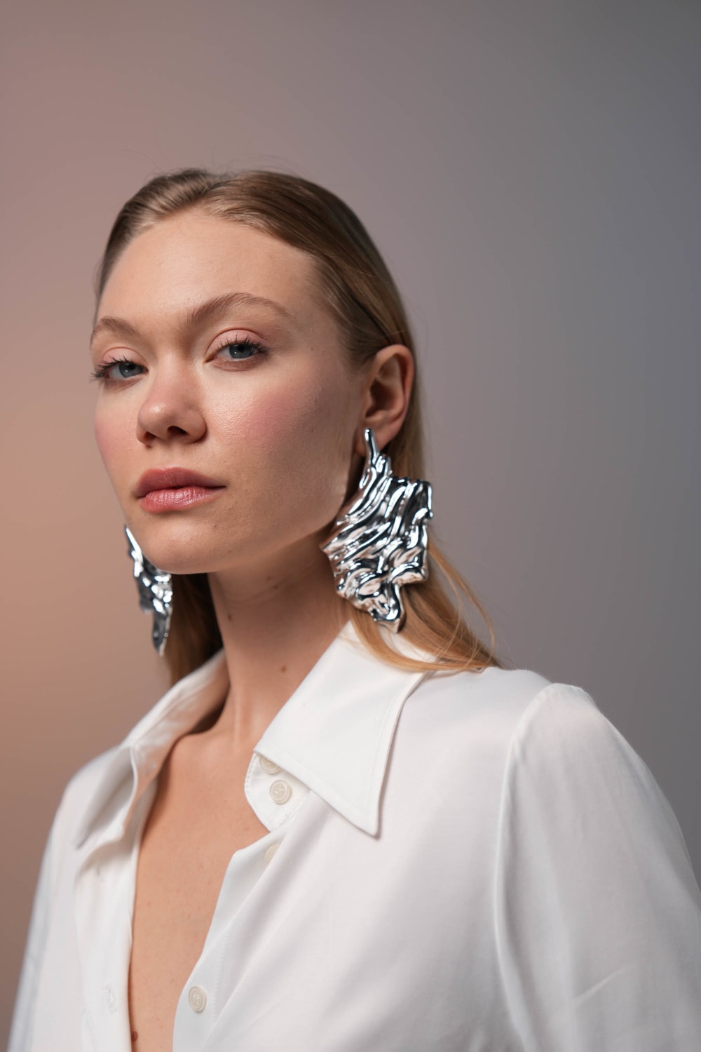 14 ayar beyaz altın kaplamalı maksimal, 925 gümüş pimli hafif küpe