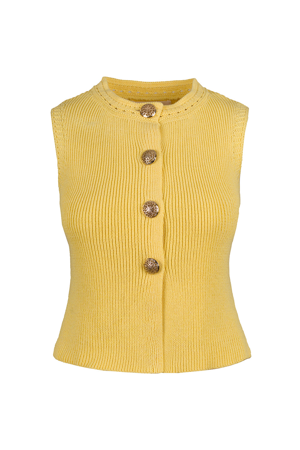 Göz alıcı altın rengi düğmeleriyle dikkat çeken Gold Düğmeli Triko Top, zarif detaylarıyla stilinizi bir adım öne taşır. Bisiklet yaka ve kolsuz tasarımı sayesinde hem modern hem klasik bir görünüm sunar. Günlük kombinlerden ofis şıklığına kadar her ortamda rahatlıkla kullanabilirsiniz.