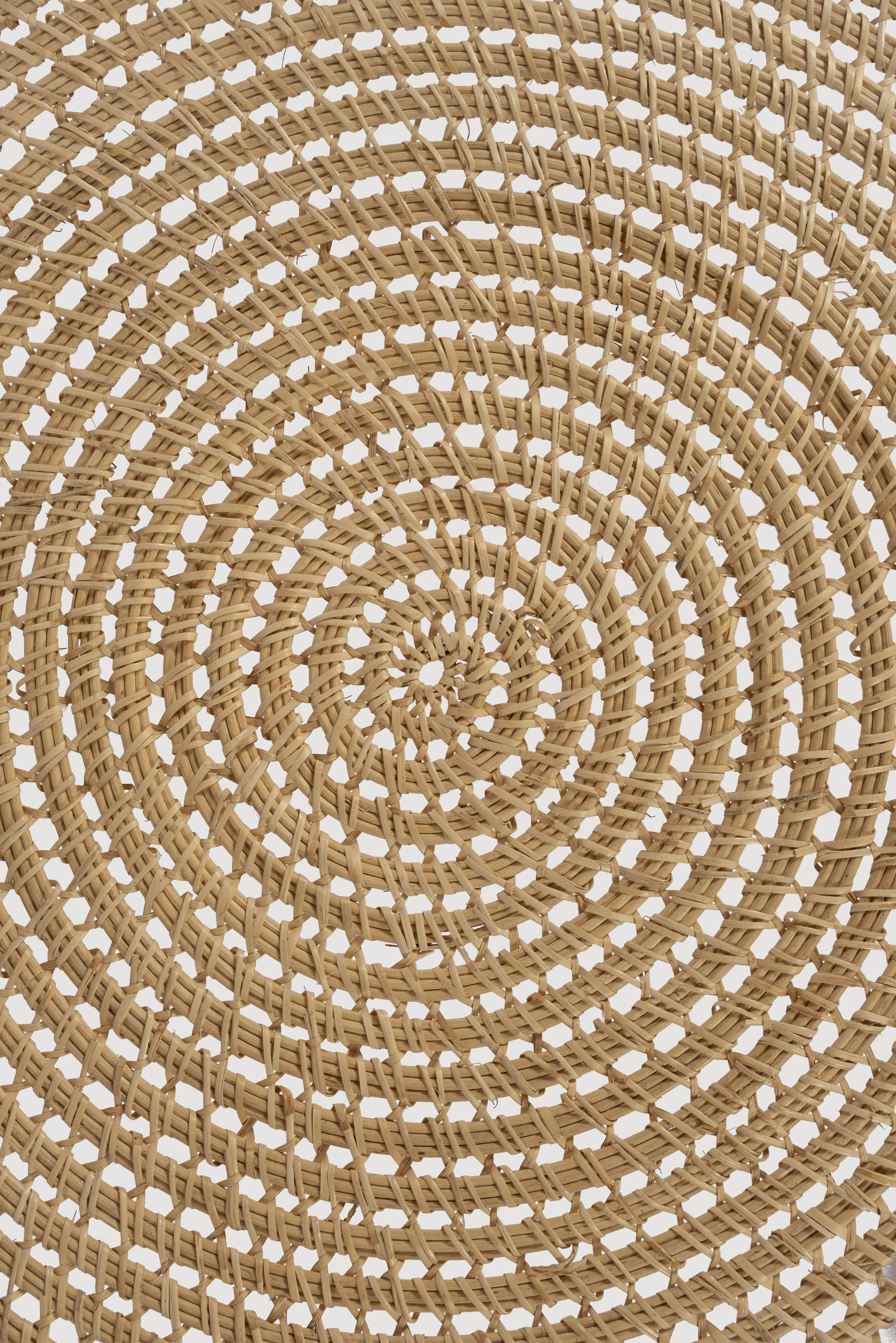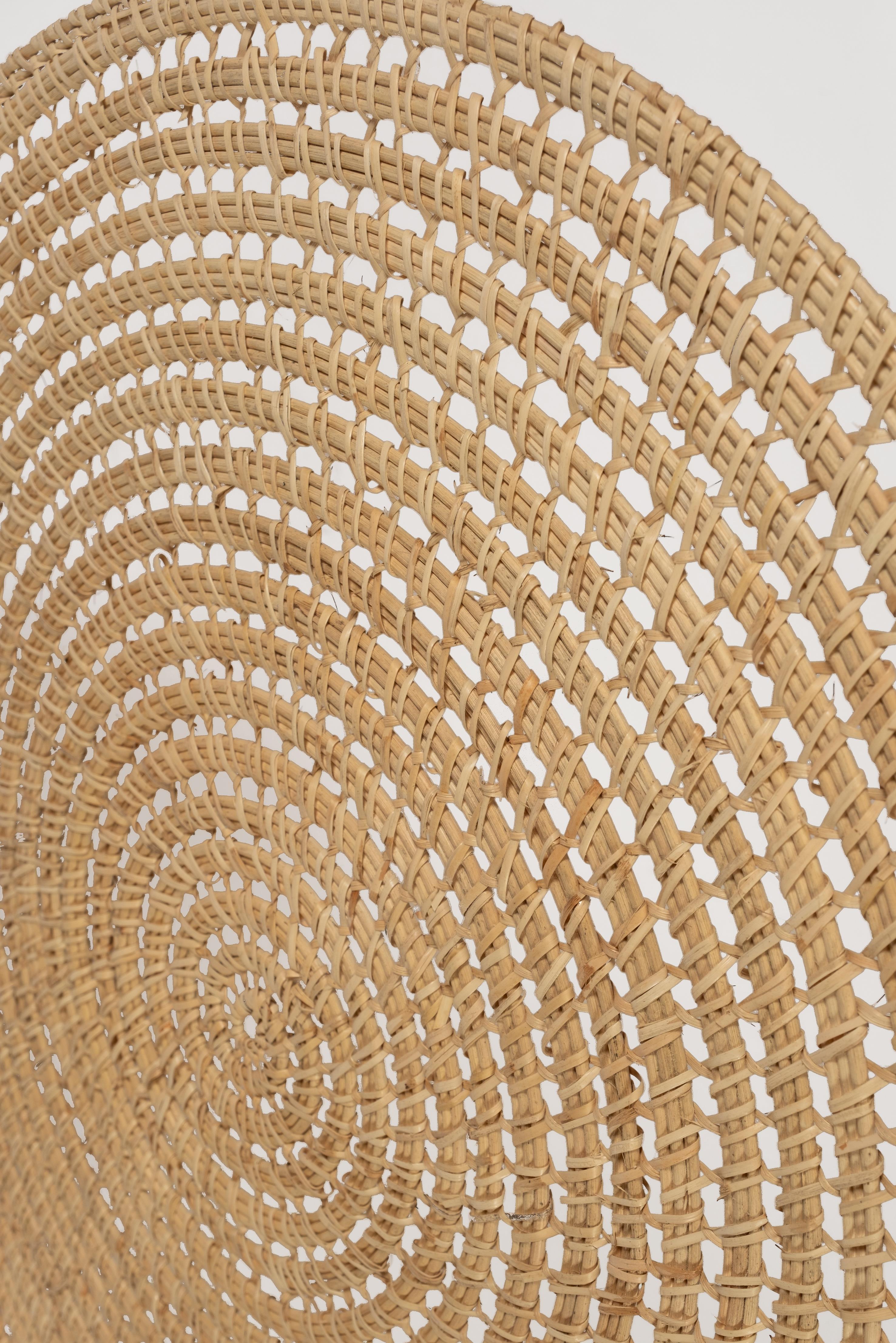 Doğal rattan malzemeden yapılmış yuvarlak bir duvar tabağıdır. El dokuması detaylarla süslenmiş bu dekoratif duvar tabağı, rustik ve bohem tarzları yansıtarak mekânlara doğal bir estetik katmaktadır. Doğal liflerin kullanımı sayesinde çevre dostu ve sürdürülebilir bir üründür. Özellikle modern, minimalist ve bohem iç mekan dekorasyonlarında tercih edilen bu tür duvar aksesuarları, sıcak ve samimi bir atmosfer yaratmak için idealdir.