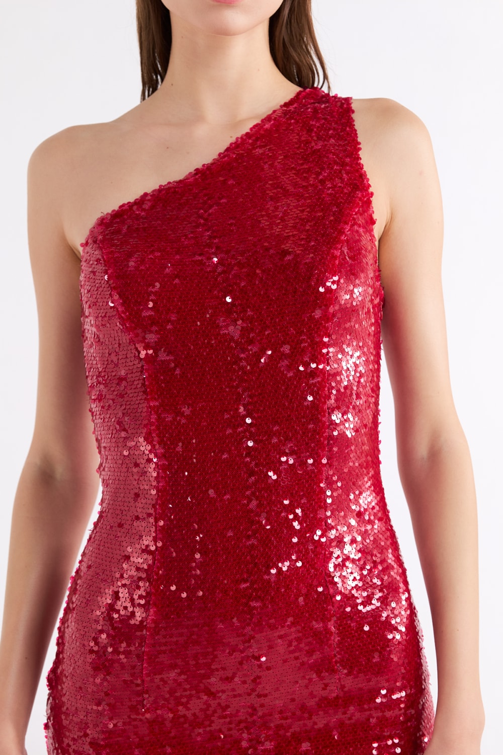 Asimetrik etek ucu ve tek omuz detayı elbiseye modern ve enerjik bir hava katıyor.