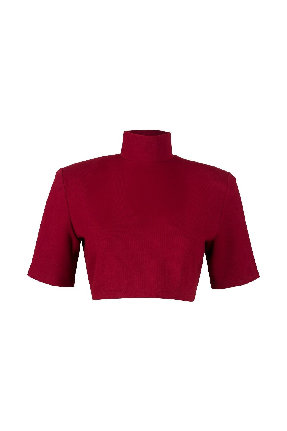 Laulei Yüksek Yaka Vatkalı Crop Tişört – Güçlü Duruş, Net Stil