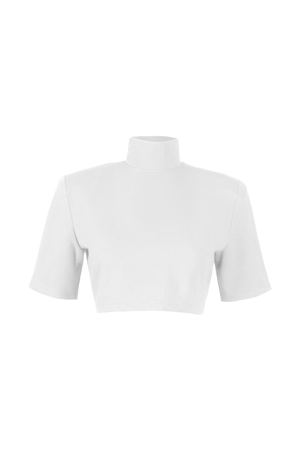 Laulei Yüksek Yaka Vatkalı Crop Tişört – Güçlü ve Modern Stil
