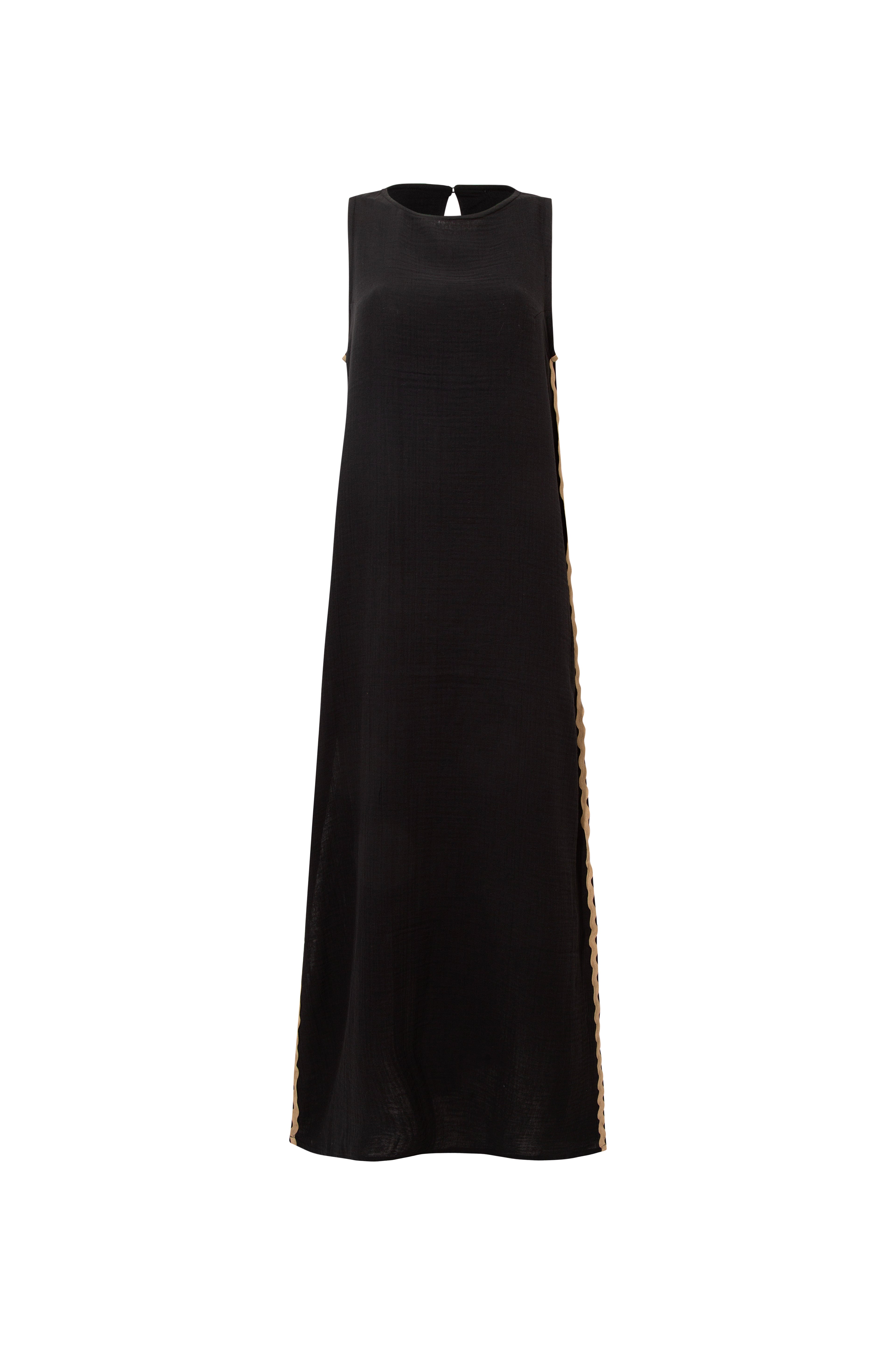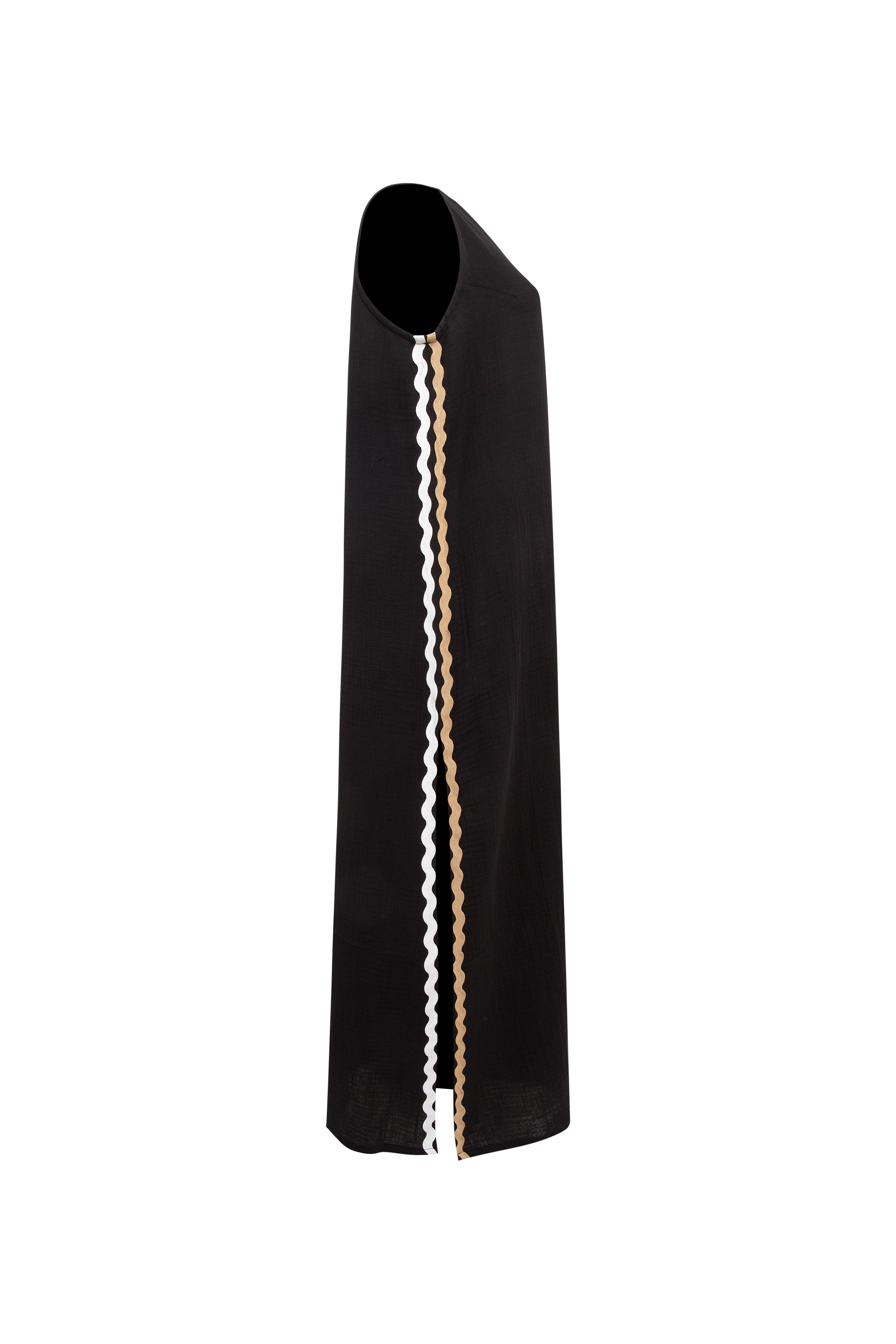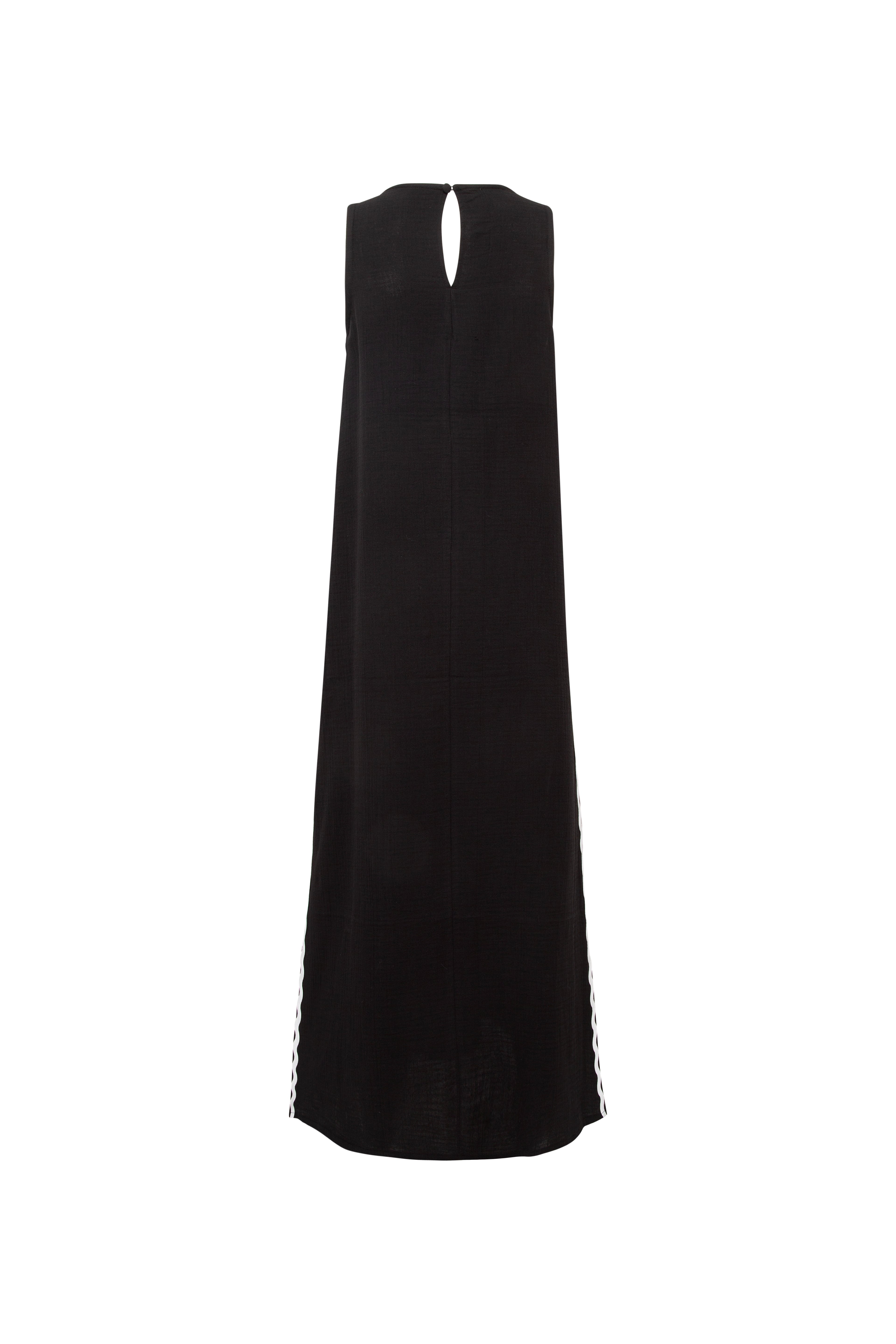 Çift Su Taşı Detaylı Siyah Uzun Kolsuz Elbise%100 Pamuk,Yumuşak dokulu ve nefes alabilen müslin kumaştan üretilmiştir.,Uzun,yırtmaç ile tasarlanmış elbise, su taşı detayı ile şık bir görünüm sunmaktadır.BAKIM ÖNERİLERİ:30 derecede yıkama yapılabilir,Ağartıcı kullanılamaz,Makinede kurutmayınız.Göğüs: 80 cmBel: 116 cmBoy: 126 cm