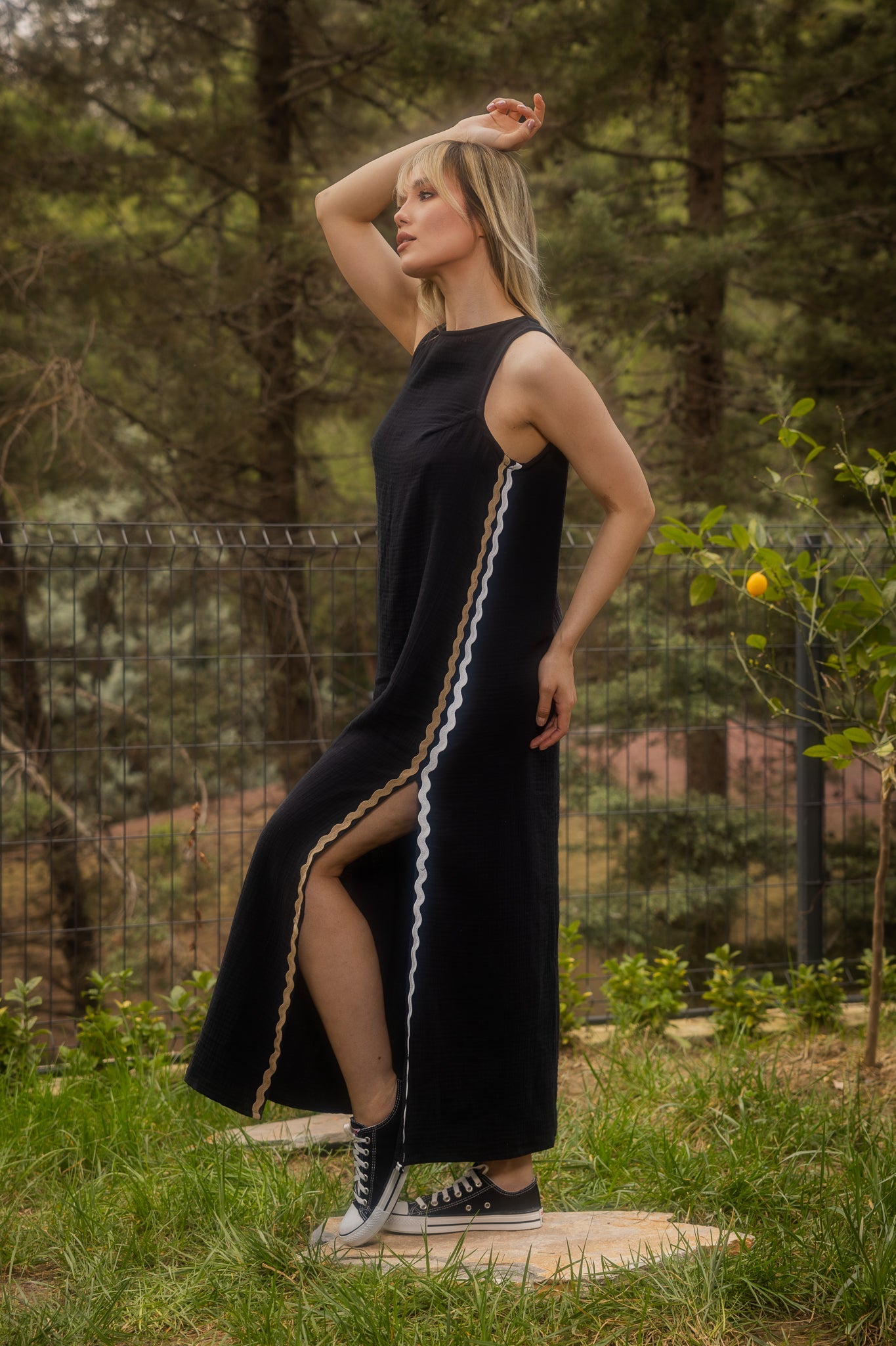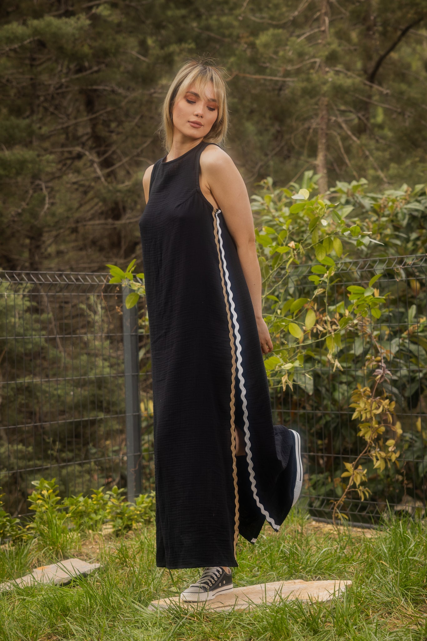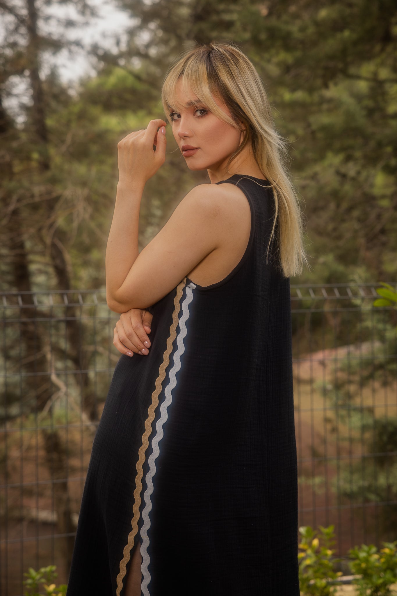 Çift Su Taşı Detaylı Siyah Uzun Kolsuz Elbise%100 Pamuk,Yumuşak dokulu ve nefes alabilen müslin kumaştan üretilmiştir.,Uzun,yırtmaç ile tasarlanmış elbise, su taşı detayı ile şık bir görünüm sunmaktadır.BAKIM ÖNERİLERİ:30 derecede yıkama yapılabilir,Ağartıcı kullanılamaz,Makinede kurutmayınız.Göğüs: 80 cmBel: 116 cmBoy: 126 cm