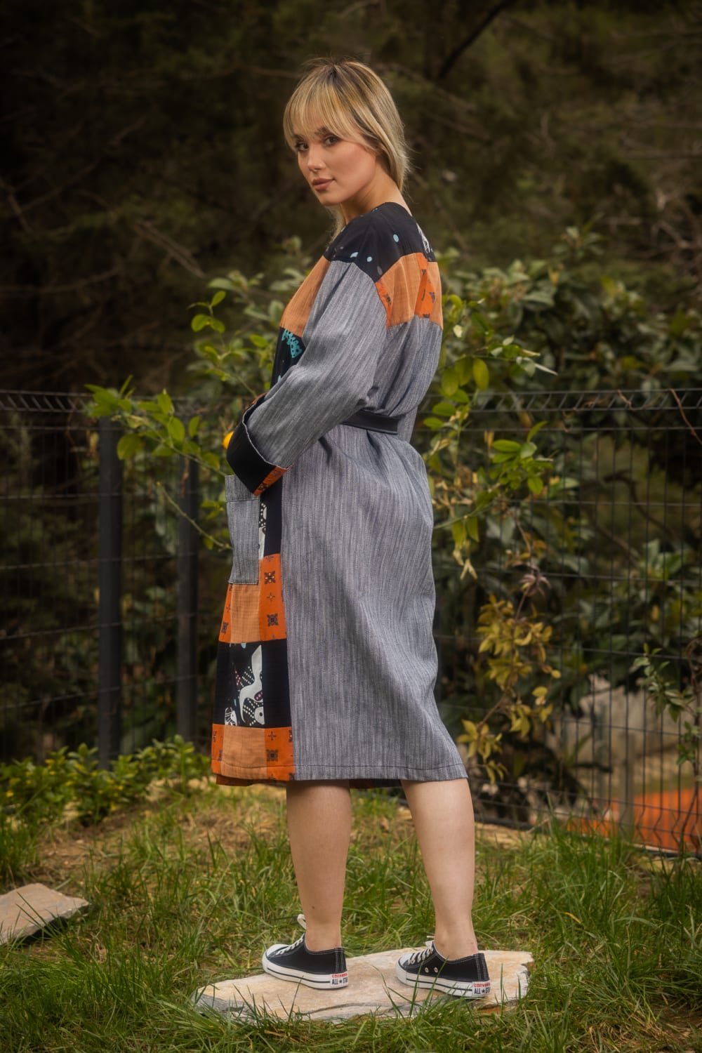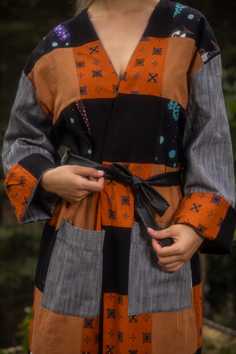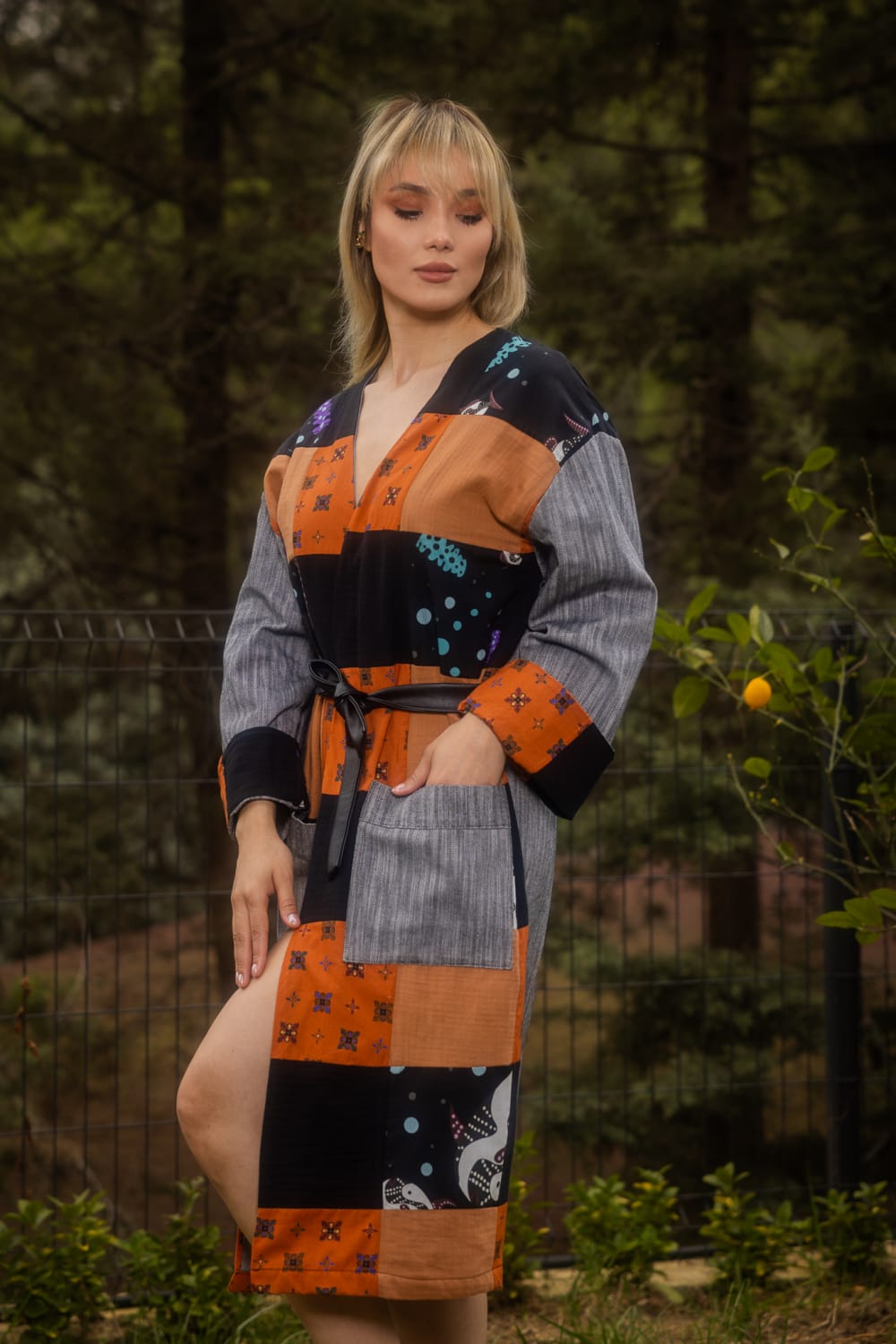Django Patch Uzun CeketDesenler, Sanatçı Defne Camcıoğlu’nun eserlerinden oluşturulmuştur,Viskon karışımlıdır, kimono silüetindir,Ürün, dökümlü ve yumuşak dokulu viskon karışımlı kumaştan üretilmiştir,V yaka ve kuşal detaylı olan ceket patch birleşimleri ile şık bir görünüm sunmkatadır.BAKIM ÖNERİLERİ:30 derecede yıkama yapılabilir,Ağartıcı kullanılamaz,Makinede kurutmayınız.S BedenGöğüs: 58 cmBoy: 120 cmM BedenGöğüs: 64 cmBoy: 120