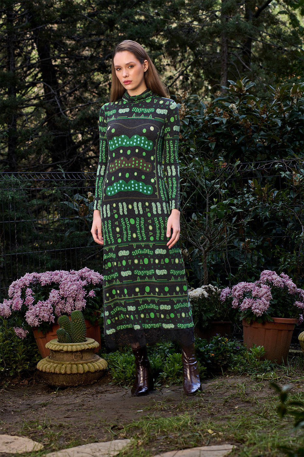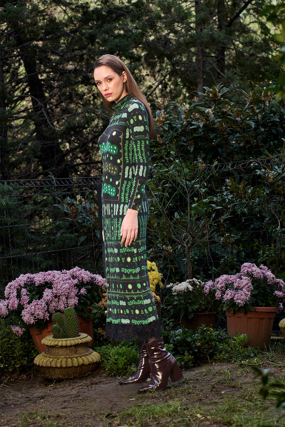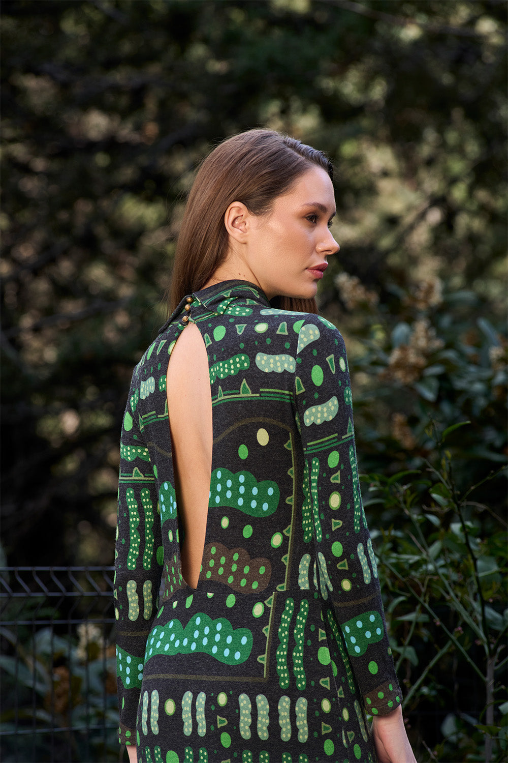 Desenler sanatçı Defne Camcıoğlu'nun resimlerden oluşmuştur,%82 Viskon, %13 Akrilik, %5 Elastan içeren örme bir kumaştır,Kumaş fırçalı/tüylü sıcak bir tuşeye sahiptir,Desenler dijital baskı yöntemi ile basılmıştır,Ürünler likralı, esnek kumaş yapısının uygunluğu gereği birleşik beden olarak üretilmiştir; S/M: 36-38 M/L: 38-40 bedenlerini karşılamaktadır,Bisiklet yaka olan elbise ucunda bulunan dantel detayı ile şık bir görünüm sunmaktadır.