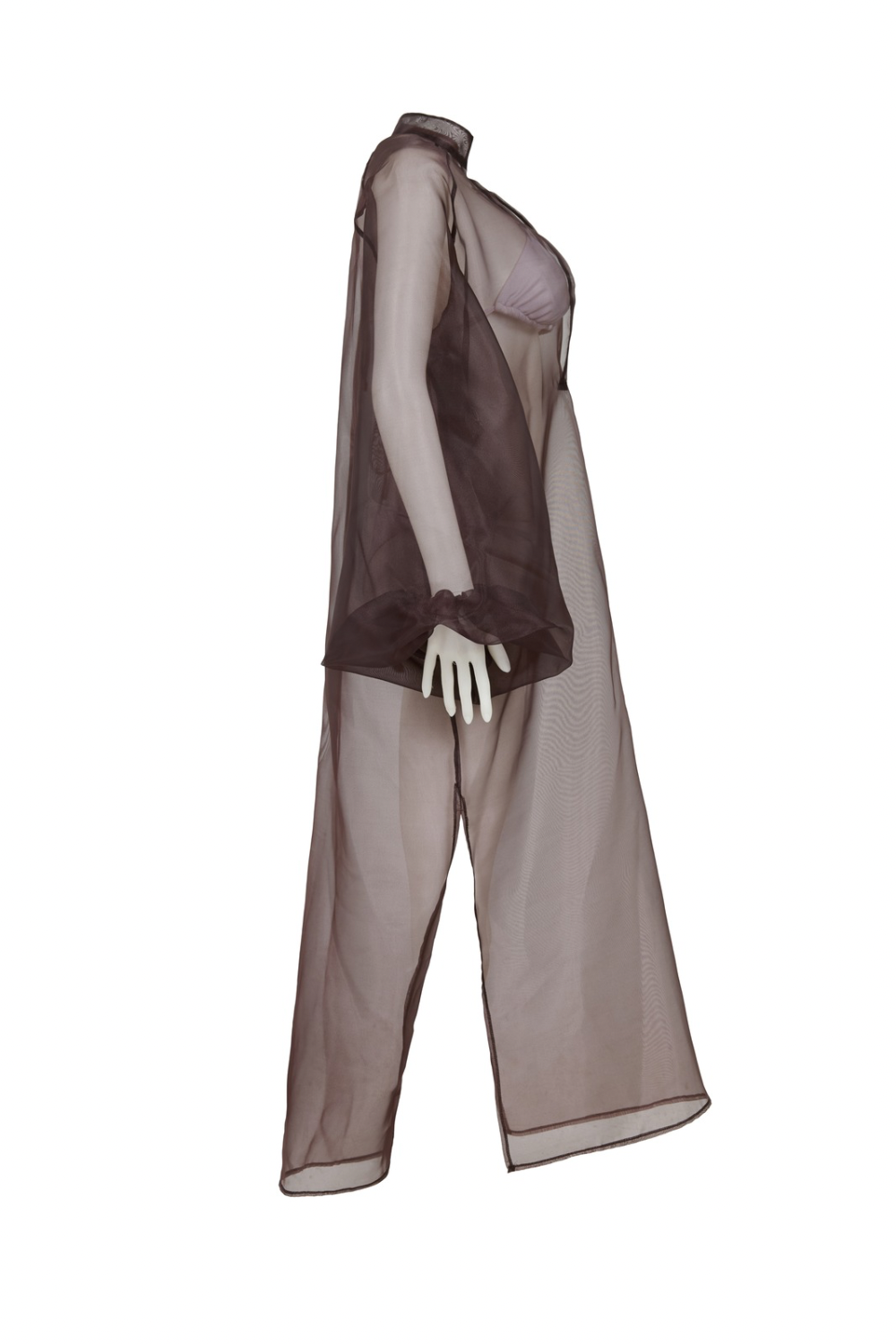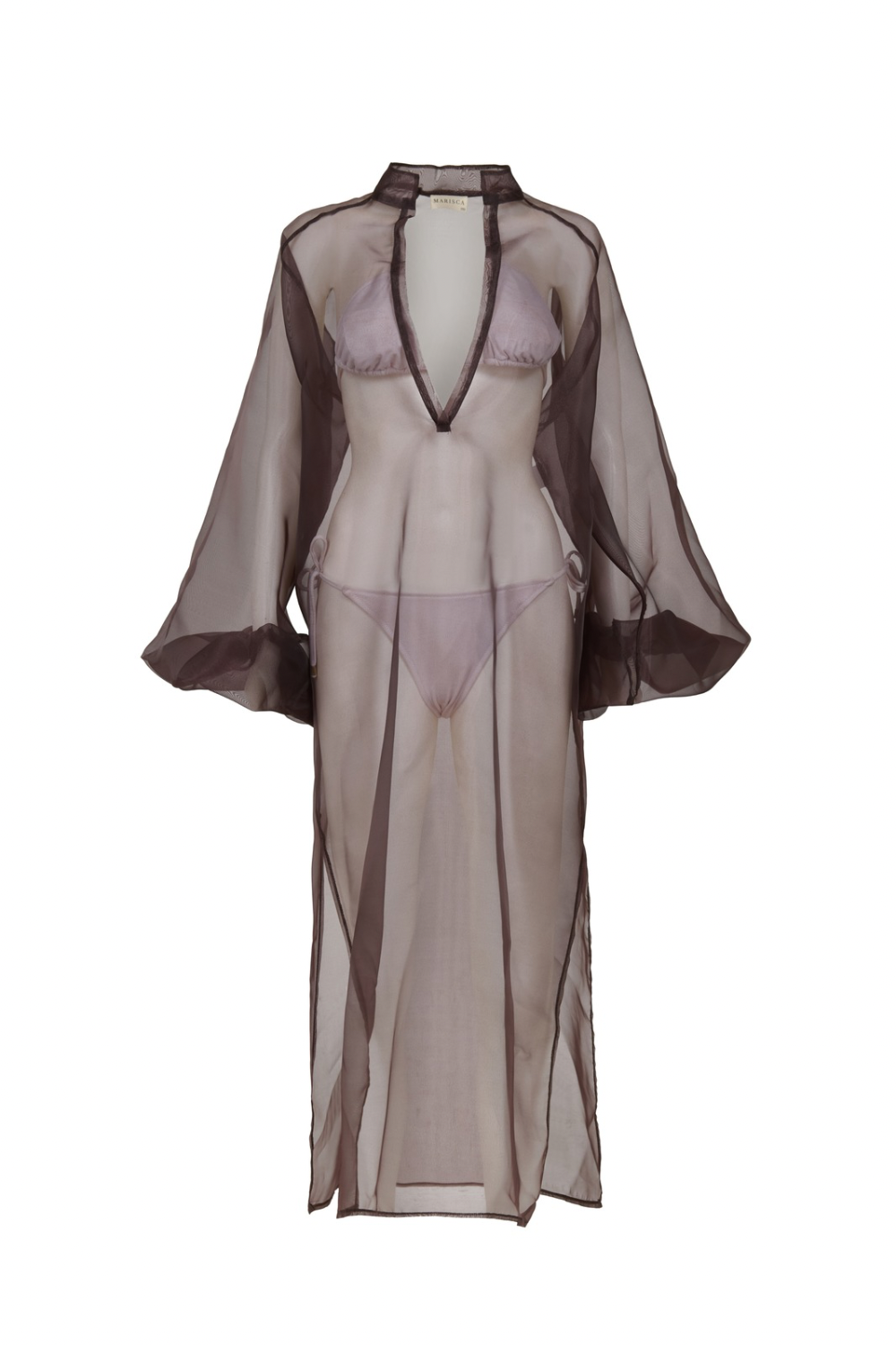 With its shimmering brown tone and airy, semi-sheer fabric, it effortlessly balances elegance and sensuality — perfect for layering over swimwear or styling for a summer night out.